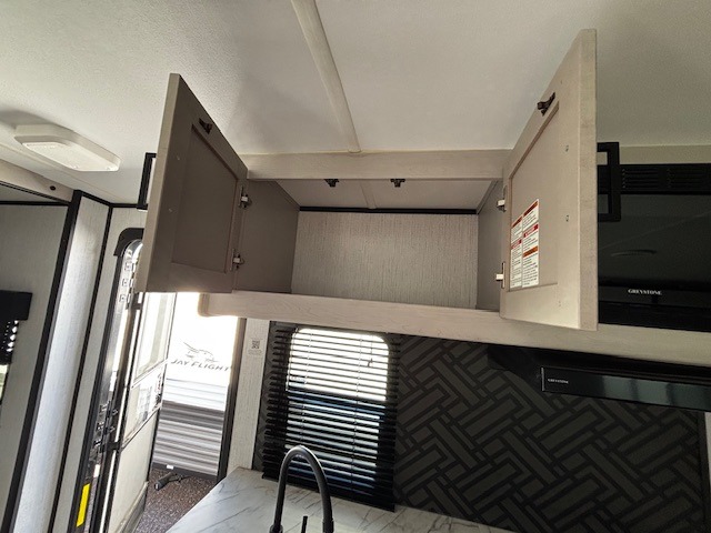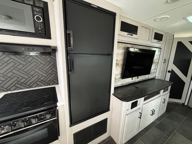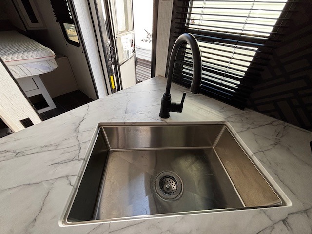 The kitchen is ready for your favorite camp meals, featuring stainless steel appliances, a three-burner cooktop, oven, microwave, refrigerator, and a large corner pantry for all your dry goods. Infinity edge countertops and a stainless steel undermount sink add a modern touch to your culinary space.