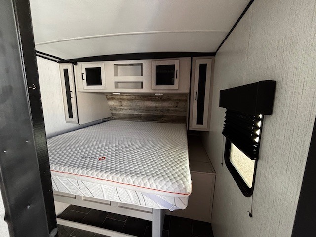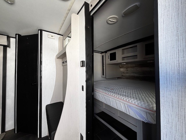 At the front of the trailer, you’ll find a king-size bed in a private bedroom with wardrobes and overhead storage—your own comfortable retreat after a day of adventure.