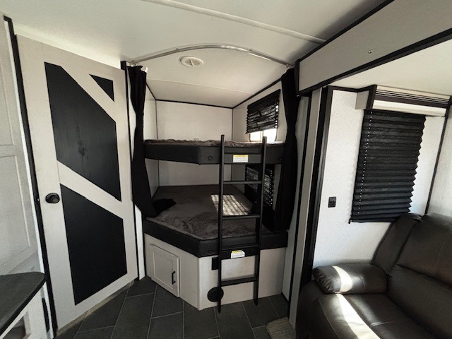 The rear private bunk area features queen-size bunk beds, giving the kids or guests their own space.
