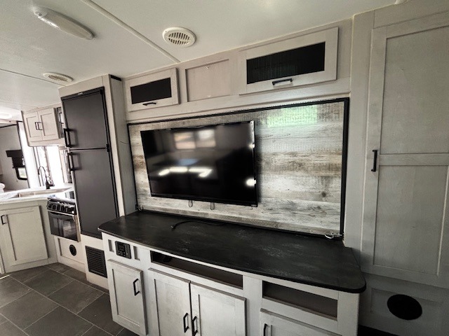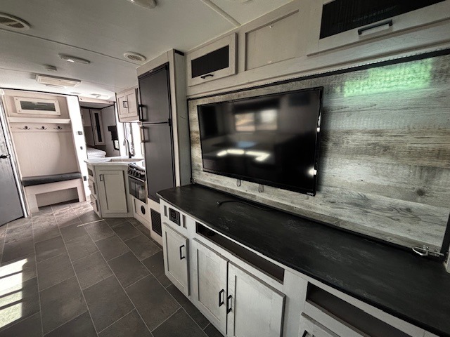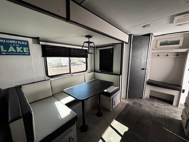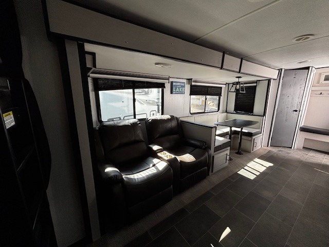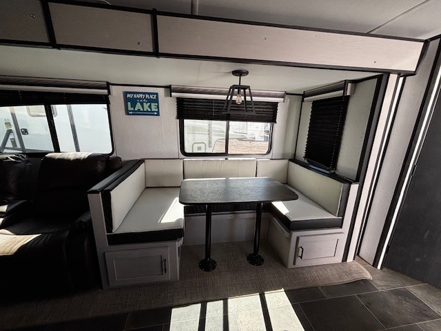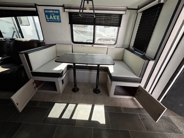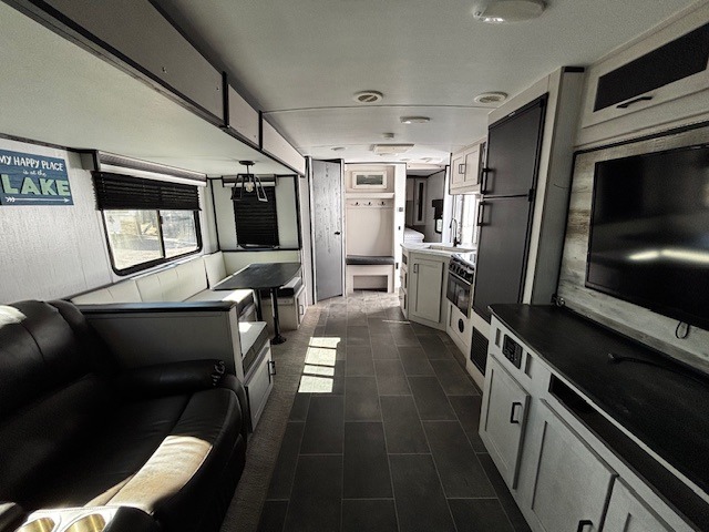 The central living space is warm and inviting, with a large U-shaped dinette and a comfortable sofa, both offering extra sleeping options. The entertainment center is perfectly positioned for easy viewing from the seating area—ideal for cozy movie nights or rainy-day downtime.