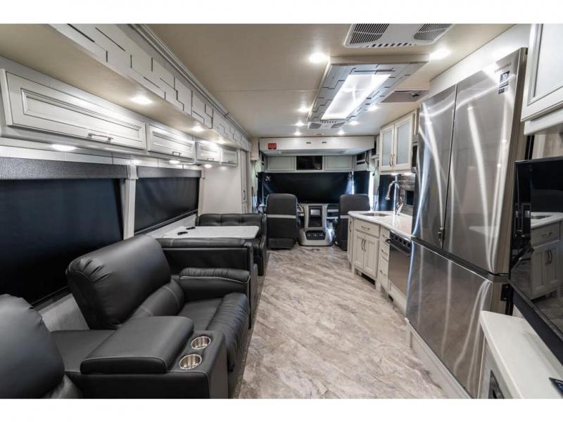 Whether you travel to meet friends at an RV resort or travel to see family, you will love everything about this coach from the driver and passenger seats that are comfortable and include a reclining back and swivel function, plus the passenger even has a manual footrest and workstation. The interior is spacious with a large main slide that offers a sofa sleeper with end table and a booth dinette plus a pantry to hold all the goodies. You can watch the 40" LED TV with fireplace below while the cook makes a meal using the kitchen amenities including the convection microwave and residential refrigerator. The rear bedroom gives you a king bed slide with CPAP storage above, a bedroom 32" LED TV, and two wardrobes plus a dresser to hold all your clothing. There is much more to love, hit the road today!