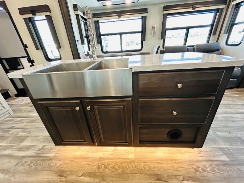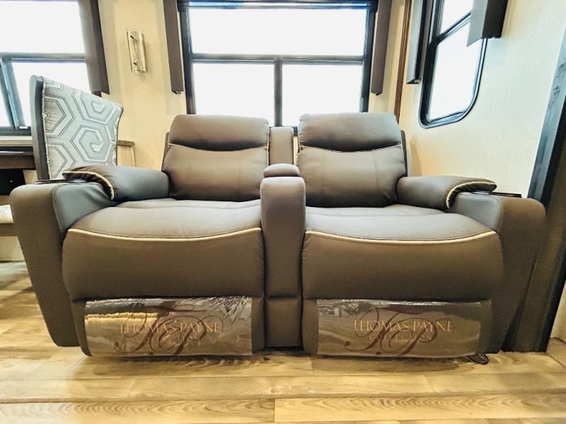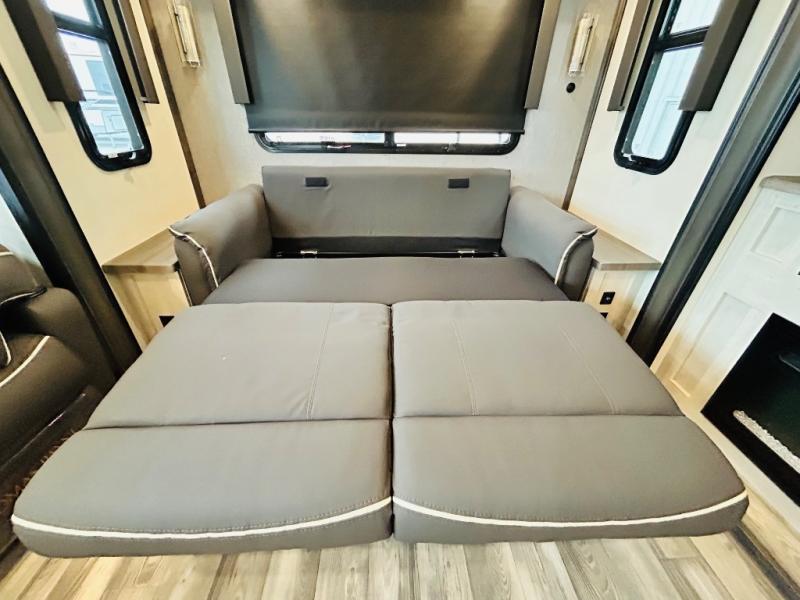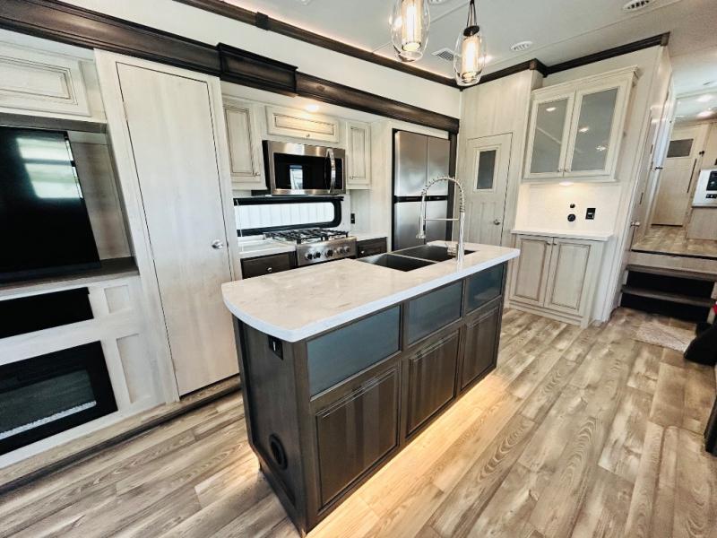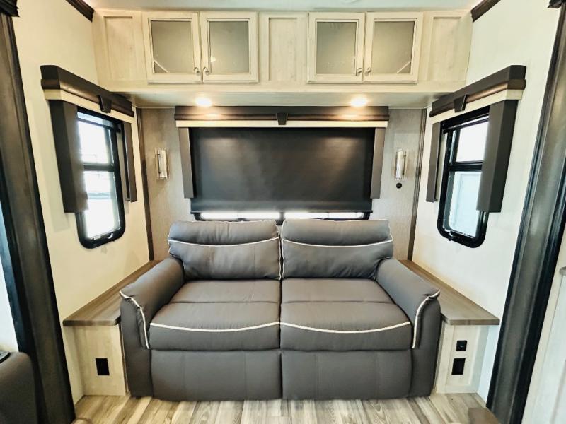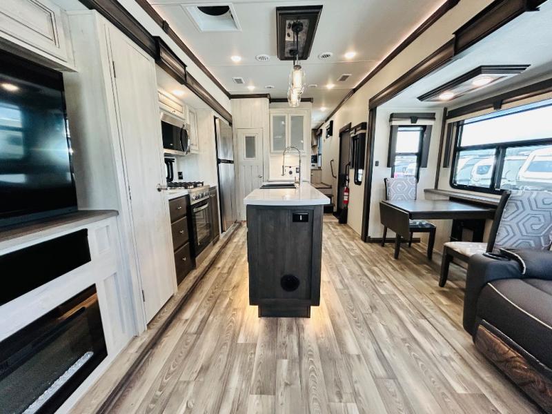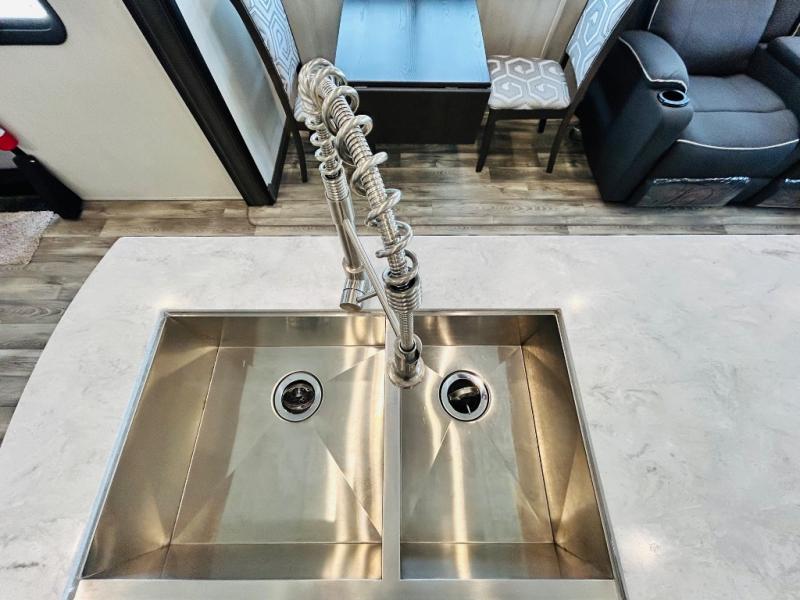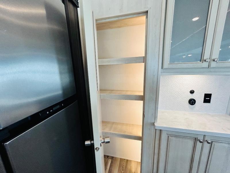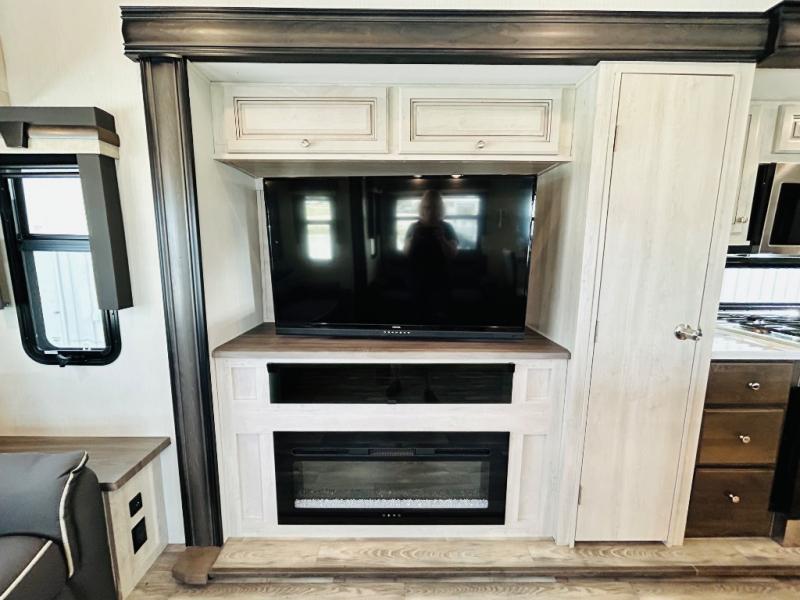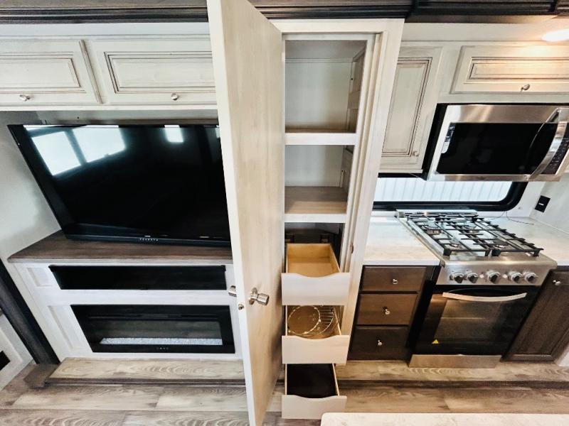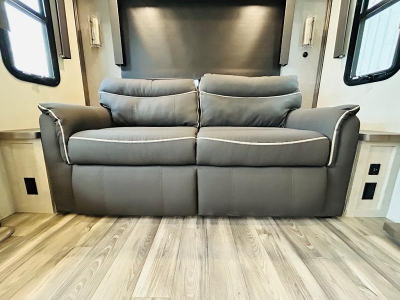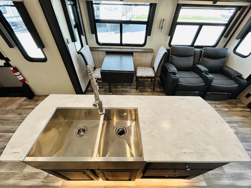 Watch the big game at the exterior 32" TV with this fifth wheel! Relax in true comfort on either the rear hide-a-bed sofa or the theater seating across from the entertainment center with a fireplace. The chef will love using the kitchen island for meal prep and clean up will be a breeze with the farmhouse 60/40 stainless steel sink with a high rise, pull out bullet kitchen faucet. You can store your favorite snacks in the two walk-in pantries and your dishes in the hutch. Freshen up each morning in the full bathroom with the 48" x 30" one piece molded fiberglass shower with a seat and skylight above for added natural lighting, plus there is a dual sink vanity for two to get ready at once. The front private bedroom has a king bed slide for a good night's rest, a bench next to a dresser to sit while putting your shoes on, and a front wardrobe with shelves and an area prepped to add an optional washer and dryer!