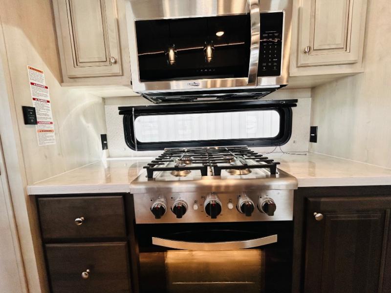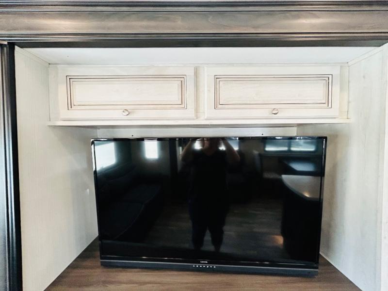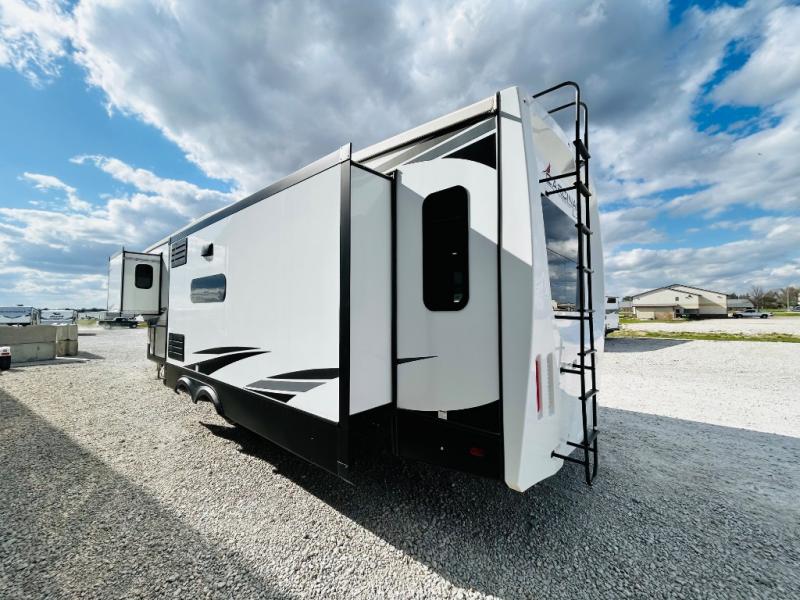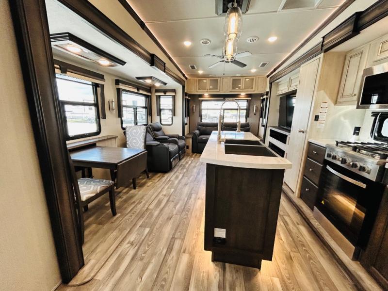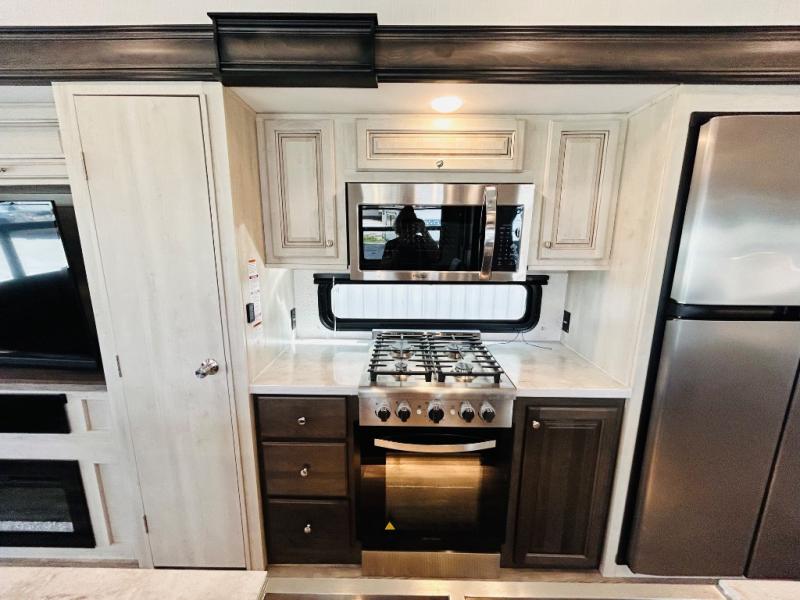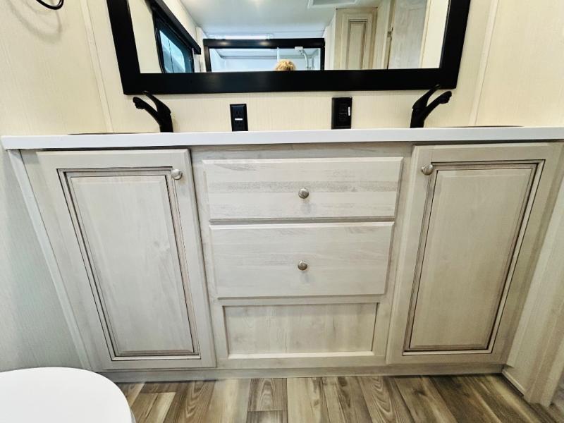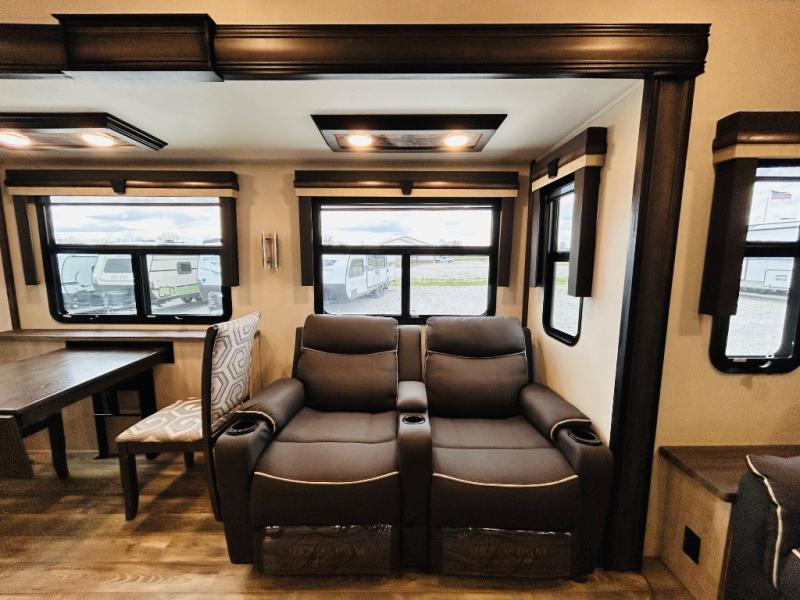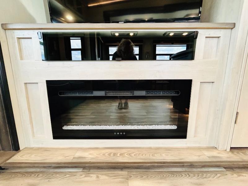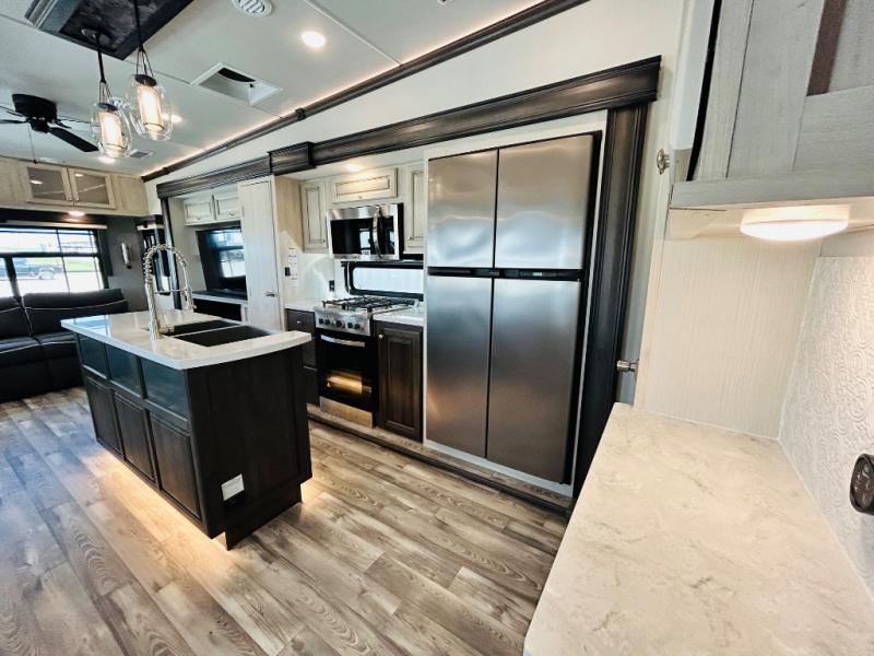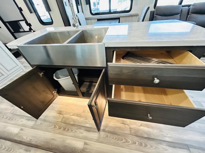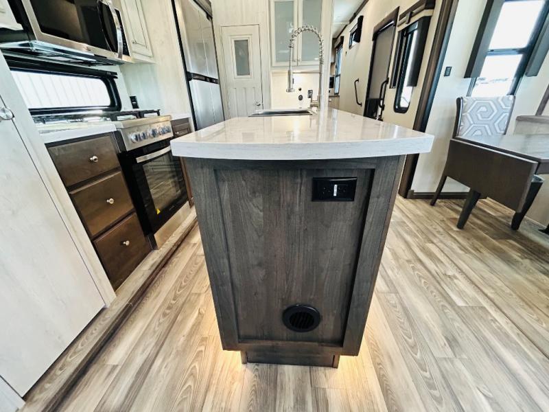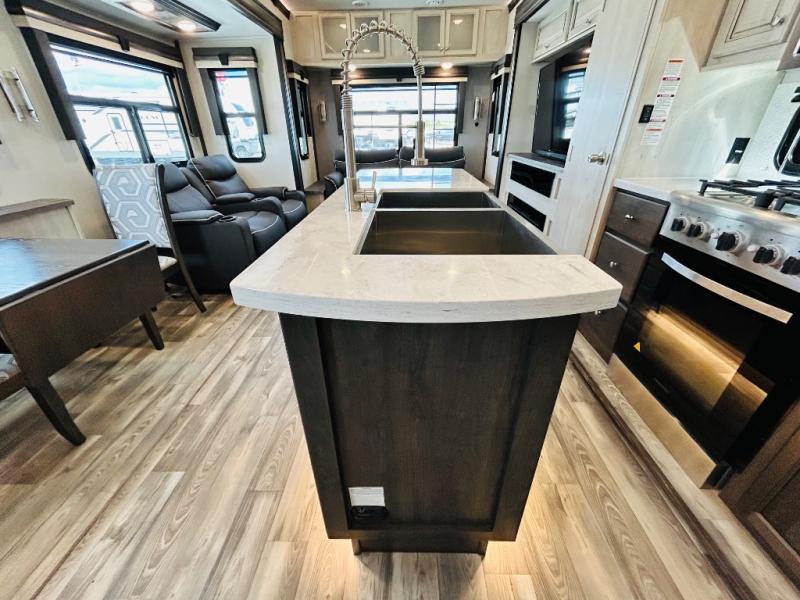 Watch the big game at the exterior 32" TV with this fifth wheel! Relax in true comfort on either the rear hide-a-bed sofa or the theater seating across from the entertainment center with a fireplace. The chef will love using the kitchen island for meal prep and clean up will be a breeze with the farmhouse 60/40 stainless steel sink with a high rise, pull out bullet kitchen faucet. You can store your favorite snacks in the two walk-in pantries and your dishes in the hutch. Freshen up each morning in the full bathroom with the 48" x 30" one piece molded fiberglass shower with a seat and skylight above for added natural lighting, plus there is a dual sink vanity for two to get ready at once. The front private bedroom has a king bed slide for a good night's rest, a bench next to a dresser to sit while putting your shoes on, and a front wardrobe with shelves and an area prepped to add an optional washer and dryer!