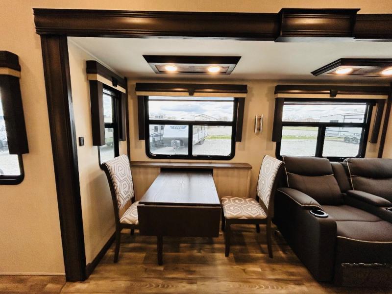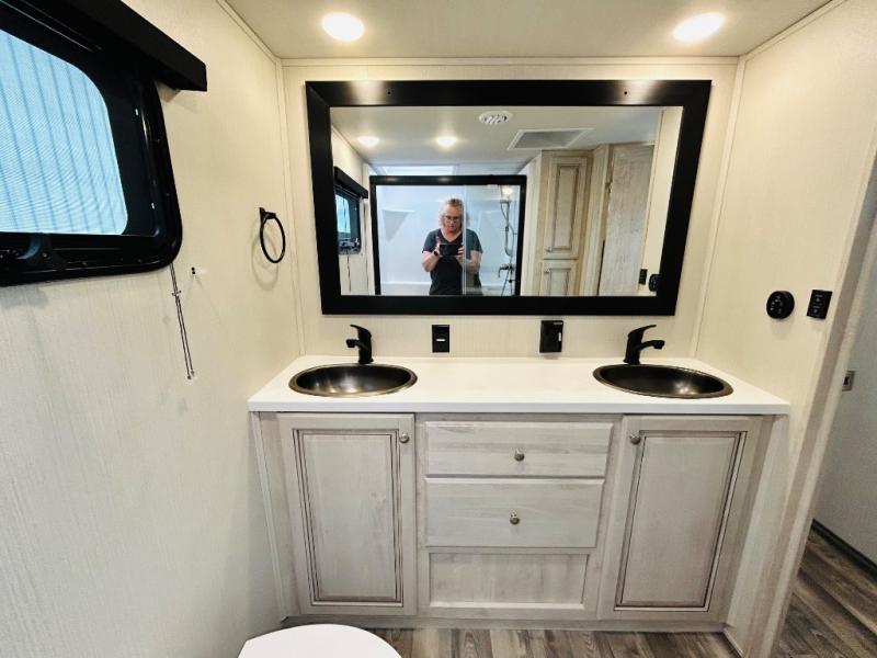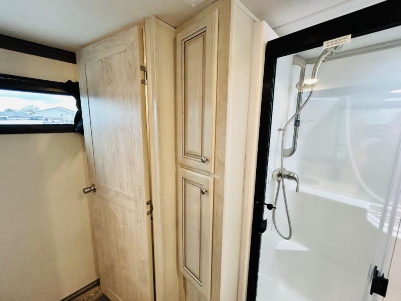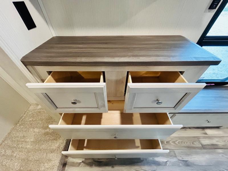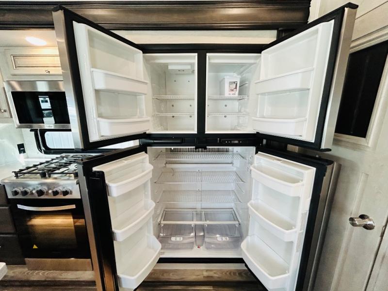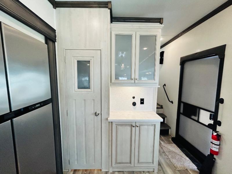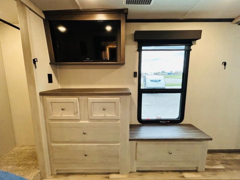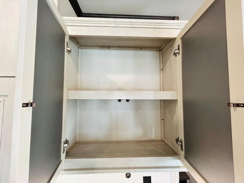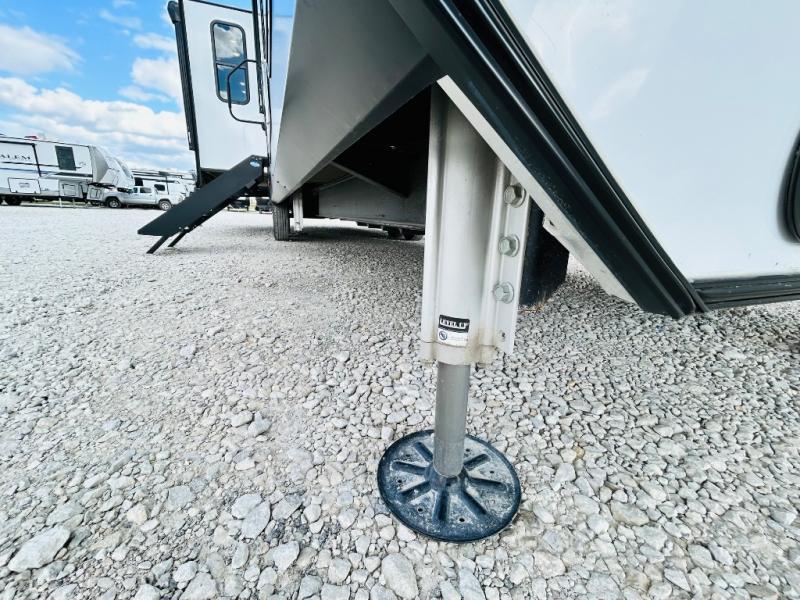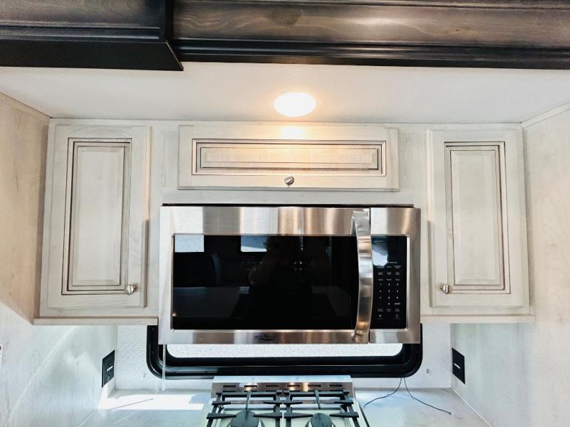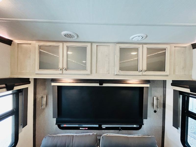 Watch the big game at the exterior 32" TV with this fifth wheel! Relax in true comfort on either the rear hide-a-bed sofa or the theater seating across from the entertainment center with a fireplace. The chef will love using the kitchen island for meal prep and clean up will be a breeze with the farmhouse 60/40 stainless steel sink with a high rise, pull out bullet kitchen faucet. You can store your favorite snacks in the two walk-in pantries and your dishes in the hutch. Freshen up each morning in the full bathroom with the 48" x 30" one piece molded fiberglass shower with a seat and skylight above for added natural lighting, plus there is a dual sink vanity for two to get ready at once. The front private bedroom has a king bed slide for a good night's rest, a bench next to a dresser to sit while putting your shoes on, and a front wardrobe with shelves and an area prepped to add an optional washer and dryer!