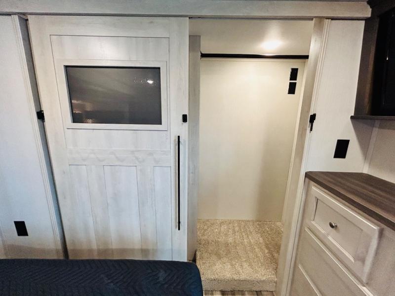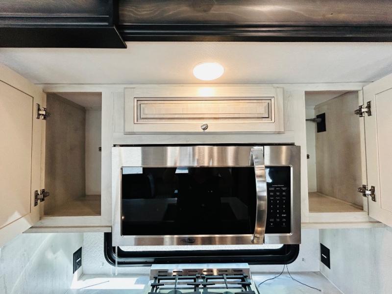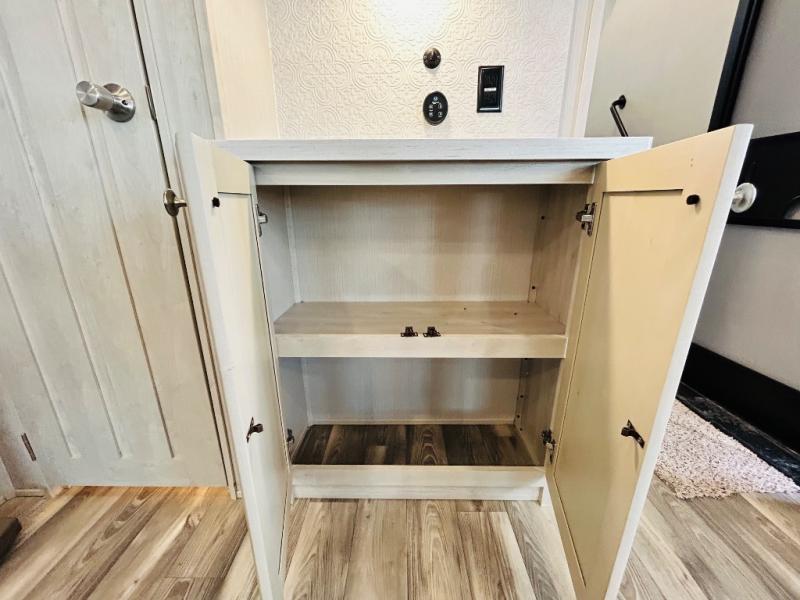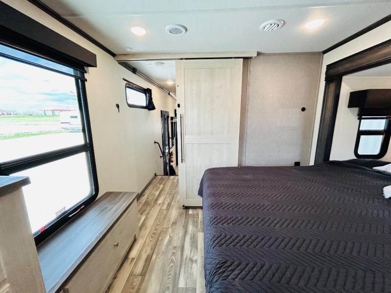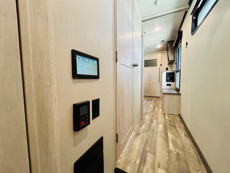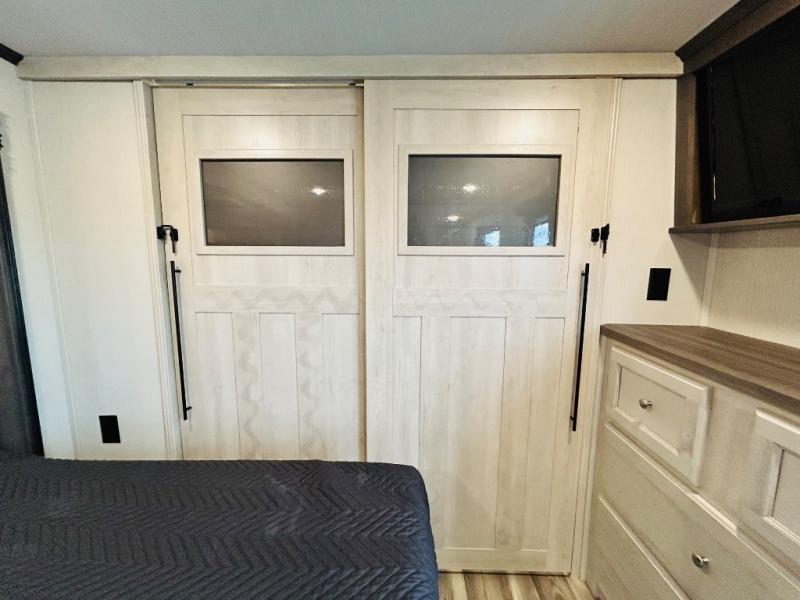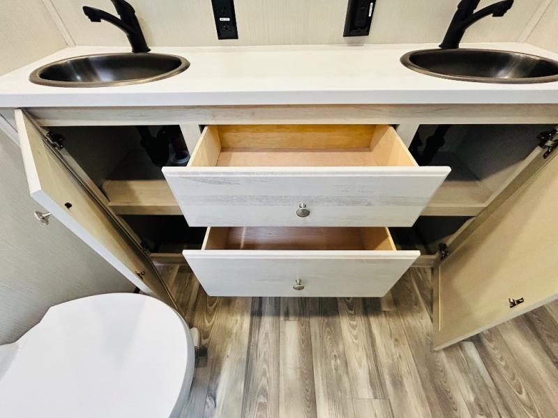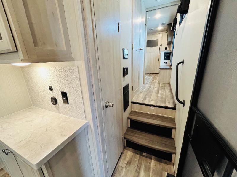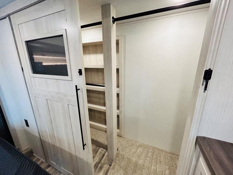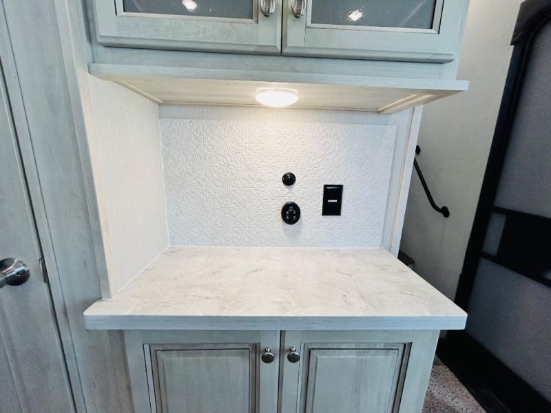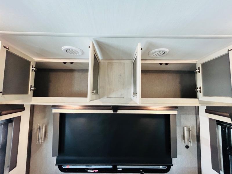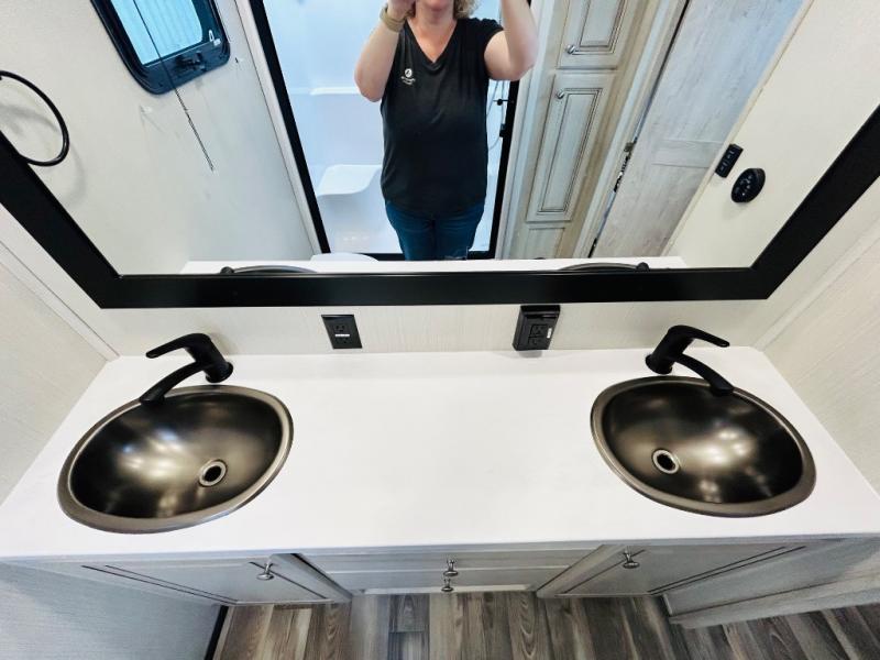 Watch the big game at the exterior 32" TV with this fifth wheel! Relax in true comfort on either the rear hide-a-bed sofa or the theater seating across from the entertainment center with a fireplace. The chef will love using the kitchen island for meal prep and clean up will be a breeze with the farmhouse 60/40 stainless steel sink with a high rise, pull out bullet kitchen faucet. You can store your favorite snacks in the two walk-in pantries and your dishes in the hutch. Freshen up each morning in the full bathroom with the 48" x 30" one piece molded fiberglass shower with a seat and skylight above for added natural lighting, plus there is a dual sink vanity for two to get ready at once. The front private bedroom has a king bed slide for a good night's rest, a bench next to a dresser to sit while putting your shoes on, and a front wardrobe with shelves and an area prepped to add an optional washer and dryer!