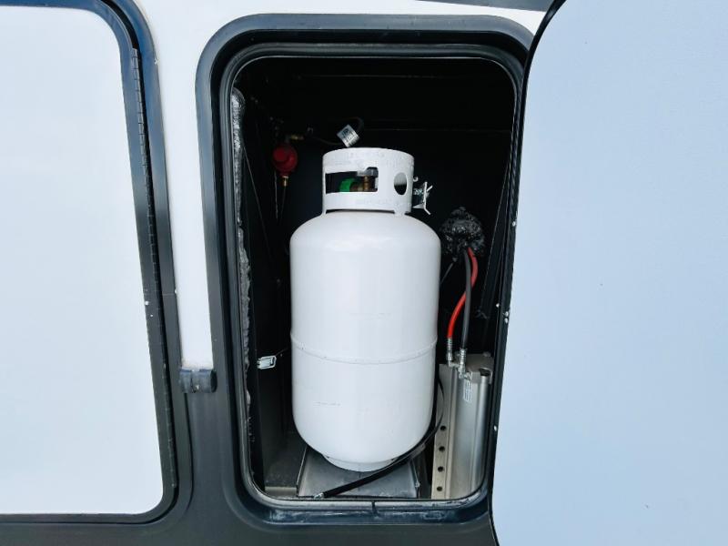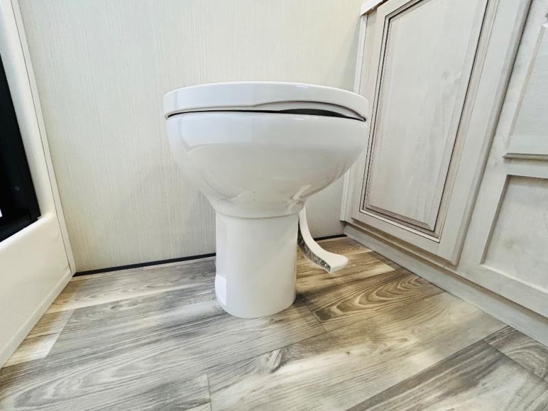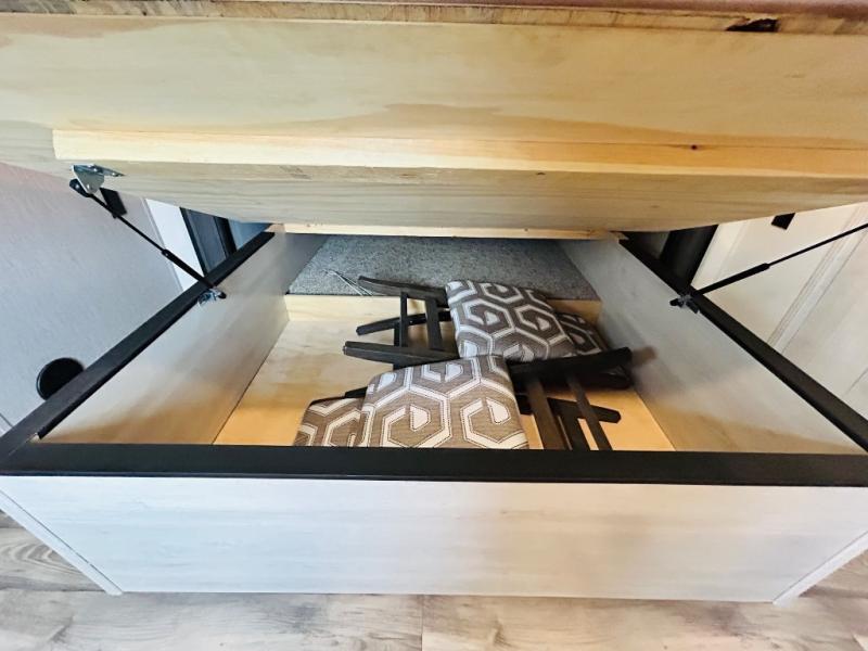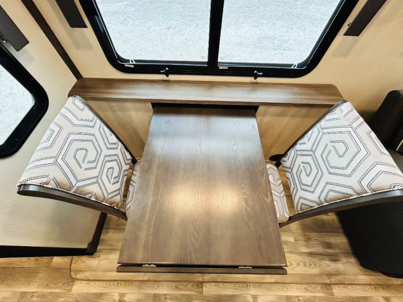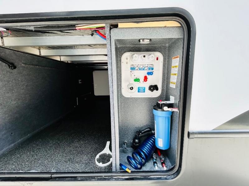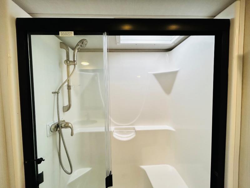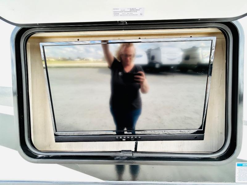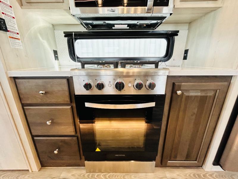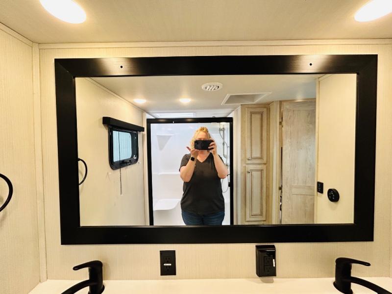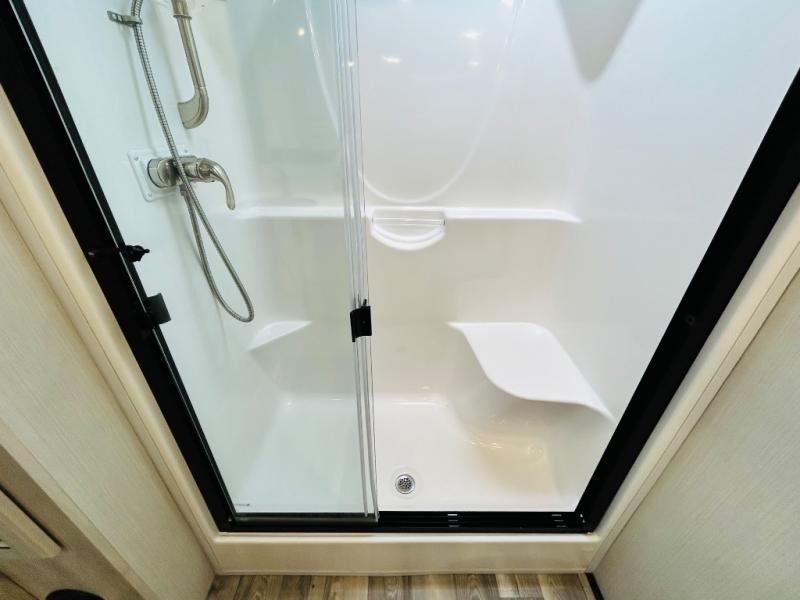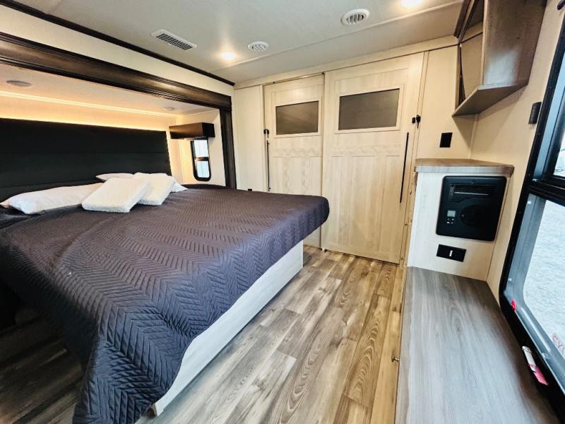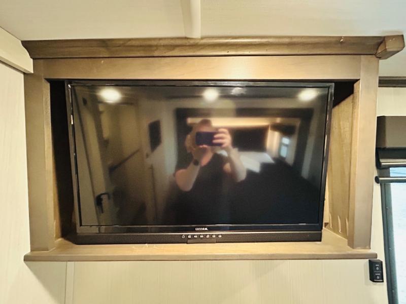 Watch the big game at the exterior 32" TV with this fifth wheel! Relax in true comfort on either the rear hide-a-bed sofa or the theater seating across from the entertainment center with a fireplace. The chef will love using the kitchen island for meal prep and clean up will be a breeze with the farmhouse 60/40 stainless steel sink with a high rise, pull out bullet kitchen faucet. You can store your favorite snacks in the two walk-in pantries and your dishes in the hutch. Freshen up each morning in the full bathroom with the 48" x 30" one piece molded fiberglass shower with a seat and skylight above for added natural lighting, plus there is a dual sink vanity for two to get ready at once. The front private bedroom has a king bed slide for a good night's rest, a bench next to a dresser to sit while putting your shoes on, and a front wardrobe with shelves and an area prepped to add an optional washer and dryer!