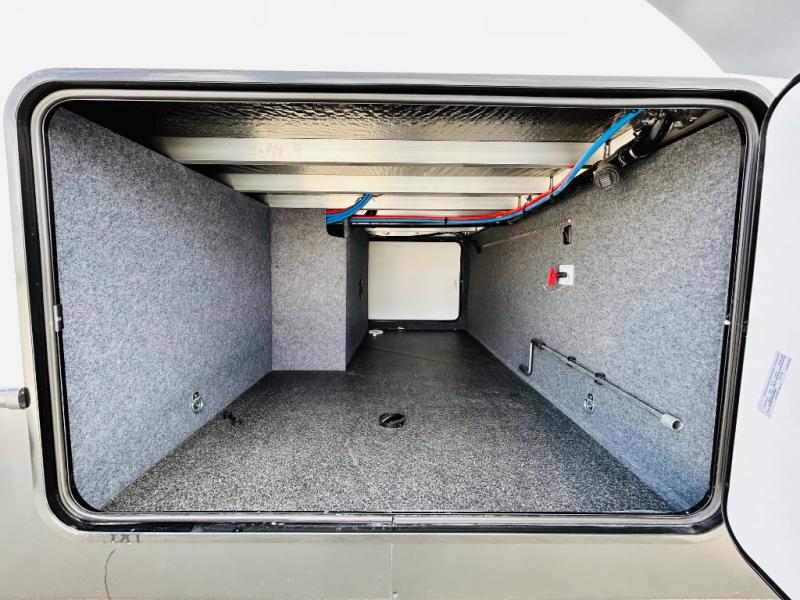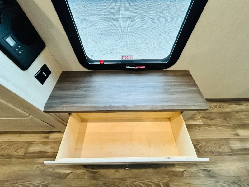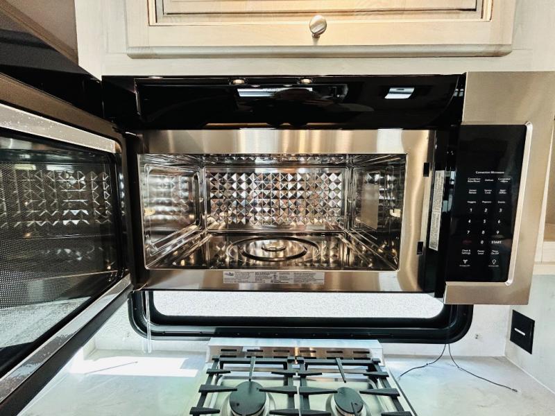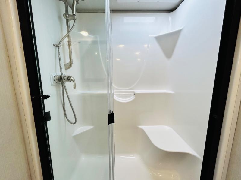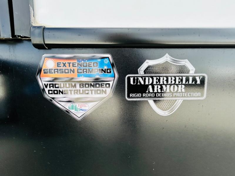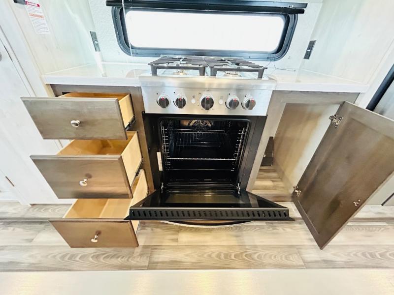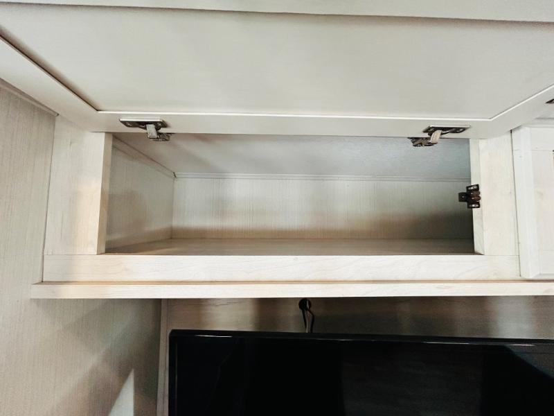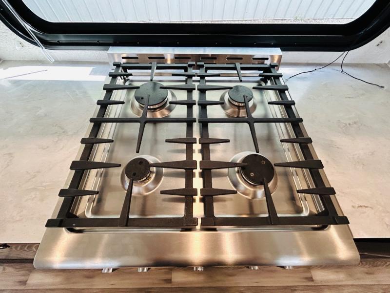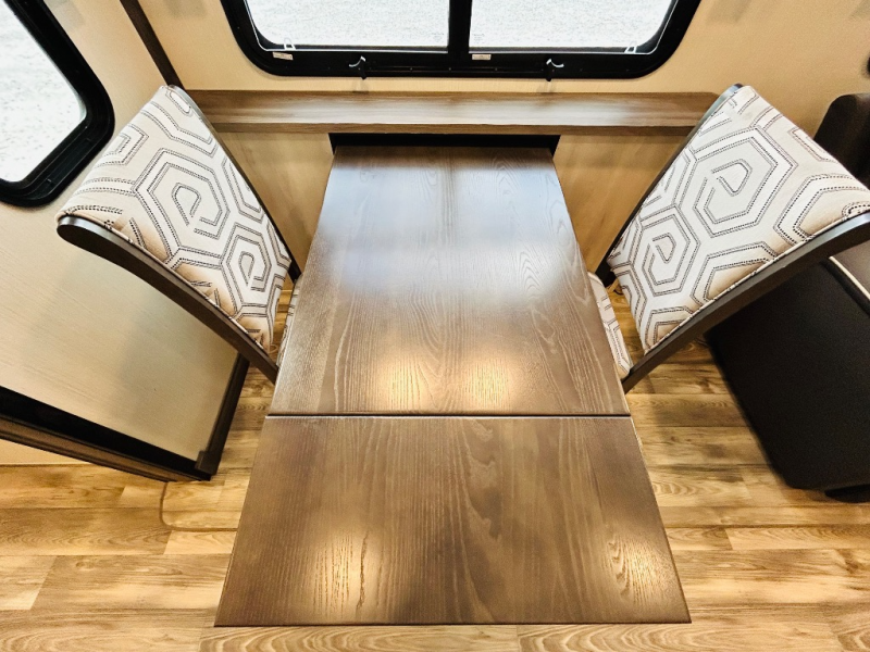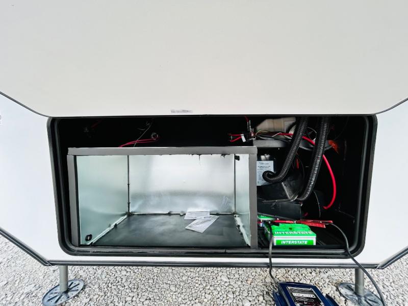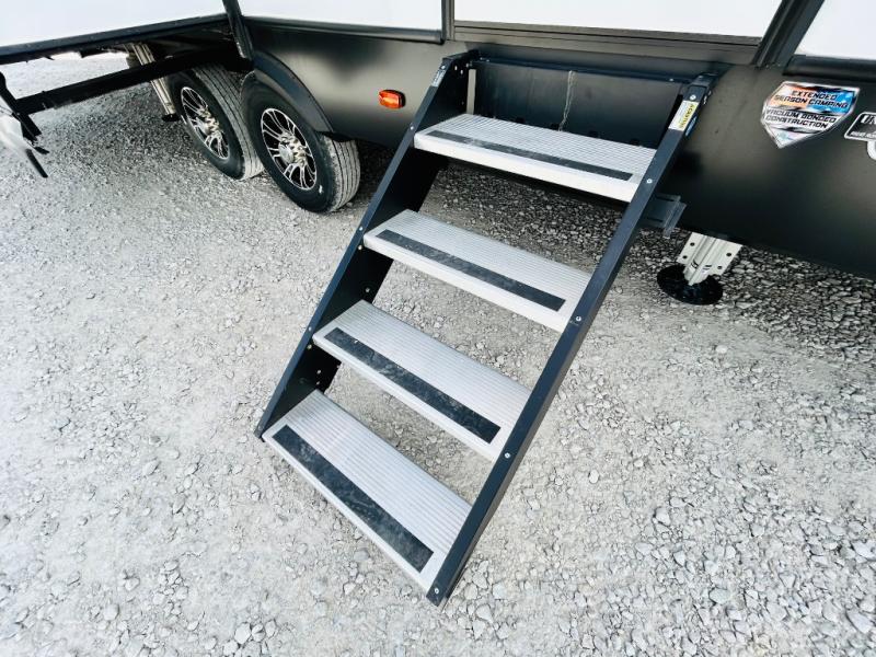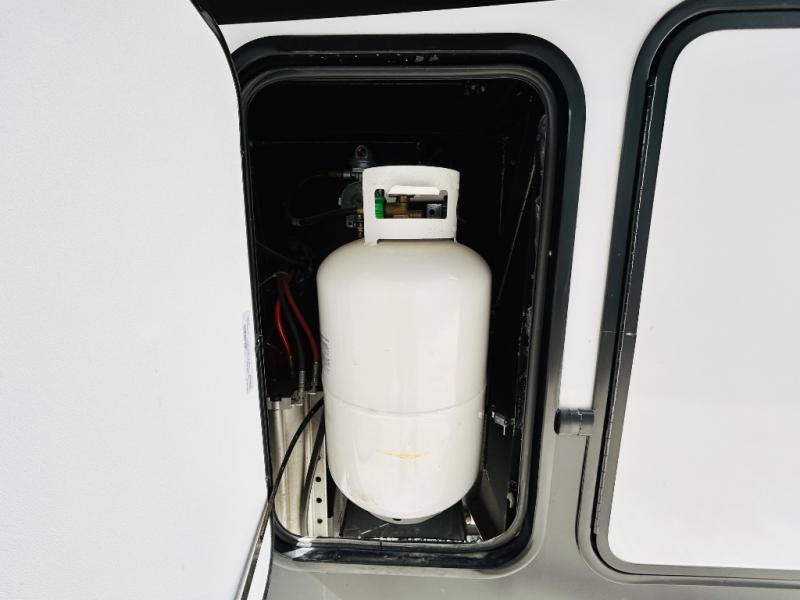 Watch the big game at the exterior 32" TV with this fifth wheel! Relax in true comfort on either the rear hide-a-bed sofa or the theater seating across from the entertainment center with a fireplace. The chef will love using the kitchen island for meal prep and clean up will be a breeze with the farmhouse 60/40 stainless steel sink with a high rise, pull out bullet kitchen faucet. You can store your favorite snacks in the two walk-in pantries and your dishes in the hutch. Freshen up each morning in the full bathroom with the 48" x 30" one piece molded fiberglass shower with a seat and skylight above for added natural lighting, plus there is a dual sink vanity for two to get ready at once. The front private bedroom has a king bed slide for a good night's rest, a bench next to a dresser to sit while putting your shoes on, and a front wardrobe with shelves and an area prepped to add an optional washer and dryer!
