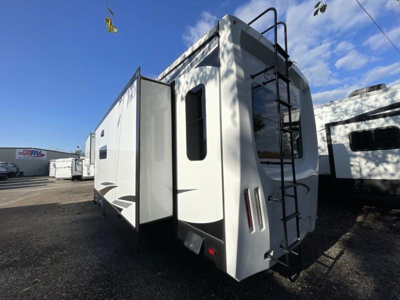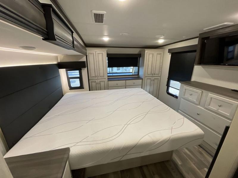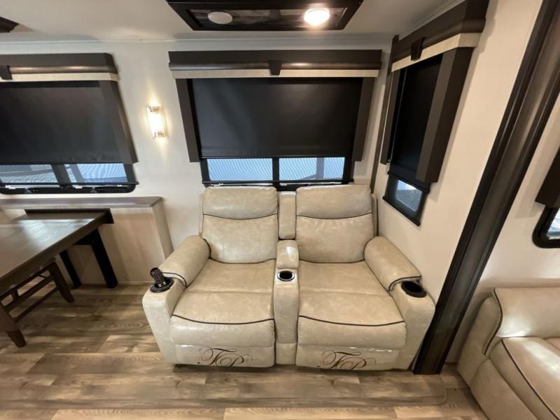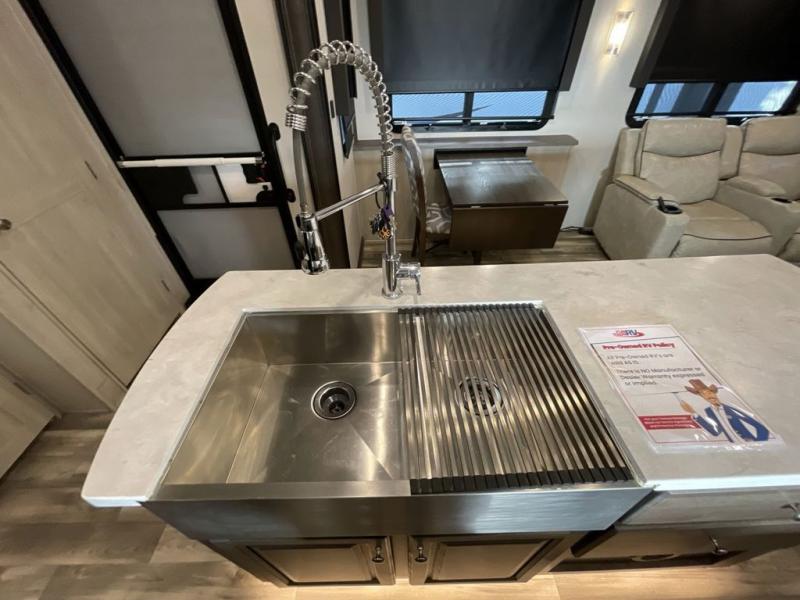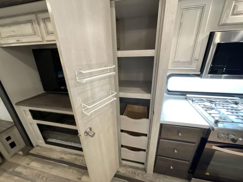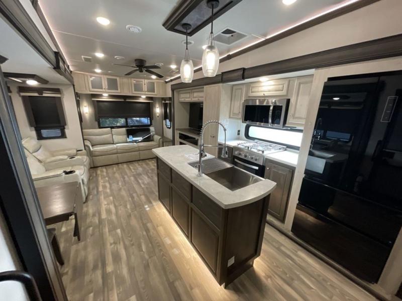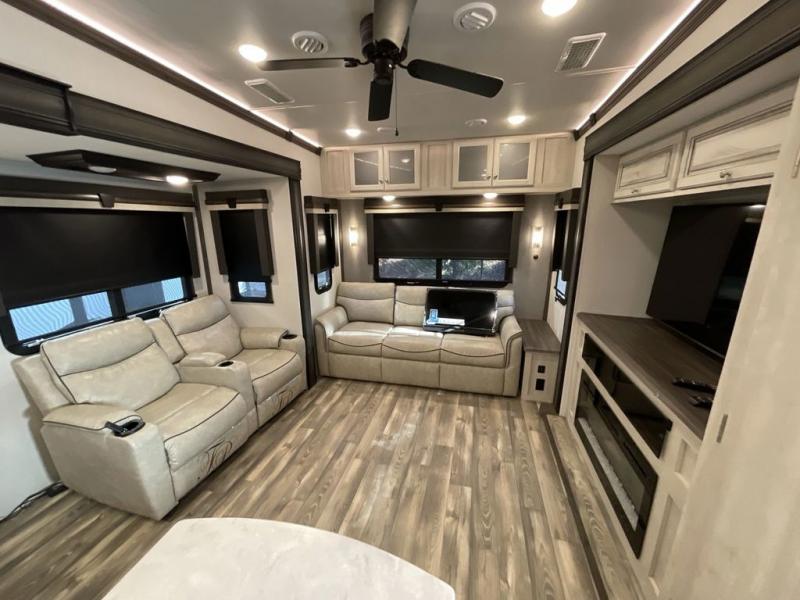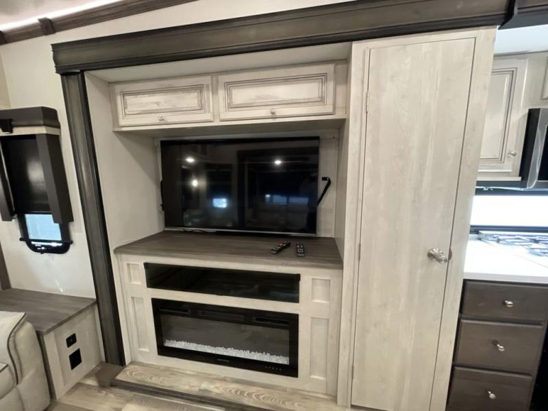 The amount of luxurious features in this fifth wheel is astounding! Starting with the full rear bathroom which has a dual sink vanity for two to get ready at once, a 48" x 30" one piece molded fiberglass shower, overhead cabinets, and a closet that is prepped to add an optional washer and dryer, plus it leads directly into the private bedroom. Inside the bedroom is a king bed slide to lay your head at night across from a dresser with wardrobes on either side of it and a 32" TV to watch your favorite movies in bed. There is a kitchen island to make meal prep easier, a half bathroom in the kitchen for quick restroom breaks, two pantries for snacks, a hutch for your dishes, and a table with chairs slide to comfortably eat your meals. The front living area has a front entertainment center with a fireplace and cabinets, Thomas Payne theater seating with power recline and massage, and opposing tri-fold sofa slides for extra sleeping spaces too. The exterior has multiple pass-through storage areas so you can bring all of your outdoor gear along with you!