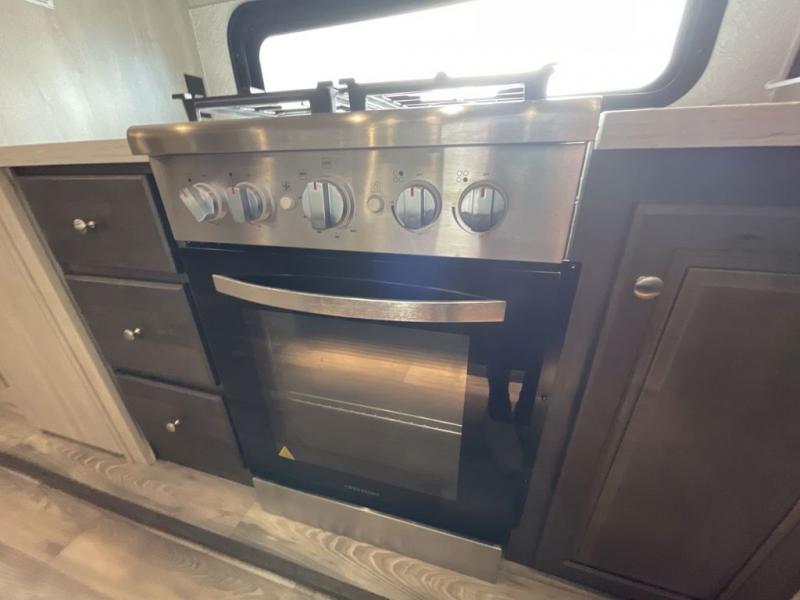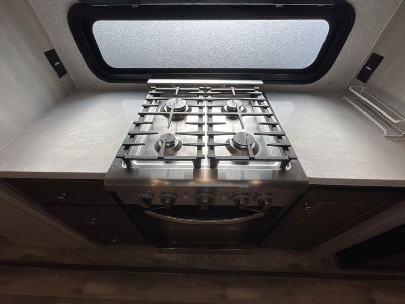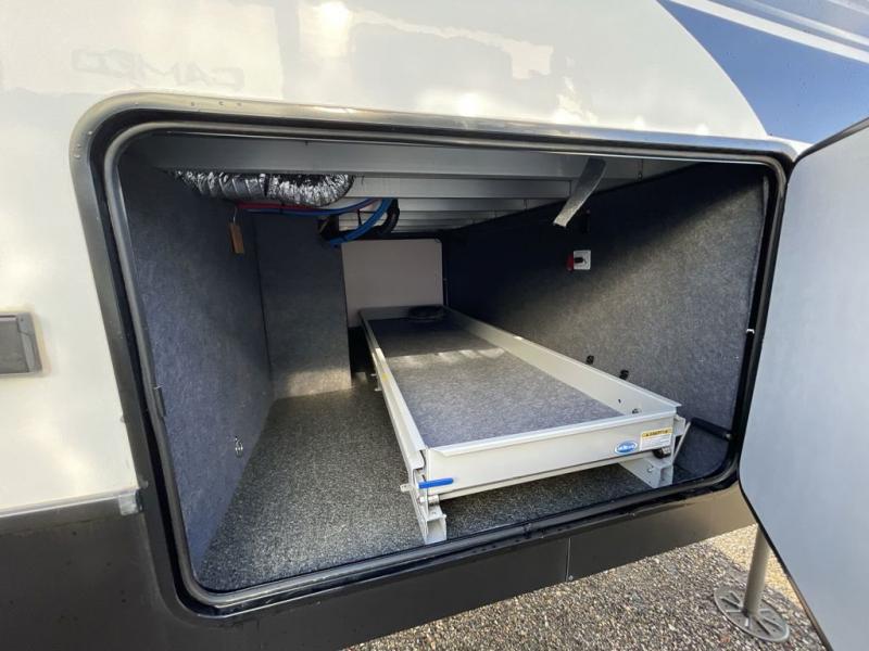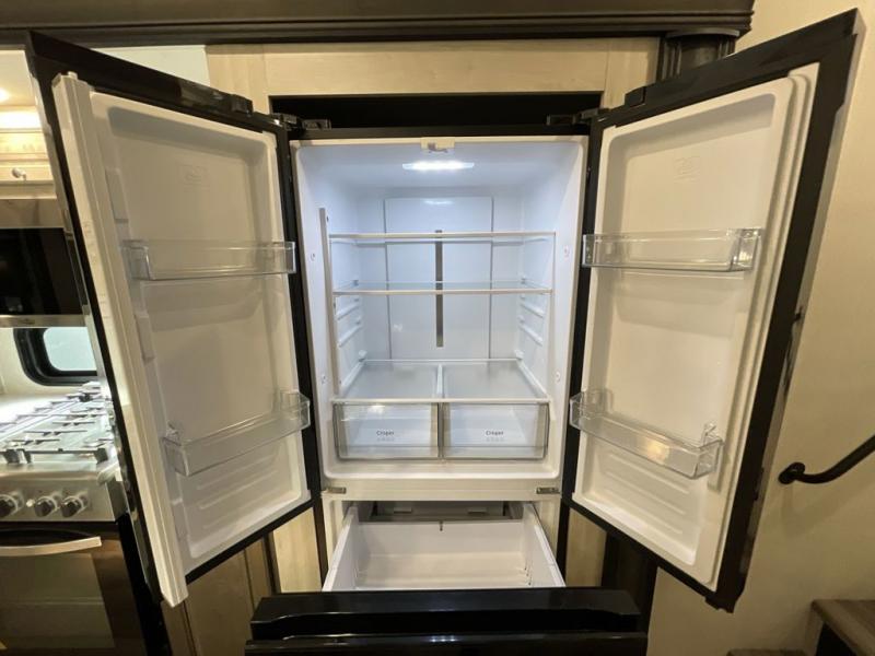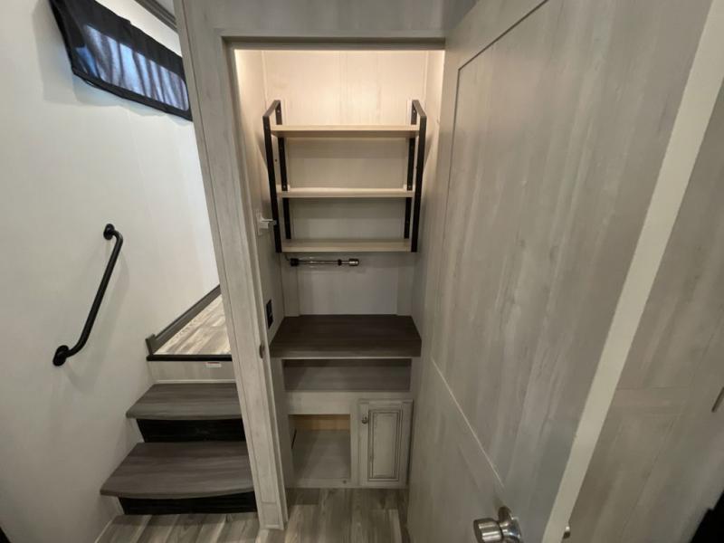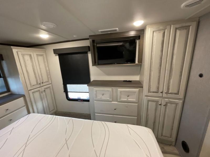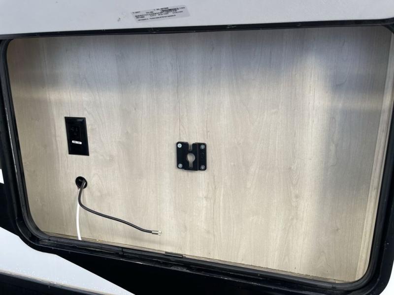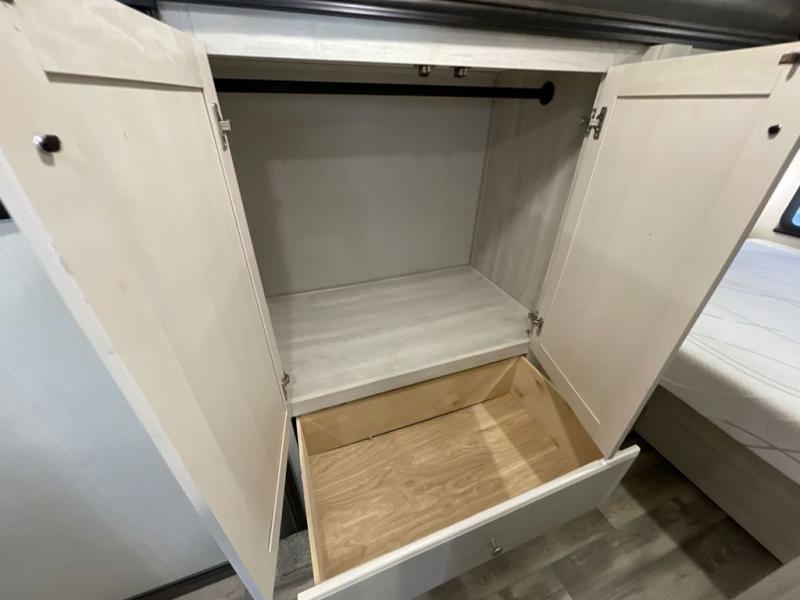 The amount of luxurious features in this fifth wheel is astounding! Starting with the full rear bathroom which has a dual sink vanity for two to get ready at once, a 48" x 30" one piece molded fiberglass shower, overhead cabinets, and a closet that is prepped to add an optional washer and dryer, plus it leads directly into the private bedroom. Inside the bedroom is a king bed slide to lay your head at night across from a dresser with wardrobes on either side of it and a 32" TV to watch your favorite movies in bed. There is a kitchen island to make meal prep easier, a half bathroom in the kitchen for quick restroom breaks, two pantries for snacks, a hutch for your dishes, and a table with chairs slide to comfortably eat your meals. The front living area has a front entertainment center with a fireplace and cabinets, Thomas Payne theater seating with power recline and massage, and opposing tri-fold sofa slides for extra sleeping spaces too. The exterior has multiple pass-through storage areas so you can bring all of your outdoor gear along with you!