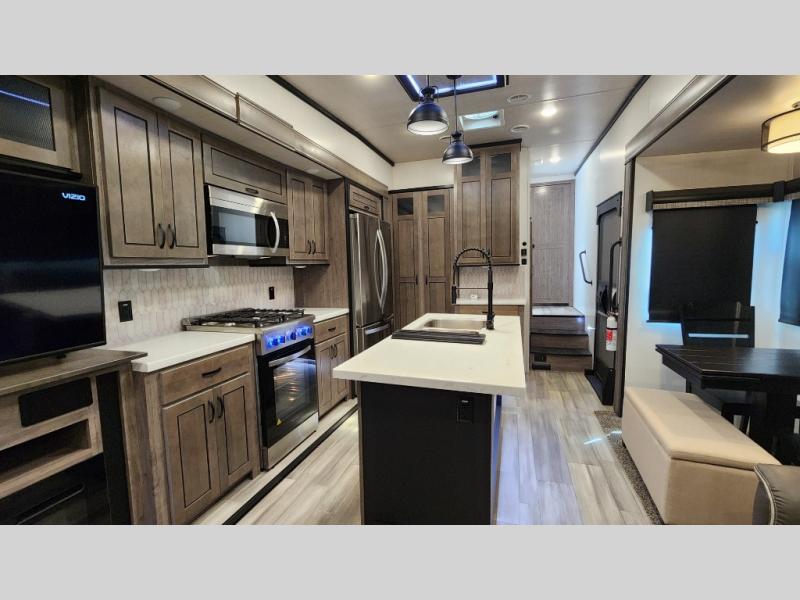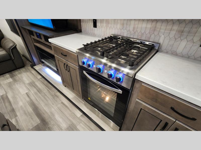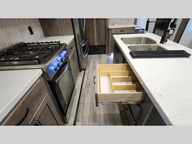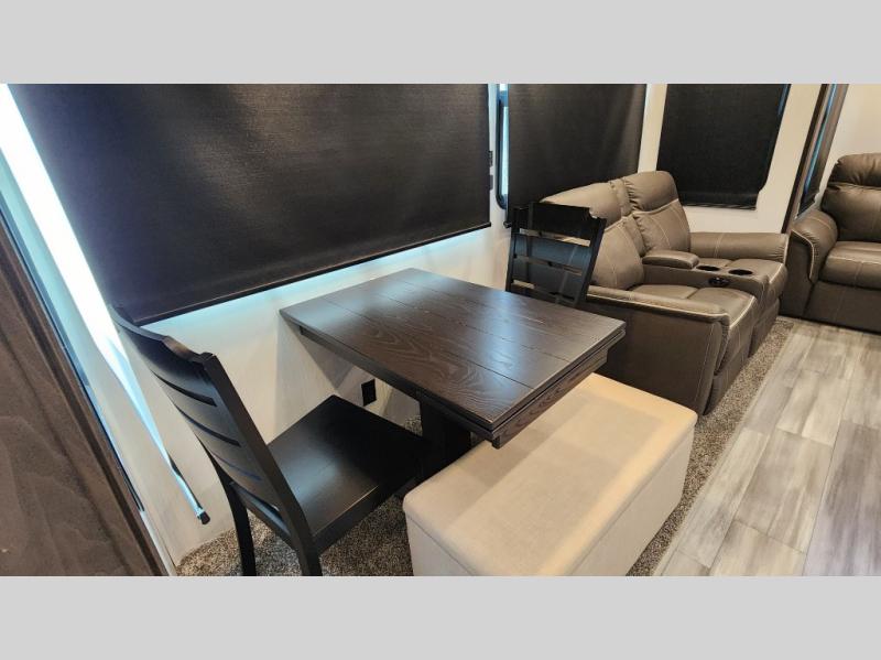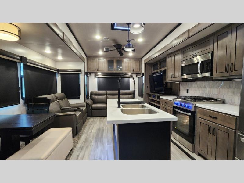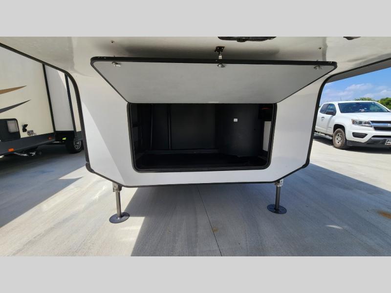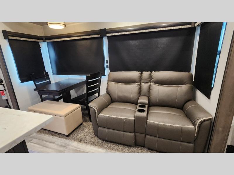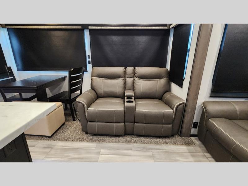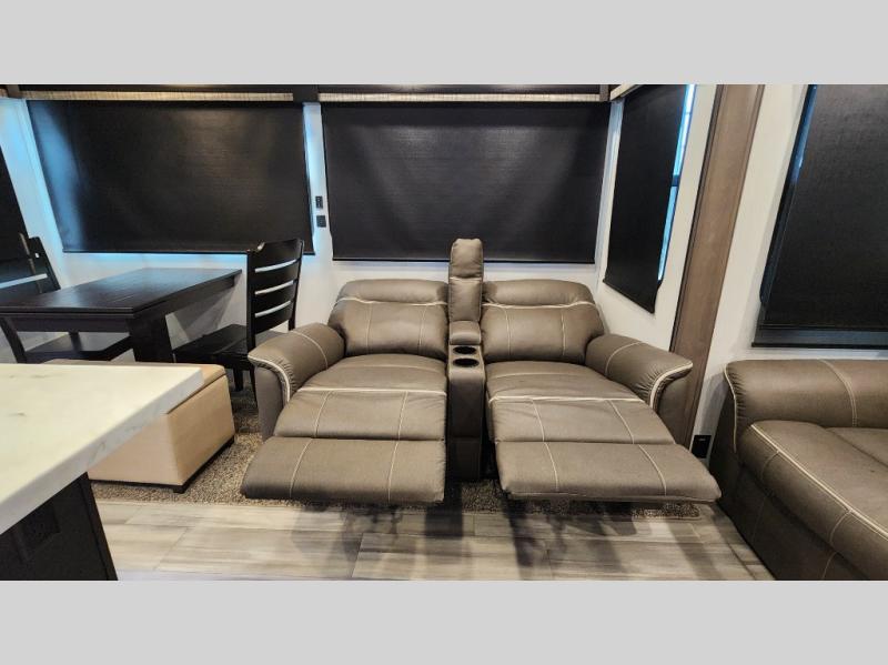 Pack your bags and hitch up this fifth wheel for a fun camping trip! When mother nature rains on your parade, relax in the rear living area on either the hide-a-bed sofa or power theater seating with USB charging across from the entertainment center with a fireplace and 50" flat screen TV. The chef can prepare their best meals with the kitchen island and if you want an easier clean up time then add the optional dishwasher to the island. You could even add the optional pull-out kitchen for breakfast outdoors. The full bathroom has a 48" x 30" shower with a seat to wash the sand out of your hair after a fun day at the beach. The king bed slide in the front private bedroom welcomes you to enjoy a good night's rest and the front wardrobe has storage shelves and an area prepped to add an optional washer and dryer for you to have clean clothes throughout your entire trip!