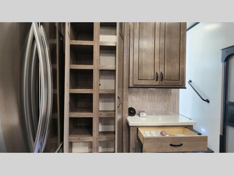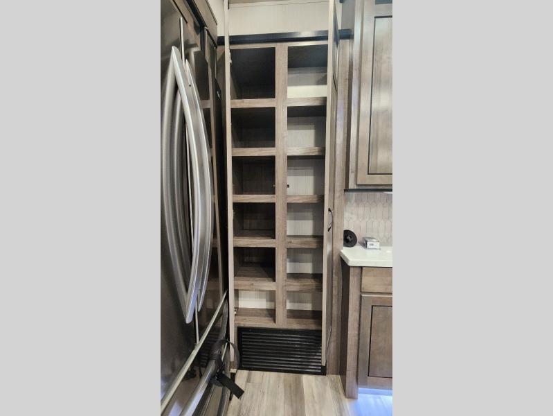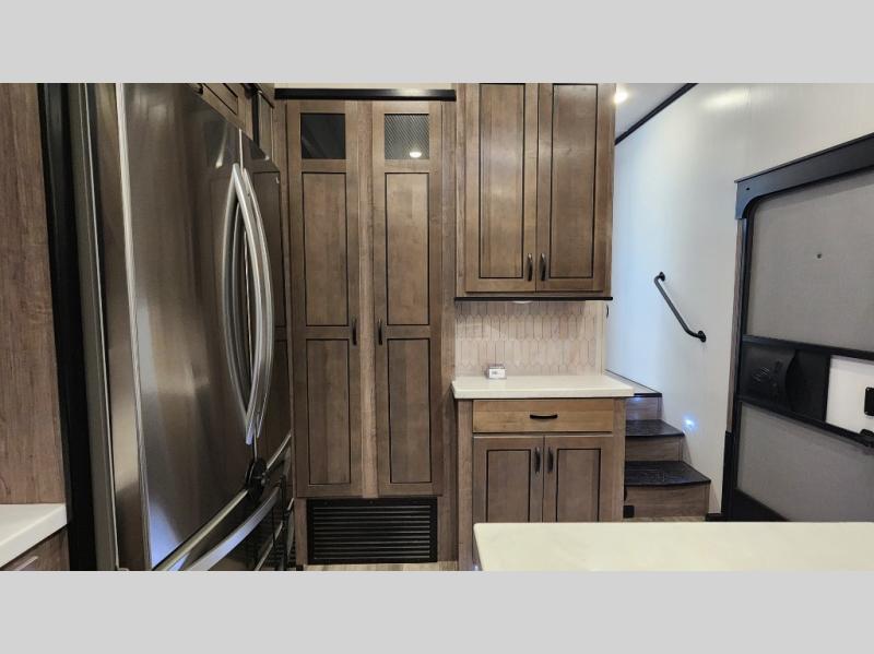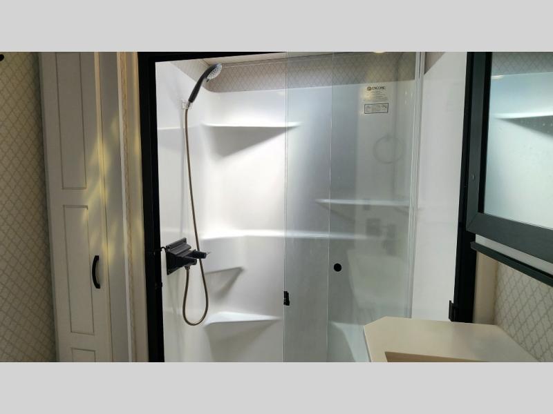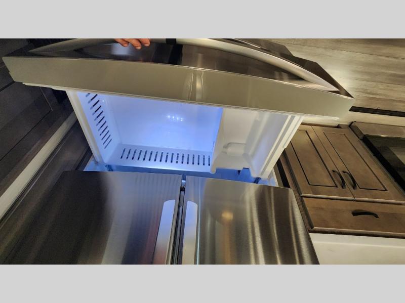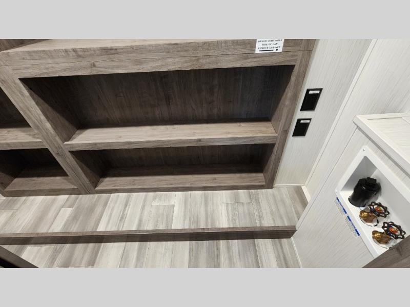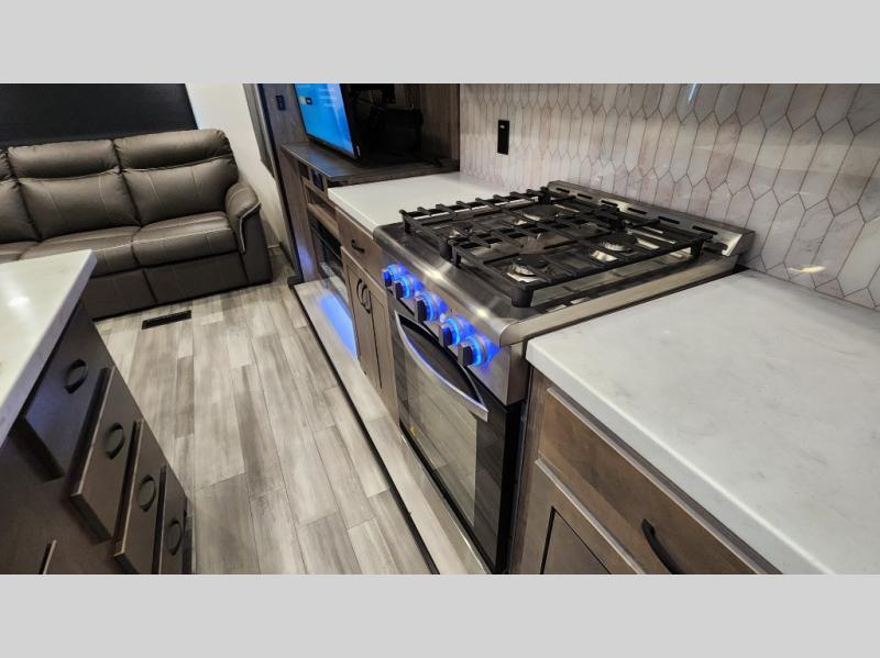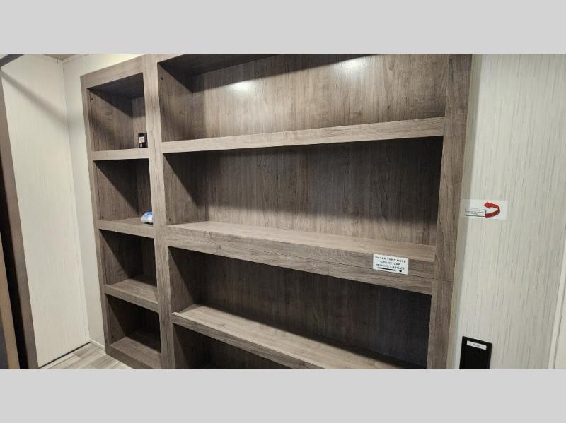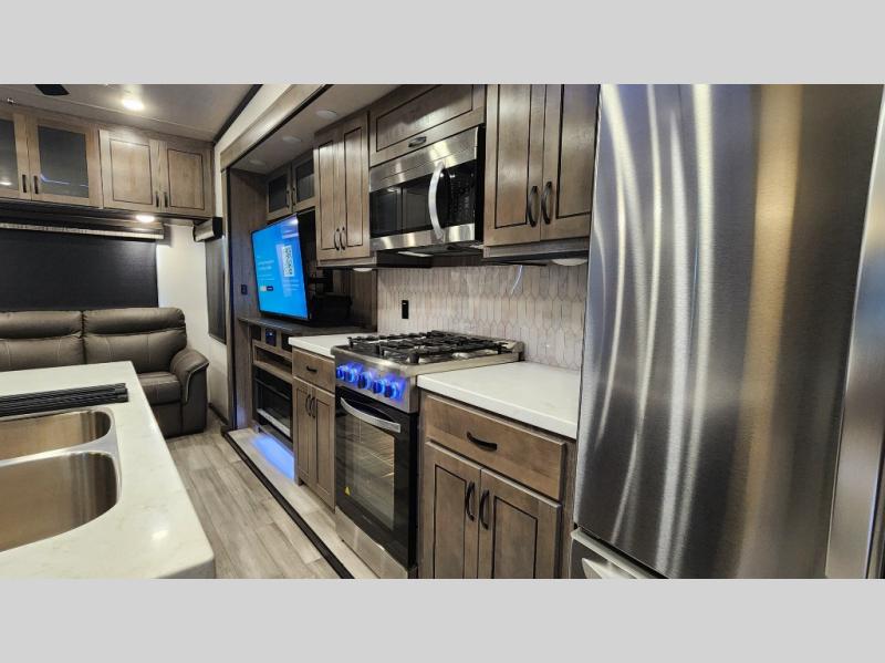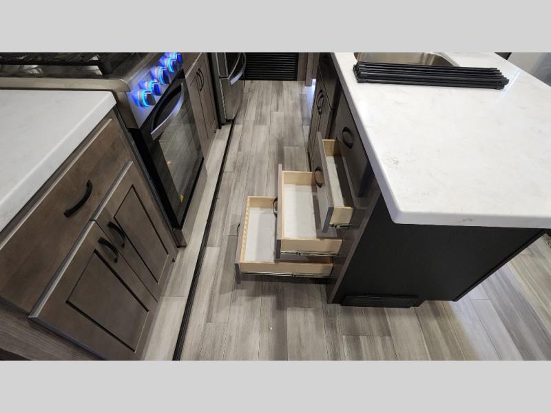 Pack your bags and hitch up this fifth wheel for a fun camping trip! When mother nature rains on your parade, relax in the rear living area on either the hide-a-bed sofa or power theater seating with USB charging across from the entertainment center with a fireplace and 50" flat screen TV. The chef can prepare their best meals with the kitchen island and if you want an easier clean up time then add the optional dishwasher to the island. You could even add the optional pull-out kitchen for breakfast outdoors. The full bathroom has a 48" x 30" shower with a seat to wash the sand out of your hair after a fun day at the beach. The king bed slide in the front private bedroom welcomes you to enjoy a good night's rest and the front wardrobe has storage shelves and an area prepped to add an optional washer and dryer for you to have clean clothes throughout your entire trip!