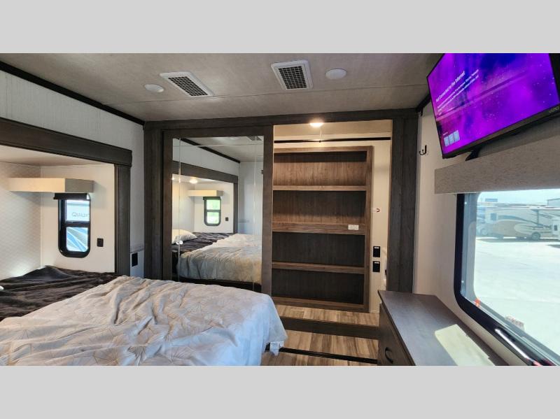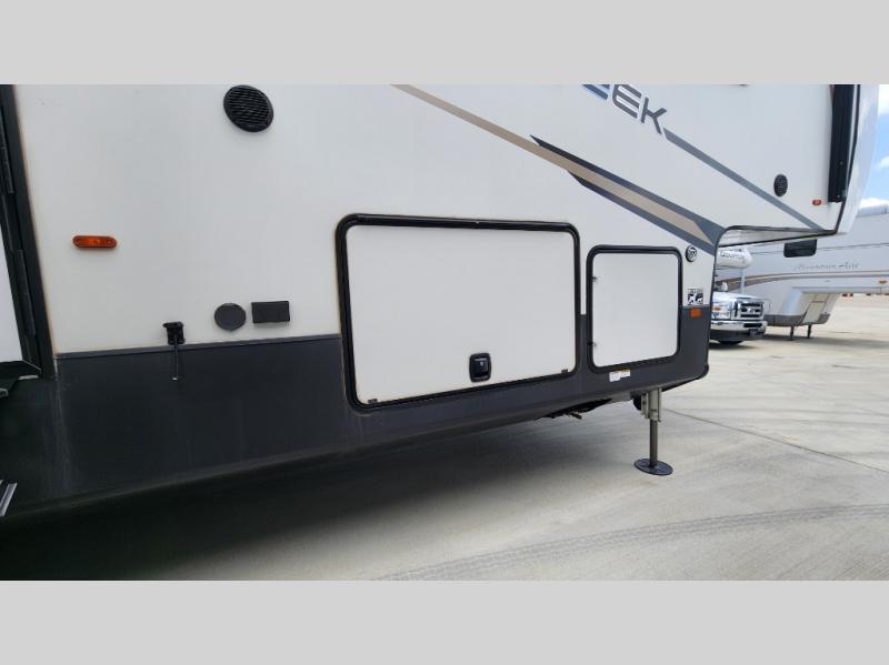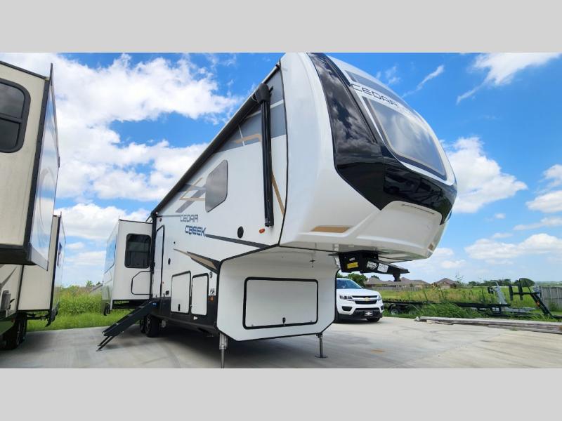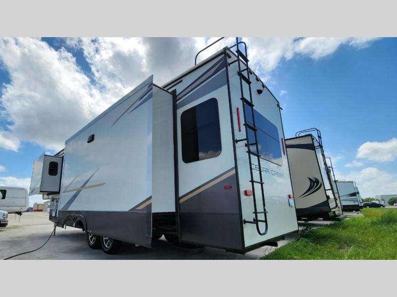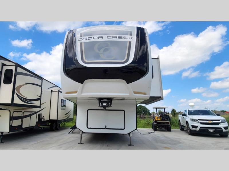 You will have peace of mind camping with any one of these Forest River Cedar Creek fifth wheels or fifth wheel toy haulers! Their aluminum superstructure, high gloss gelcoat exterior, and Dexter heavy duty axles with E-Z lube hubs will outlast all of your adventures. The Silaprene bonded sidewalls resist UV, heat, cold, oils, and highway chemicals with a bond that grows stronger with age while resisting delamination too. With the Vegatouch panel and Firefly dimmer switches, you can have total control of your unit in the palm of your hand. The exterior full docking station has multi-function tank levers, black tank flush, 12V battery disconnect, and an outside shower to keep the dirt where it belongs. The congoleum flooring throughout not only makes you feel right at home, but is also easy to clean. Come find the right model for you today!