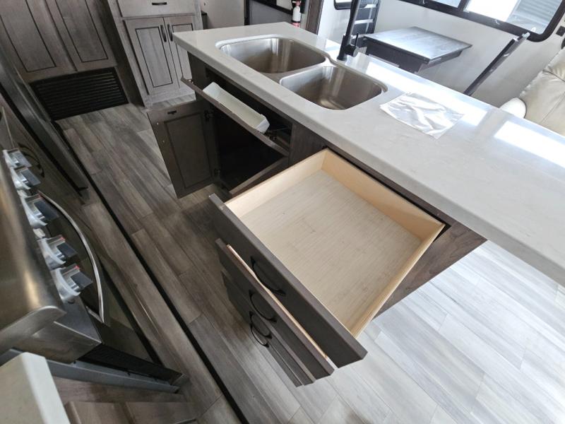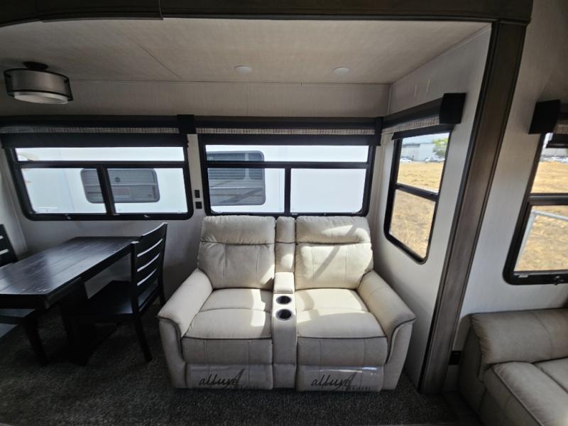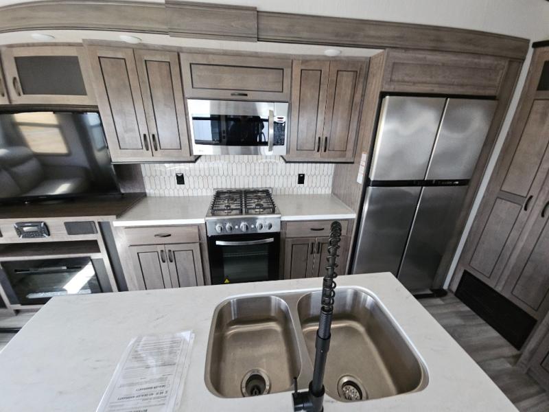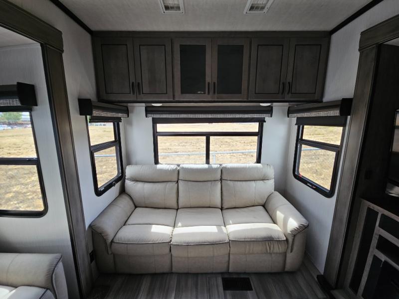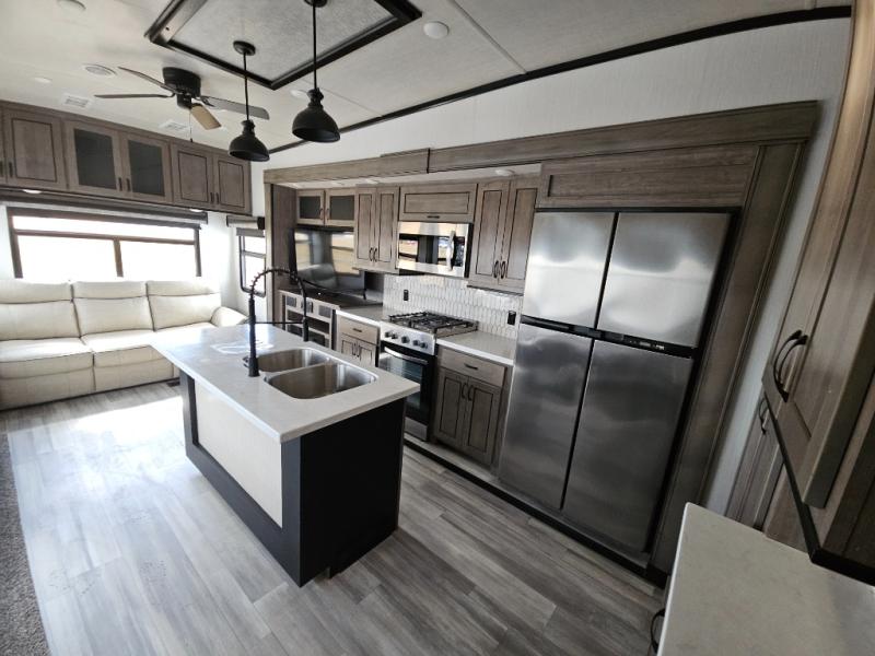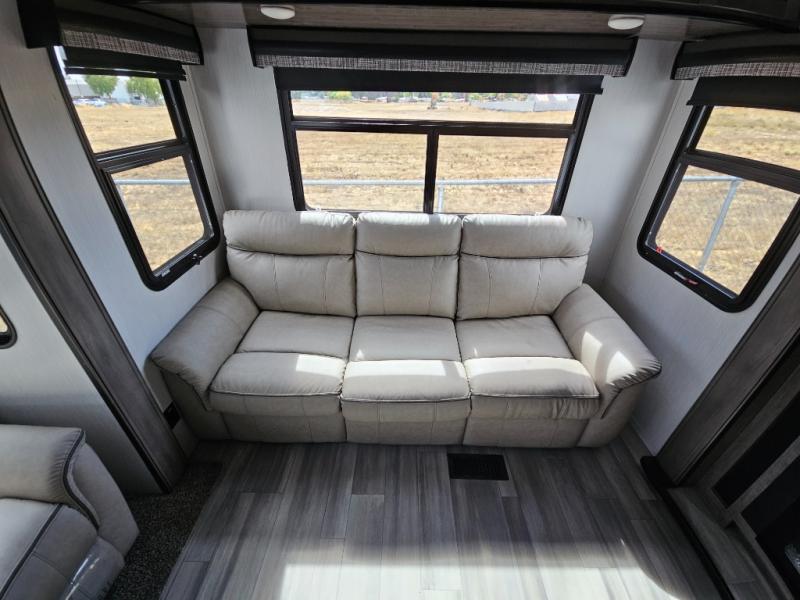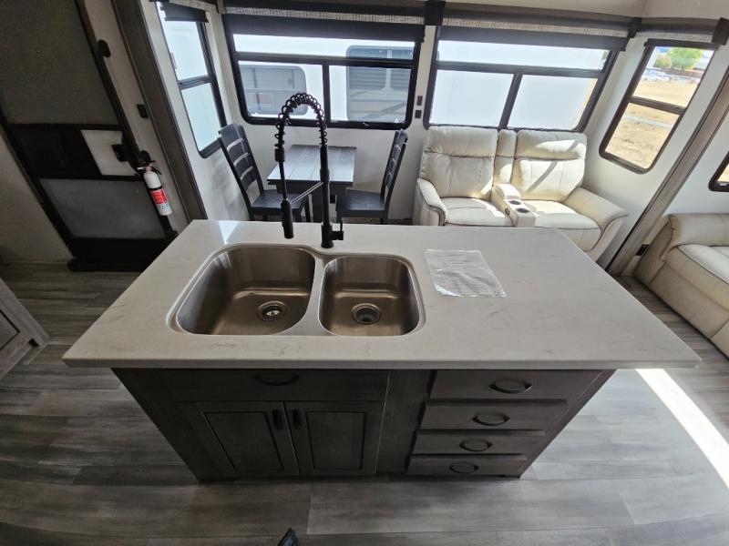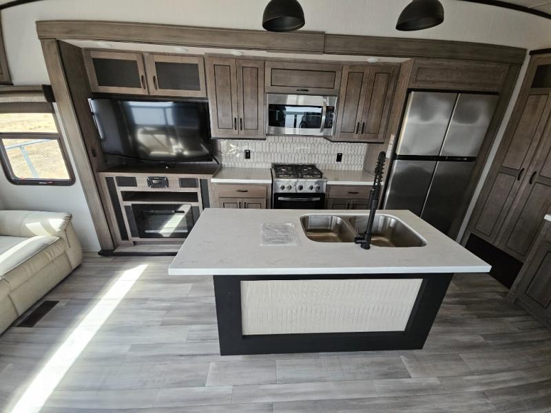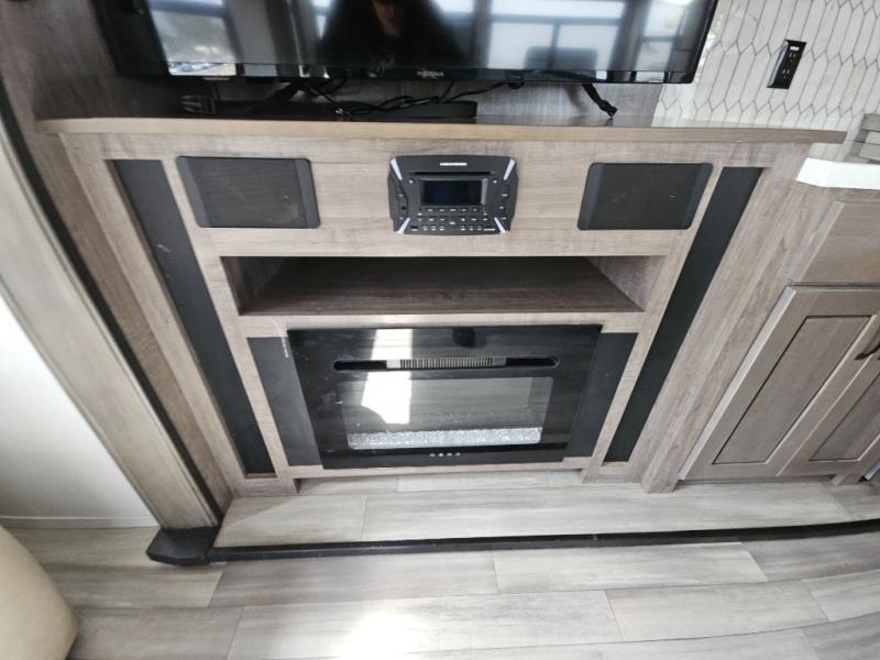 Enjoy a relaxing camping trip with this fifth wheel! The rear living area has a hide-a-bed sofa and power theater seating with USB charging across from an entertainment center with a fireplace and 50" flat screen TV to watch your favorite movies. The chef can prepare their best meals with the kitchen island and if you want an easier clean up time then add the optional dishwasher to the island. You could even add the optional pull-out kitchen for breakfast outdoors. The full bathroom has a 48" x 30" shower with a seat to wash the sand out of your hair after a fun day at the beach and a dual sink vanity for two to get ready at once. The king bed slide in the front private bedroom welcomes you to enjoy a good night's rest and the front wardrobe has storage shelves and an area prepped to add an optional washer and dryer for you to have clean clothes throughout your entire trip!