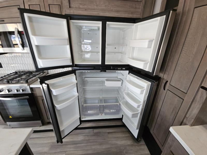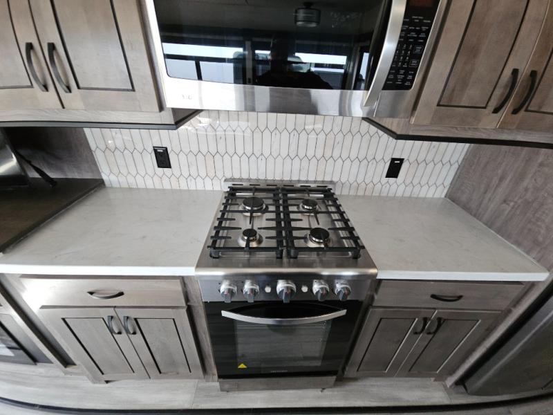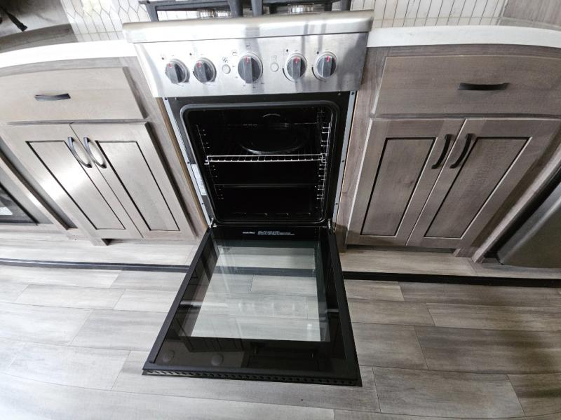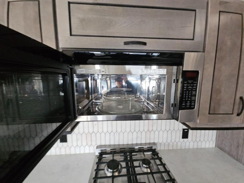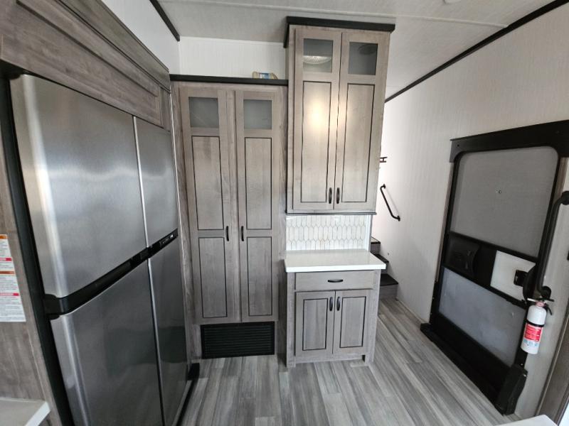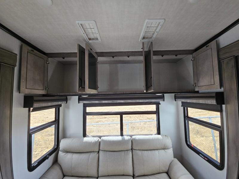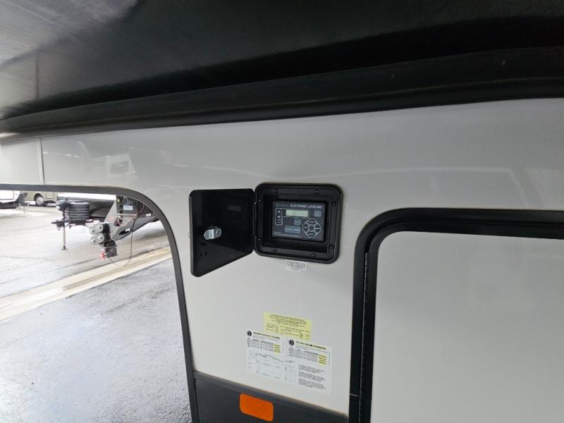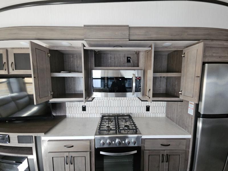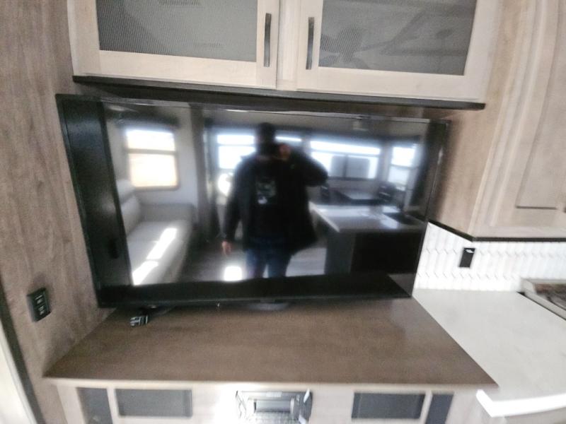 Enjoy a relaxing camping trip with this fifth wheel! The rear living area has a hide-a-bed sofa and power theater seating with USB charging across from an entertainment center with a fireplace and 50" flat screen TV to watch your favorite movies. The chef can prepare their best meals with the kitchen island and if you want an easier clean up time then add the optional dishwasher to the island. You could even add the optional pull-out kitchen for breakfast outdoors. The full bathroom has a 48" x 30" shower with a seat to wash the sand out of your hair after a fun day at the beach and a dual sink vanity for two to get ready at once. The king bed slide in the front private bedroom welcomes you to enjoy a good night's rest and the front wardrobe has storage shelves and an area prepped to add an optional washer and dryer for you to have clean clothes throughout your entire trip!