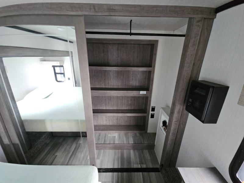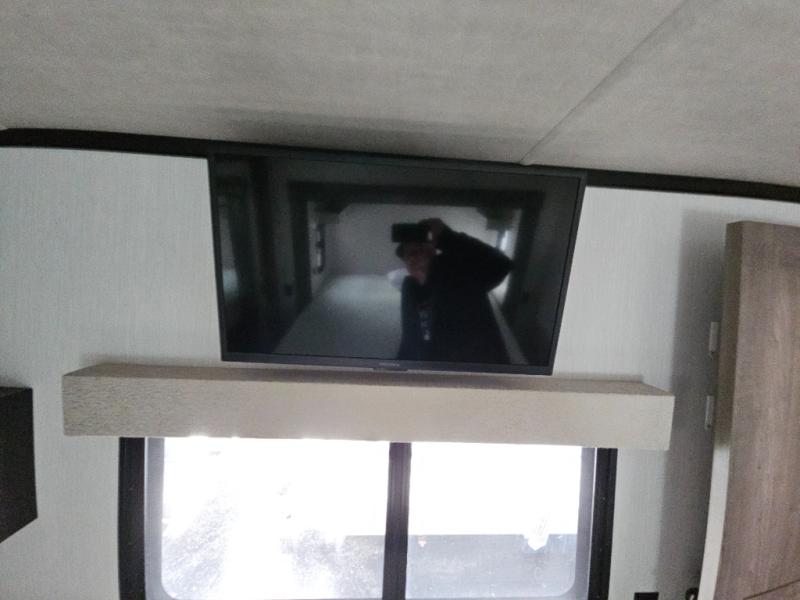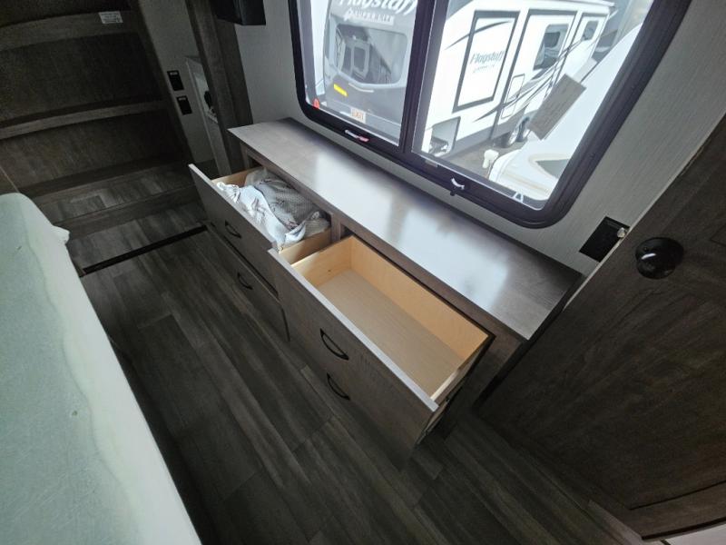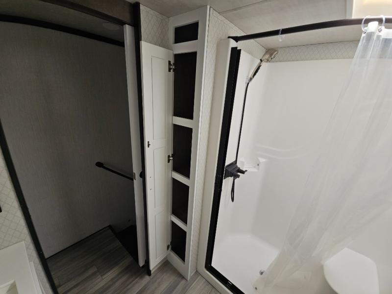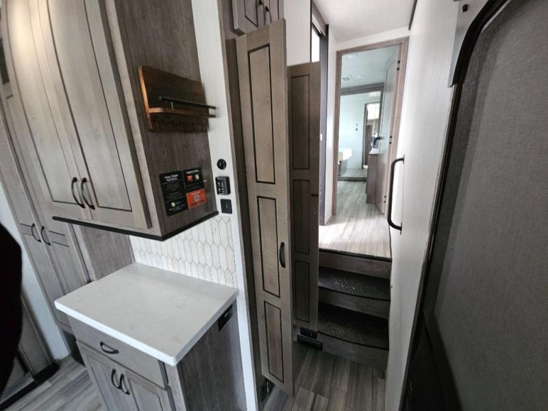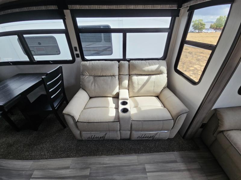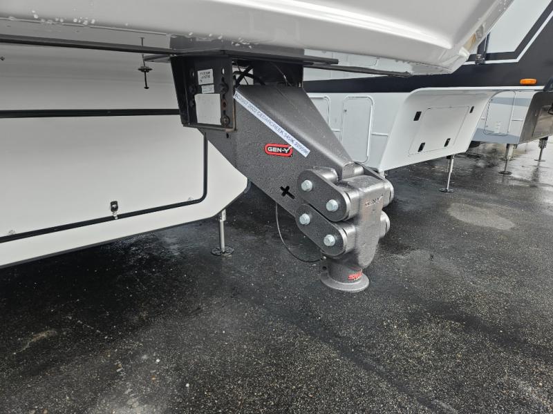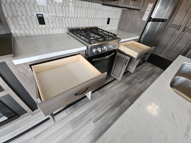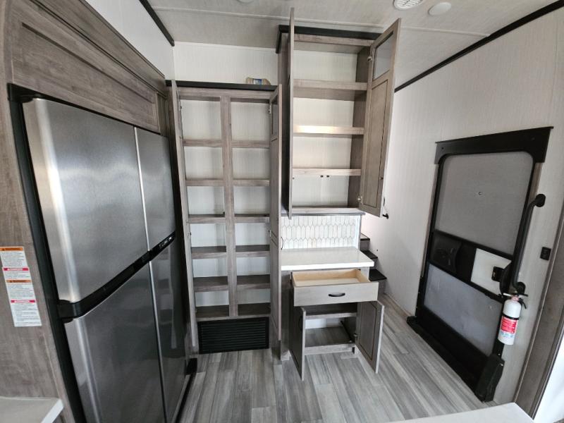 Enjoy a relaxing camping trip with this fifth wheel! The rear living area has a hide-a-bed sofa and power theater seating with USB charging across from an entertainment center with a fireplace and 50" flat screen TV to watch your favorite movies. The chef can prepare their best meals with the kitchen island and if you want an easier clean up time then add the optional dishwasher to the island. You could even add the optional pull-out kitchen for breakfast outdoors. The full bathroom has a 48" x 30" shower with a seat to wash the sand out of your hair after a fun day at the beach and a dual sink vanity for two to get ready at once. The king bed slide in the front private bedroom welcomes you to enjoy a good night's rest and the front wardrobe has storage shelves and an area prepped to add an optional washer and dryer for you to have clean clothes throughout your entire trip!