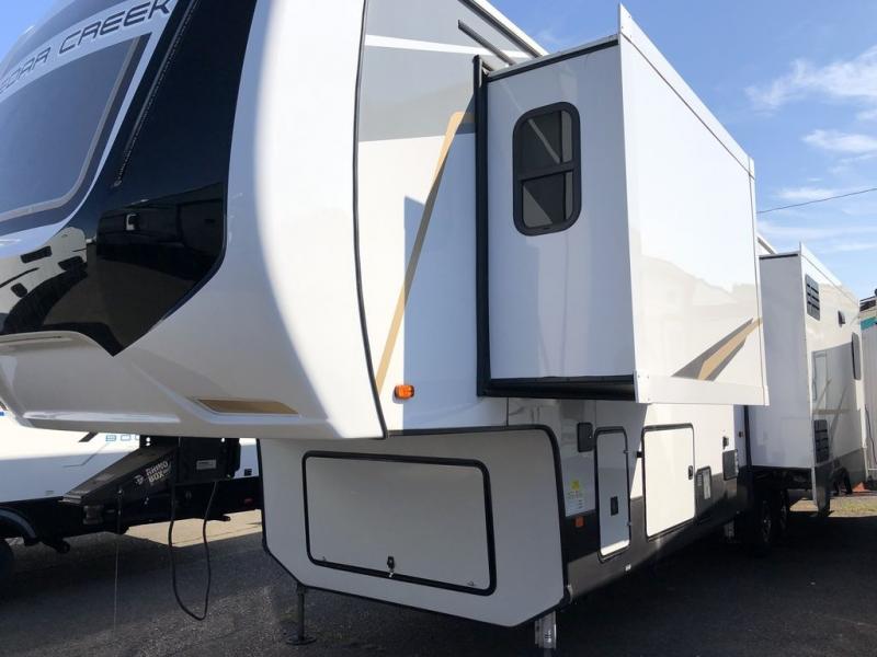 You will have peace of mind camping with any one of these Forest River Cedar Creek fifth wheels or fifth wheel toy haulers! Their aluminum superstructure, high gloss gelcoat exterior, and Dexter heavy duty axles with E-Z lube hubs will outlast all of your adventures. The Silaprene bonded sidewalls resist UV, heat, cold, oils, and highway chemicals with a bond that grows stronger with age while resisting delamination too. With the Vegatouch panel and Firefly dimmer switches, you can have total control of your unit in the palm of your hand. The exterior full docking station has multi-function tank levers, black tank flush, 12V battery disconnect, and an outside shower to keep the dirt where it belongs. The congoleum flooring throughout not only makes you feel right at home, but is also easy to clean. Come find the right model for you today!