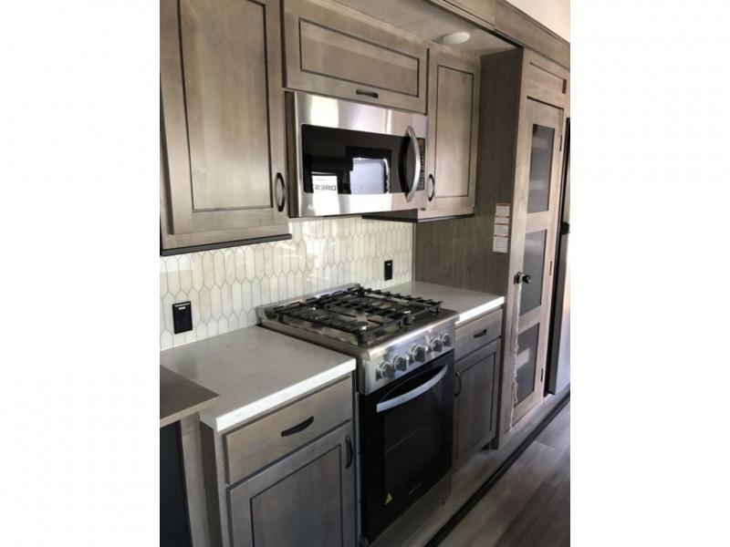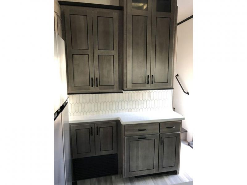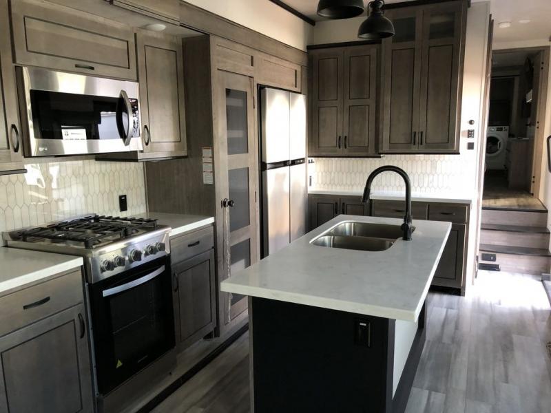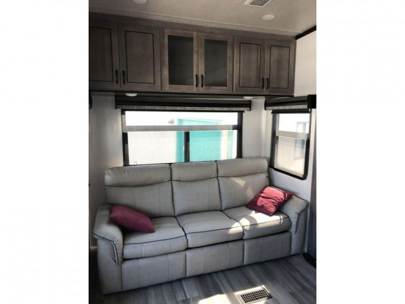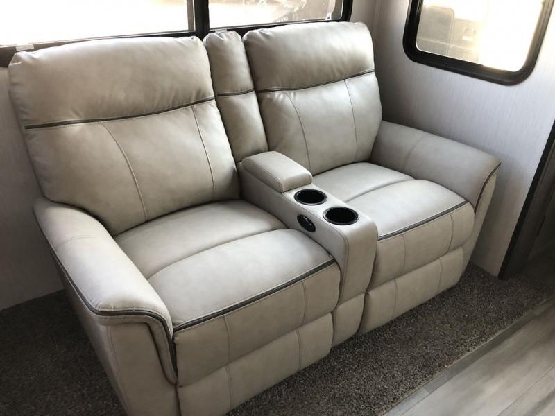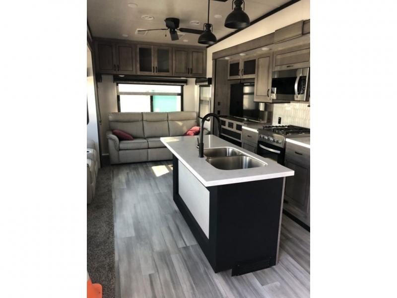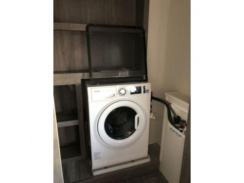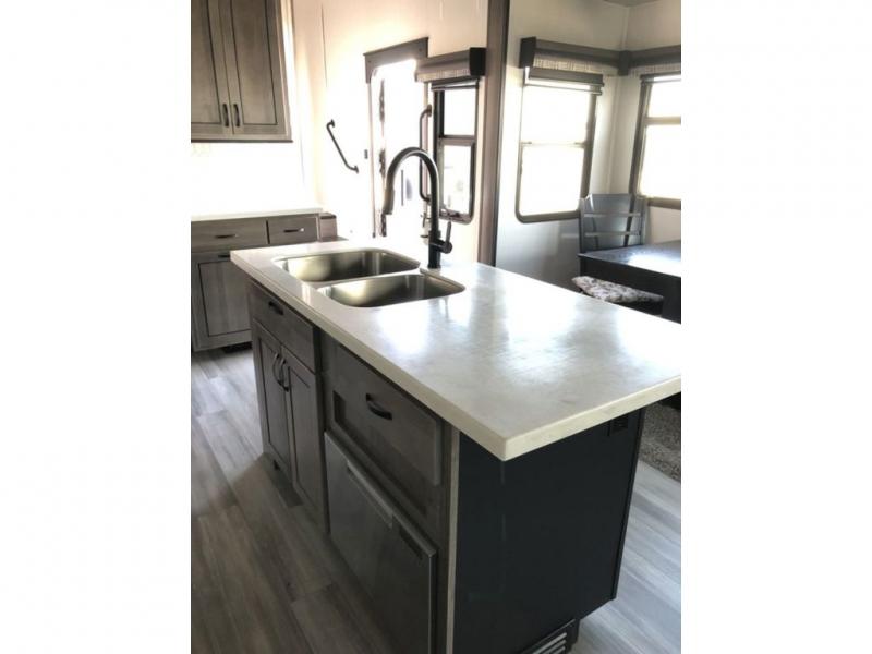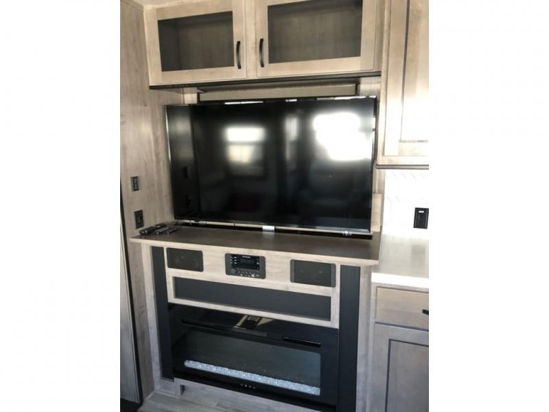 You can bring a guest or two to join in on the fun with this fifth wheel! The rear living area has a hide-a-bed sofa and power theater seating with USB charging across from an entertainment center with a fireplace and a hidden telescope 50" flat screen TV to watch your favorite movies. The chef can prepare their best meals with the kitchen island and if you want an easier clean up time then add the optional dishwasher to the island. You could even add the optional pull-out kitchen for breakfast outdoors. The full bathroom has a 48" x 30" shower with a seat to wash the sand out of your hair after a fun day at the beach and a dual sink vanity for two to get ready at once. The king bed slide in the front private bedroom welcomes you to enjoy a good night's rest and the front wardrobe has storage shelves and an area prepped to add an optional washer and dryer for you to have clean clothes throughout your entire trip!