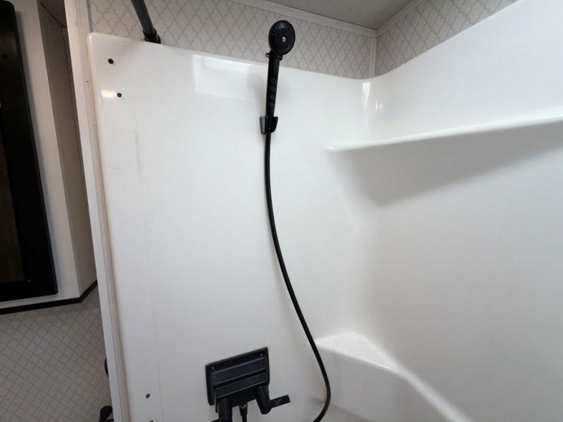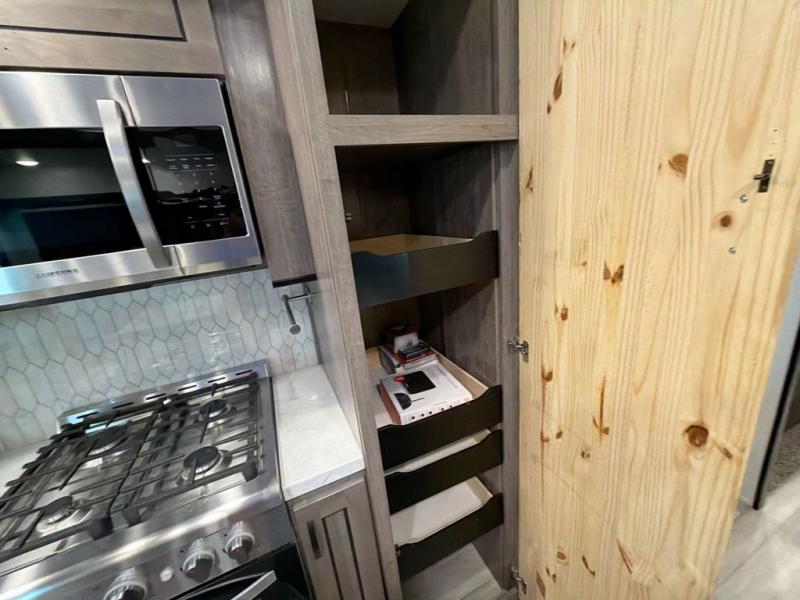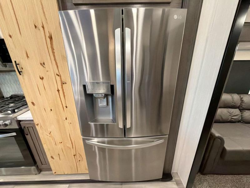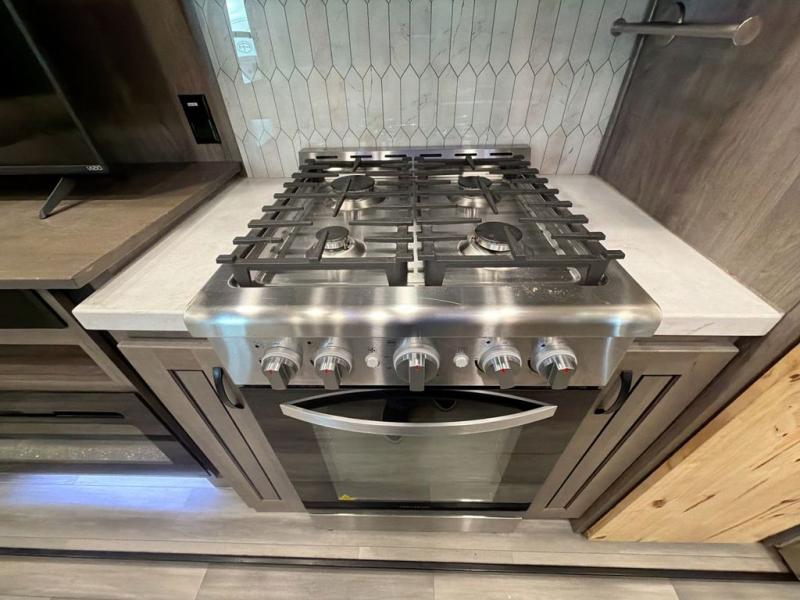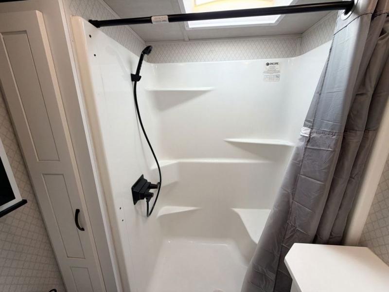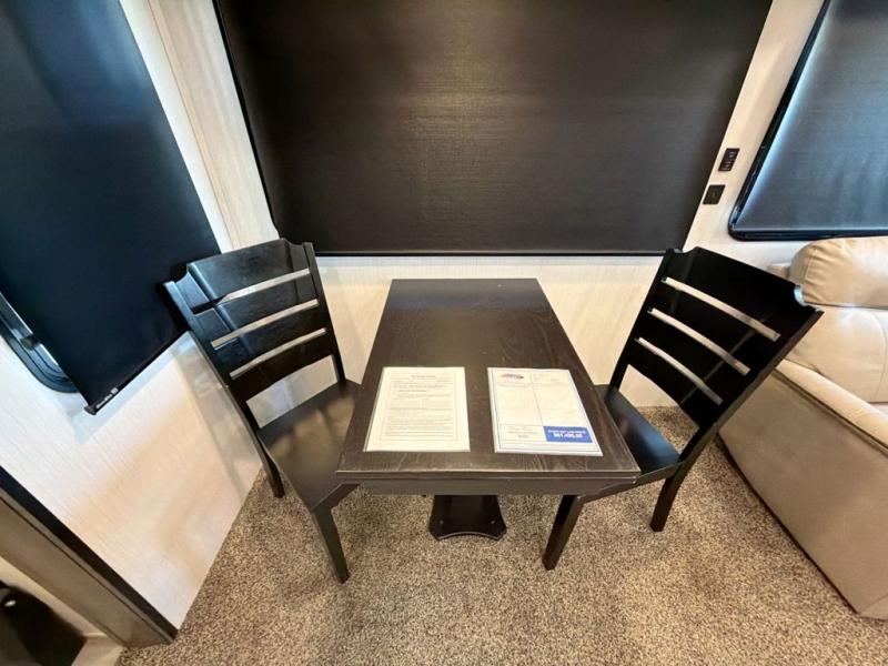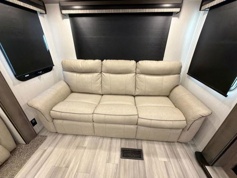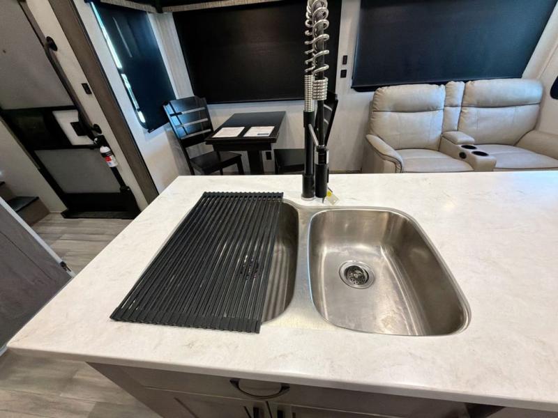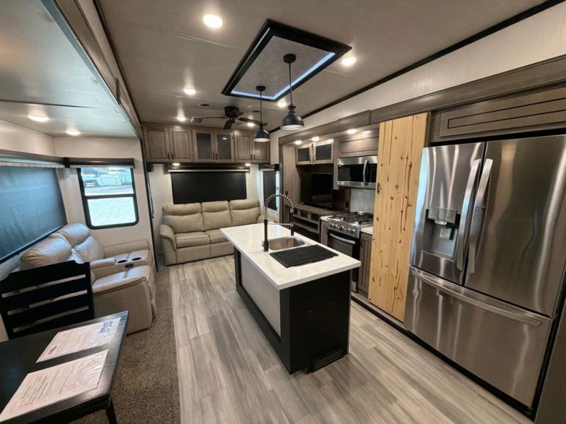 With two bedrooms in this fifth wheel, the whole family can camp together! The front private bedroom has a king bed slide to lay your head at night, a dresser with a TV, and a front wardrobe with storage shelves to keep your clothes looking nice. The second bedroom has a 91" x 64- 3/4" loft above a tri-fold sofa slide that is across from an area for a TV and wardrobe, and you could even switch out the sofa for an optional 73" desk to get some work done while you are away. Everyone can freshen up in the full bathroom with a shower with a seat and their bellies full with a kitchen island and 20 cu. ft. stainless steel refrigerator with ice maker. And for easy clean up add the optional dishwasher to the kitchen island. You can even cook your meals while breathing in some fresh air with the exterior camp kitchen. After a fun day outdoors, head to the rear living area and relax on either the hide-a-bed sofa or the power theater seating across from the fireplace and 50" flat screen TV!