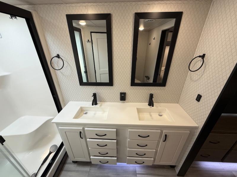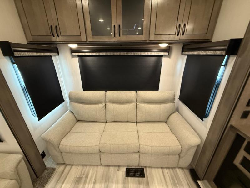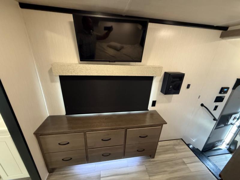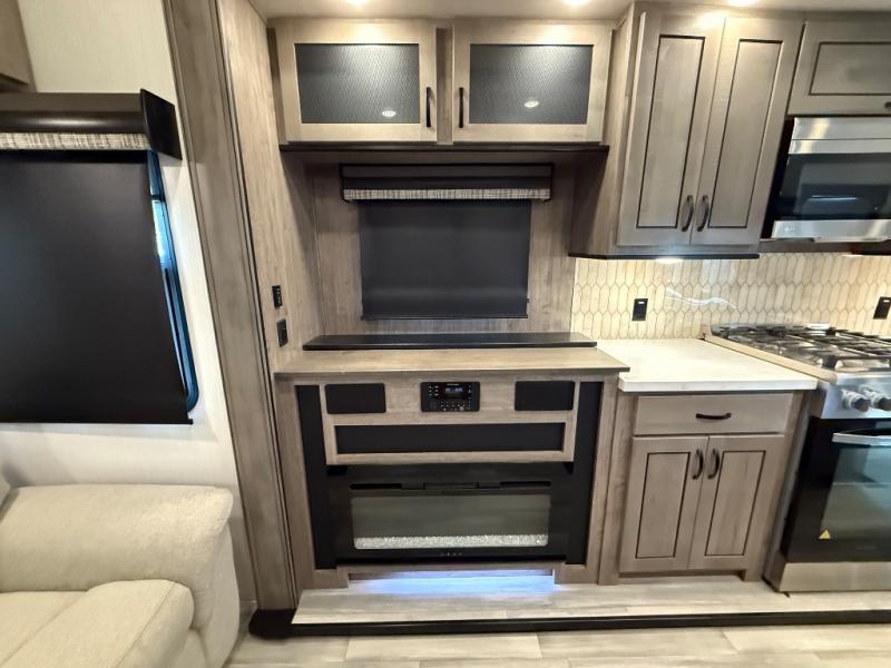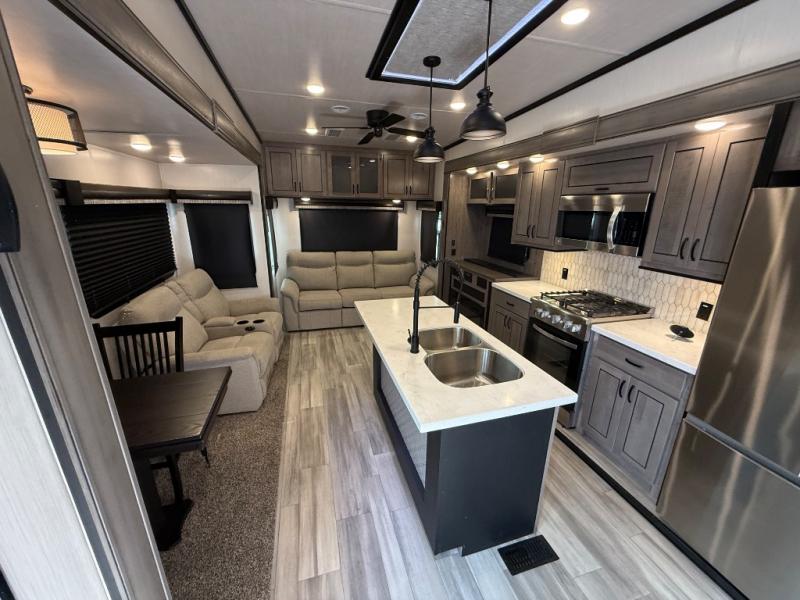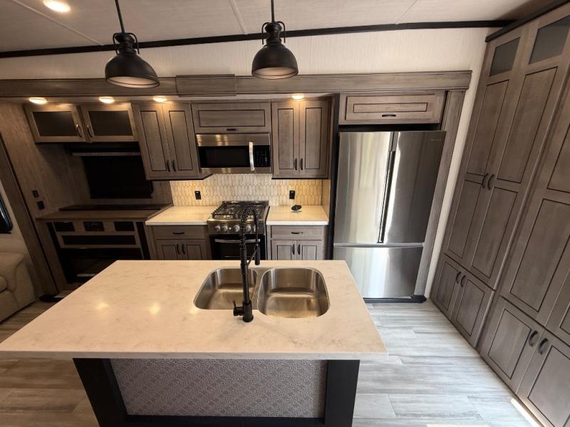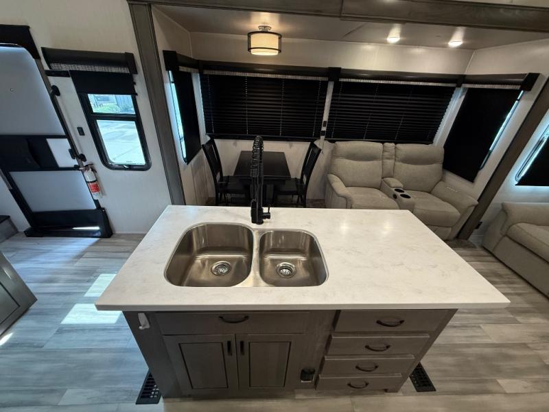 You're going to feel right at home camping in this fifth wheel! It features a rear living area with a hide-a-bed sofa, power theater seating with USB charging, and an entertainment center with a fireplace and 50" flat screen TV. Cleaning up after meals will be easy if you choose to add the optional dishwasher to the kitchen island. You could also add the optional pull-out kitchen with a two burner cooktop to grill up some juicy burgers while enjoying a cold beverage that was stored in the refrigerator. The half bathroom is easily accessed from the kitchen and has an area prepped to add the optional washer and dryer. Inside the master suite is a king bed slide to lay your head at night and access to the front full bathroom which has a large wardrobe with a shelf, a dual sink vanity for two to get ready at once, and a 48" x 30" shower with a seat to freshen up in each morning!