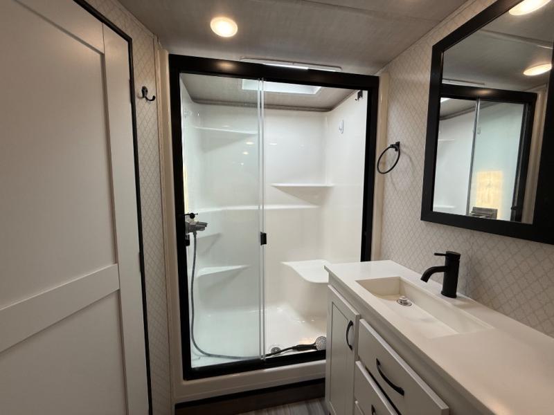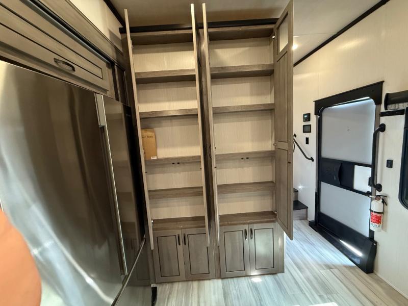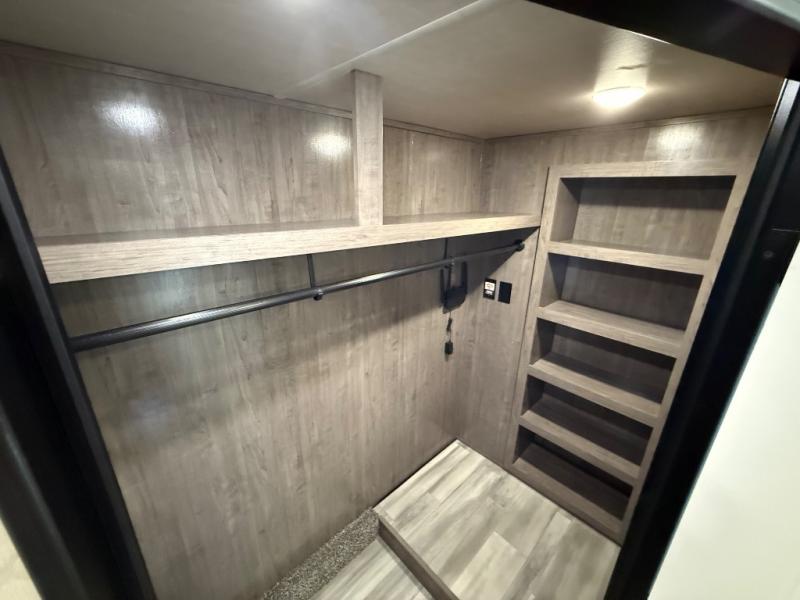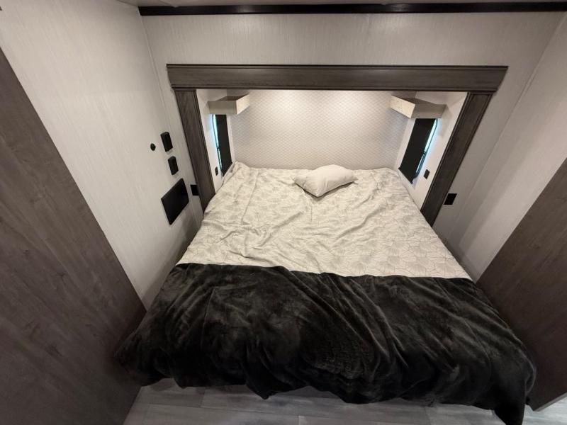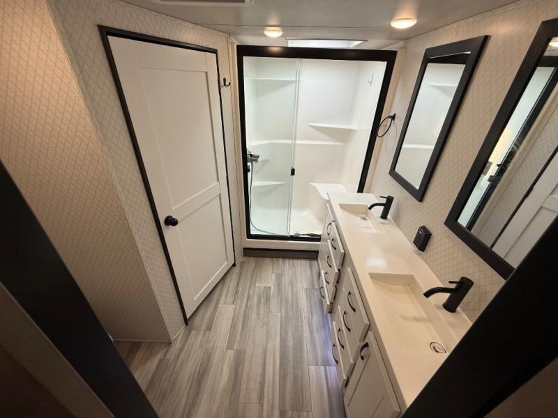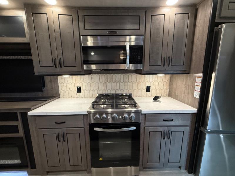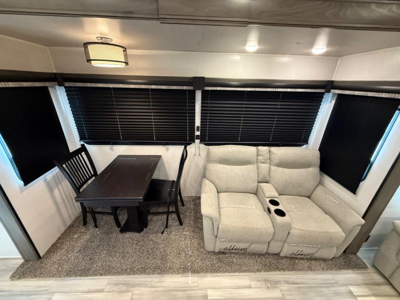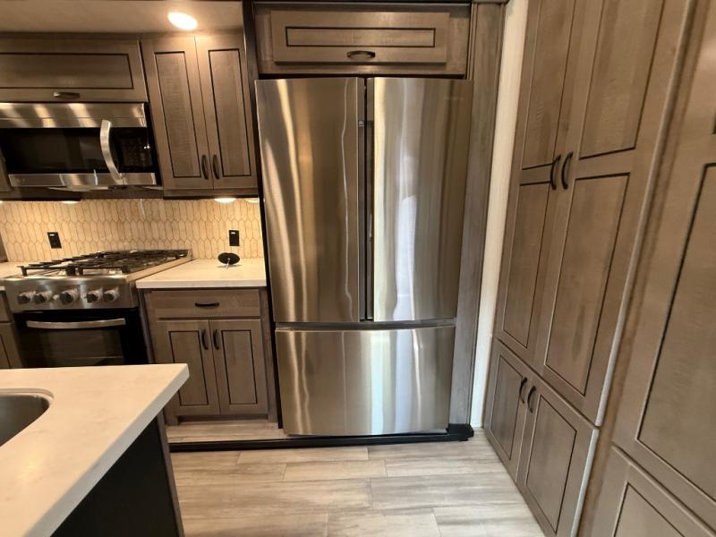You're going to feel right at home camping in this fifth wheel! It features a rear living area with a hide-a-bed sofa, power theater seating with USB charging, and an entertainment center with a fireplace and 50" flat screen TV. Cleaning up after meals will be easy if you choose to add the optional dishwasher to the kitchen island. You could also add the optional pull-out kitchen with a two burner cooktop to grill up some juicy burgers while enjoying a cold beverage that was stored in the refrigerator. The half bathroom is easily accessed from the kitchen and has an area prepped to add the optional washer and dryer. Inside the master suite is a king bed slide to lay your head at night and access to the front full bathroom which has a large wardrobe with a shelf, a dual sink vanity for two to get ready at once, and a 48" x 30" shower with a seat to freshen up in each morning!
