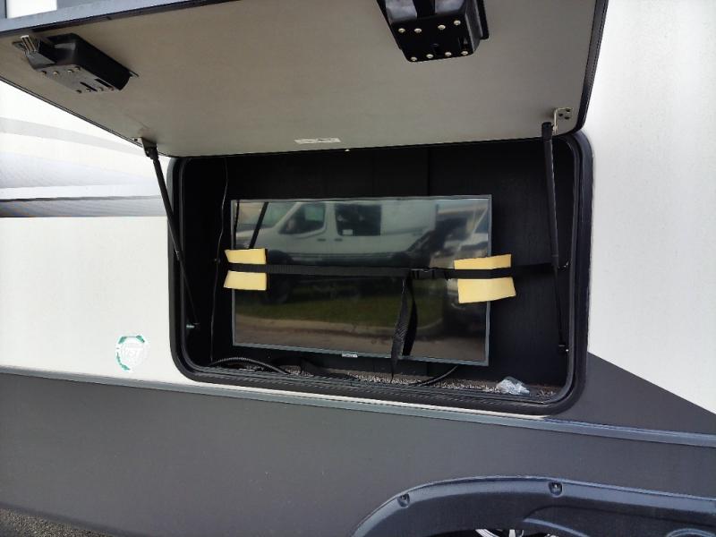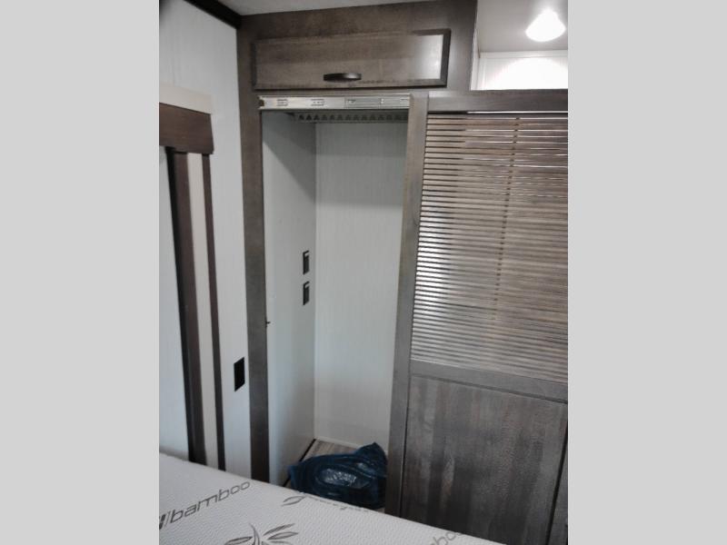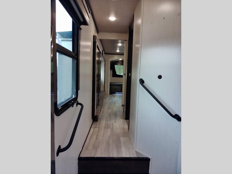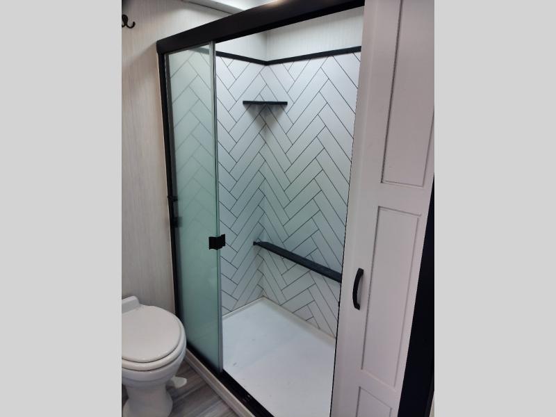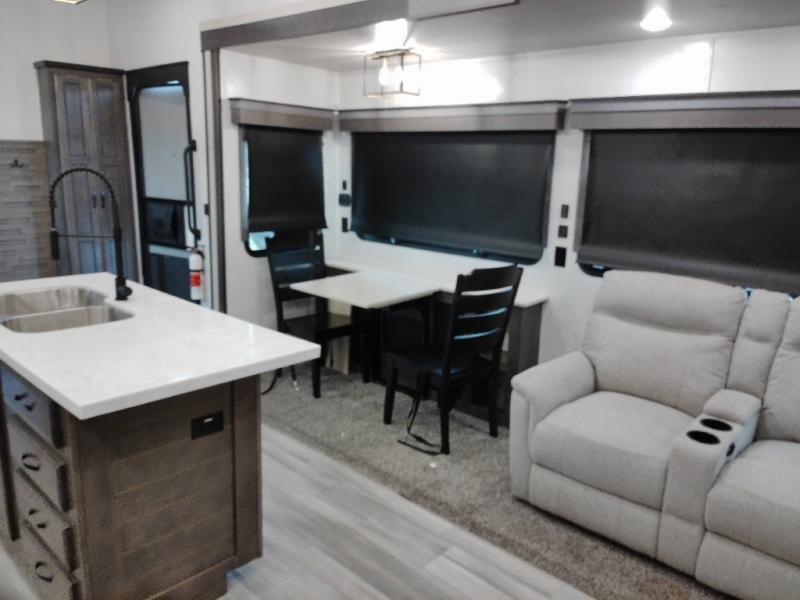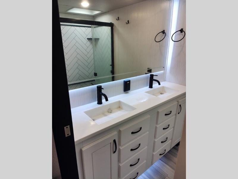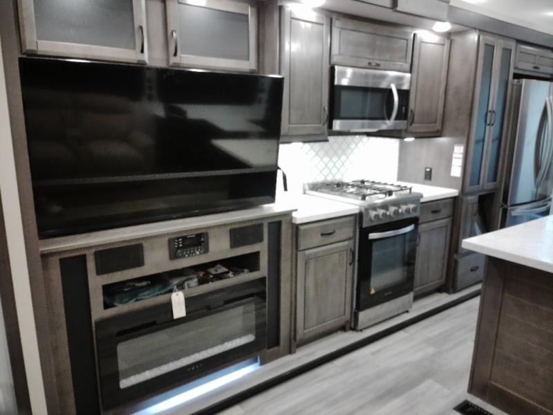 This Cedar Creek Champagne Edition fifth wheel is absolutely glamorous! It features a front private bedroom with a king bed slide, a bench with storage, a closet with preparations for an optional washer/dryer, a vanity, a 32" TV, and an opposing slide with a wardrobe and step-down dresser. What convenience! The full bathroom also has a convenient feature with the dual-sink vanity. This allows two people to brush their teeth at the same time, and the 48" shower has plenty of room to get cleaned up like you would at home. The main living area has power theater seats, a hide-a-bed sofa, and a pull-out dinette, and these are all great places to sit down at the end of a long day and to enjoy the fireplace and 55" 4K TV.