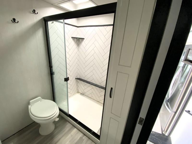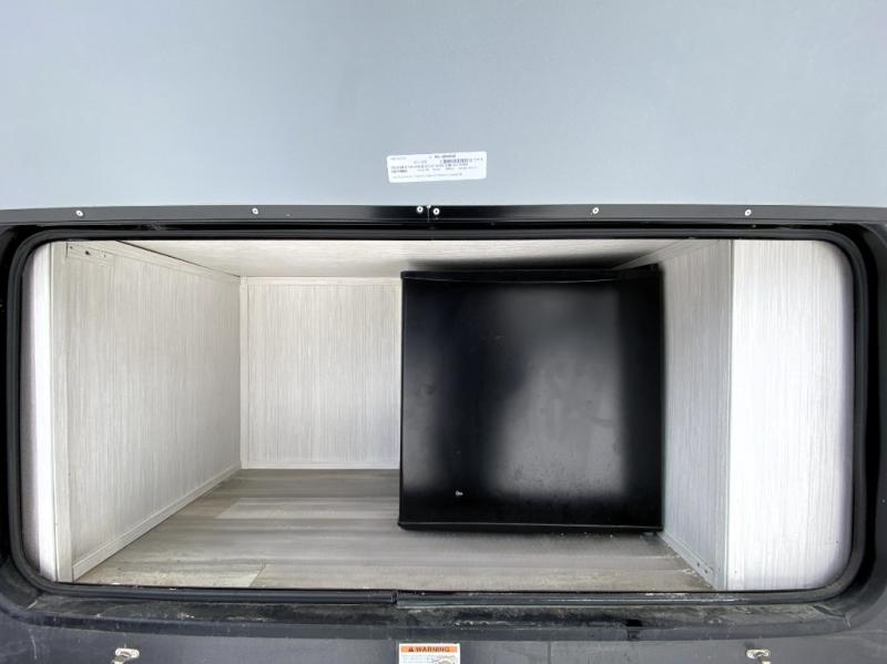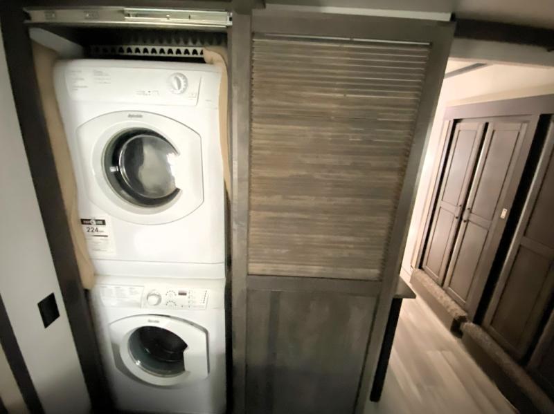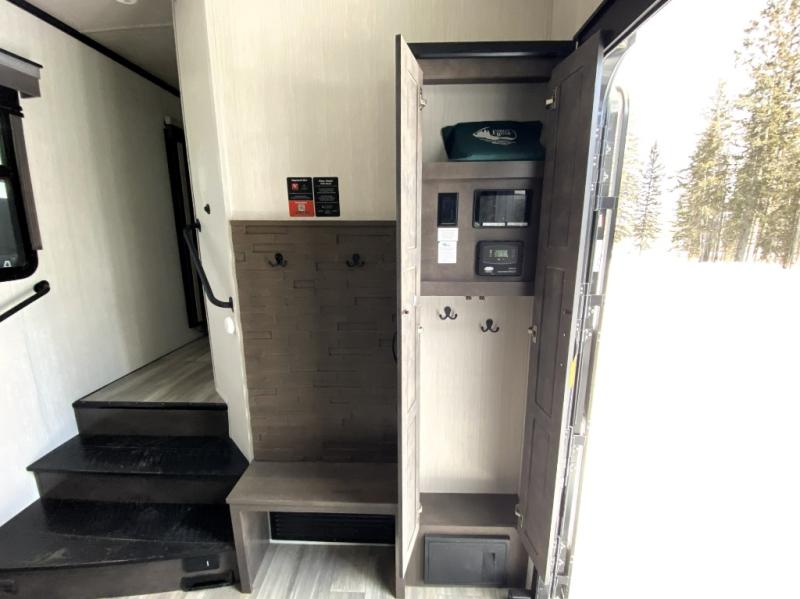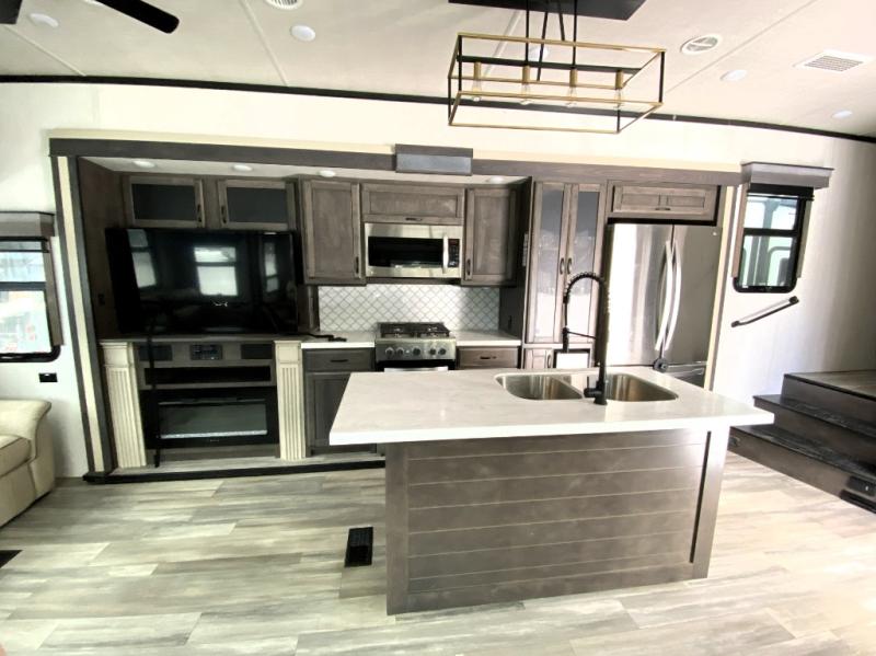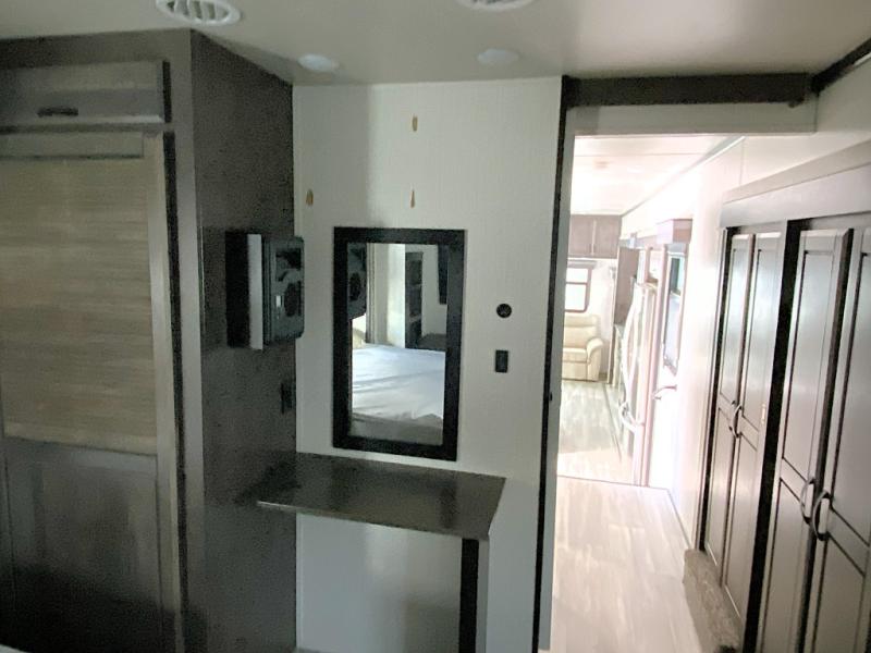 This Cedar Creek Champagne Edition fifth wheel is absolutely glamorous! It features a front private bedroom with a king bed slide, a bench with storage, a closet with preparations for an optional washer/dryer, a vanity, a 32" TV, and an opposing slide with a wardrobe and step-down dresser. What convenience! The full bathroom also has a convenient feature with the dual-sink vanity. This allows two people to brush their teeth at the same time, and the 48" shower has plenty of room to get cleaned up like you would at home. The main living area has power theater seats, a hide-a-bed sofa, and a pull-out dinette, and these are all great places to sit down at the end of a long day and to enjoy the fireplace and 55" 4K TV.