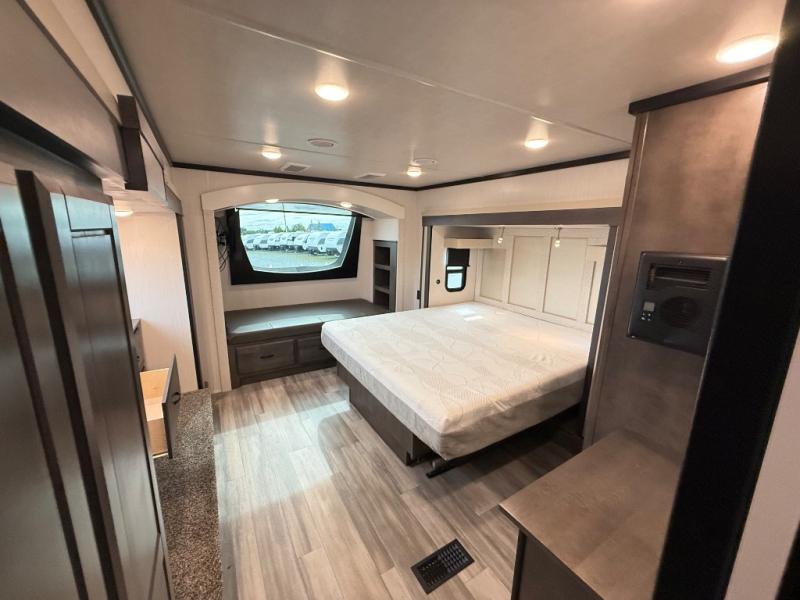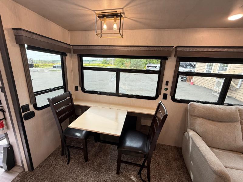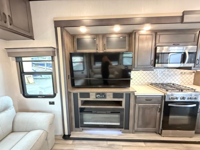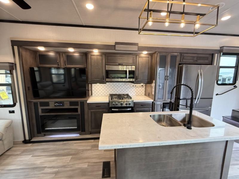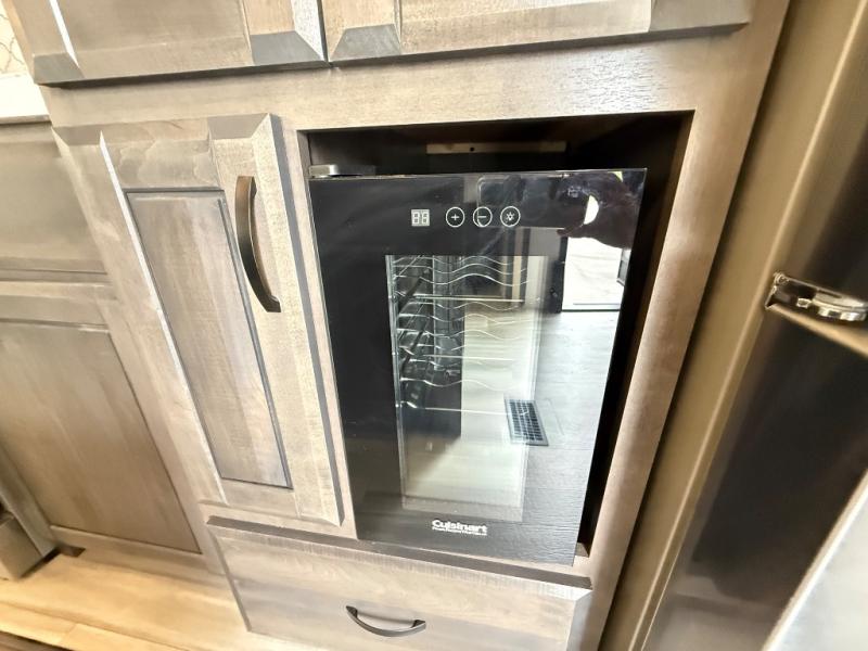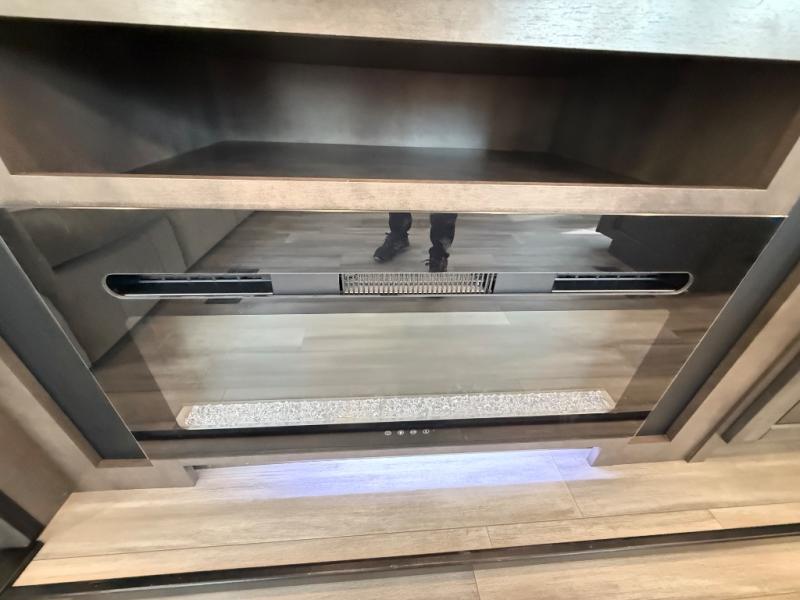 This Cedar Creek Champagne Edition fifth wheel is absolutely glamorous! It features a front private bedroom with a king bed slide, a bench with storage, a closet with preparations for an optional washer/dryer, a vanity, a 32" TV, and an opposing slide with a wardrobe and step-down dresser. What convenience! The full bathroom also has a convenient feature with the dual-sink vanity. This allows two people to brush their teeth at the same time, and the 48" shower has plenty of room to get cleaned up like you would at home. The main living area has power theater seats, a hide-a-bed sofa, and a pull-out dinette, and these are all great places to sit down at the end of a long day and to enjoy the fireplace and 55" 4K TV.