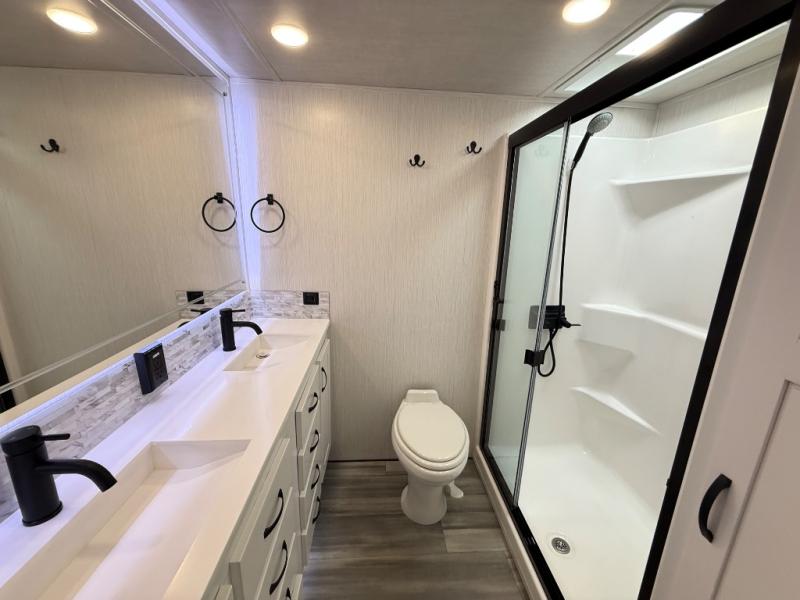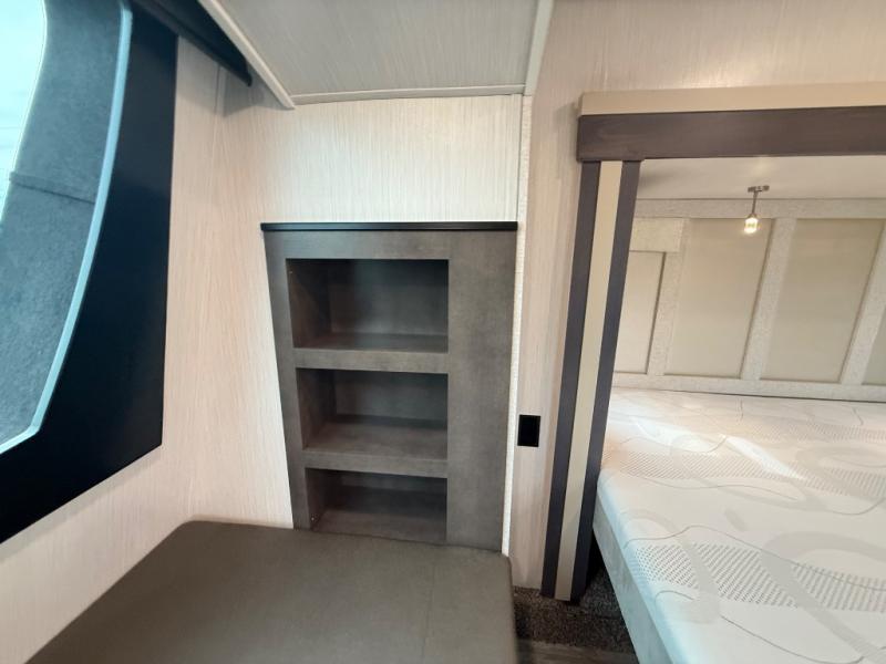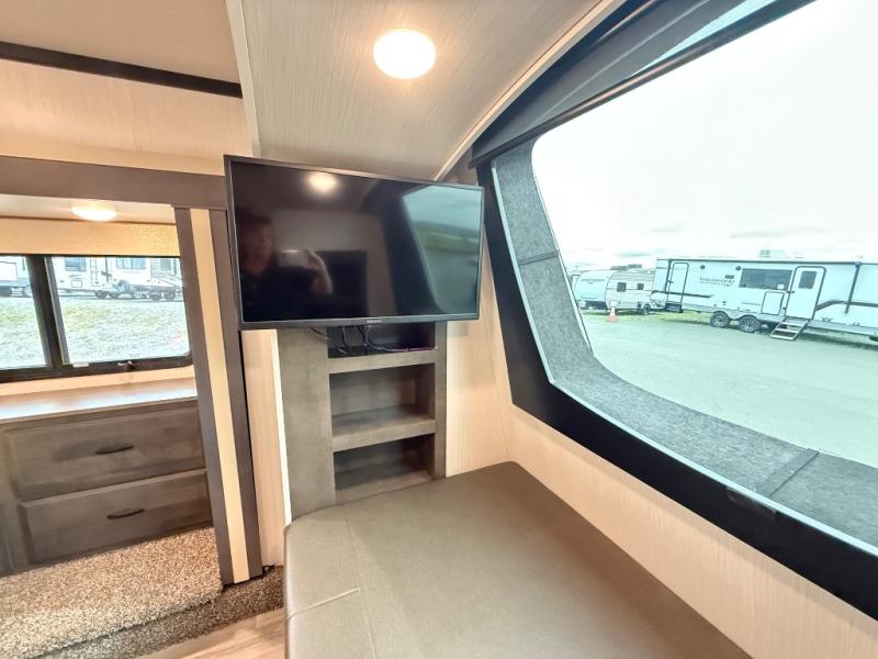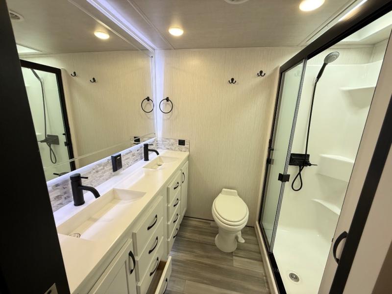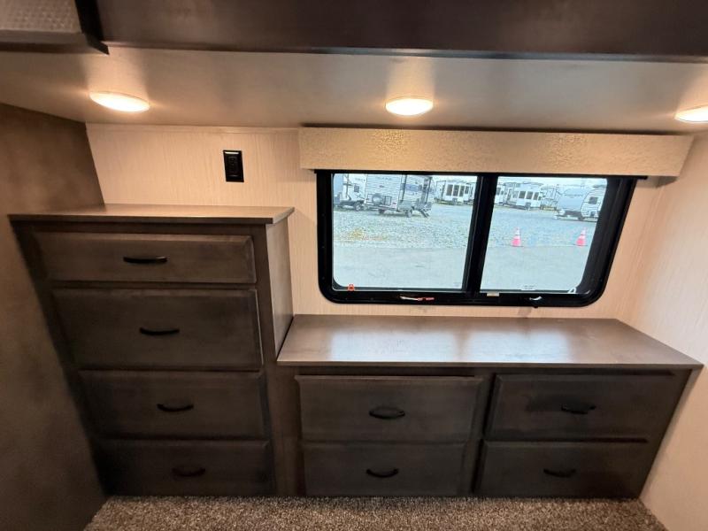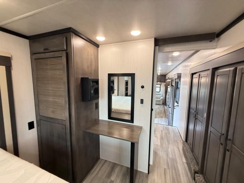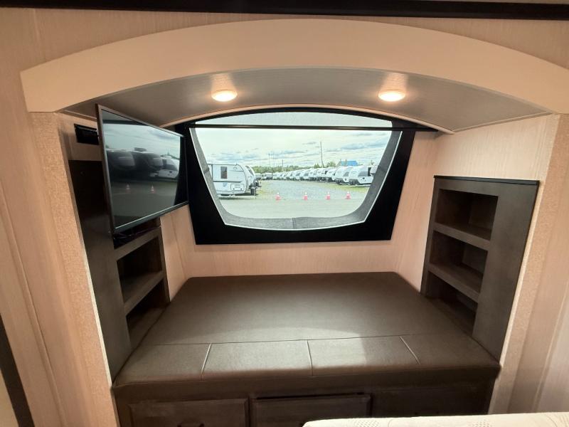 This Cedar Creek Champagne Edition fifth wheel is absolutely glamorous! It features a front private bedroom with a king bed slide, a bench with storage, a closet with preparations for an optional washer/dryer, a vanity, a 32" TV, and an opposing slide with a wardrobe and step-down dresser. What convenience! The full bathroom also has a convenient feature with the dual-sink vanity. This allows two people to brush their teeth at the same time, and the 48" shower has plenty of room to get cleaned up like you would at home. The main living area has power theater seats, a hide-a-bed sofa, and a pull-out dinette, and these are all great places to sit down at the end of a long day and to enjoy the fireplace and 55" 4K TV.