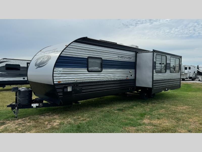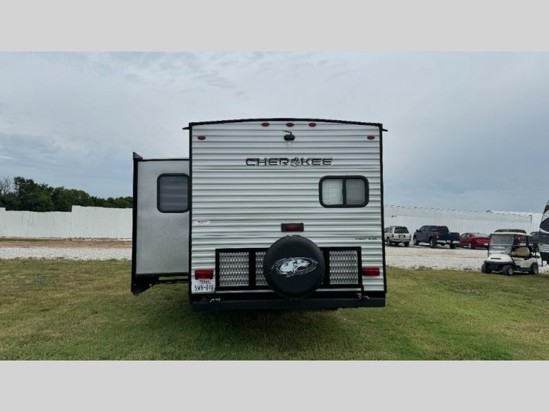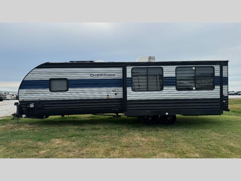 If the open road is calling your name, then answer it with one of these Forest River Cherokee travel trailers or toy haulers! A seamless roofing membrane with heat reflectivity covers these units and an armored underbelly tank enclosure protects it from road debris. The Power Gear frame technology holds them together and also comes with a space saver rail design. An outside shower with hot and cold water helps to keep the dirt outside where it belongs. With the Campfire package, you will get a beautiful entertainment center to watch your favorite movies, a sink cover for more prepping space, and a 6 gallon DSI gas/electric water heater for hot showers each morning. The Cherokee Total Control app and remote control system allows you to control your unit at the touch of a finger. A few other features you will appreciate include a super kitchen, USB charging station, and light filtering sheer shading premium blackout zebra shades for added privacy. Come find your favorite model today!
