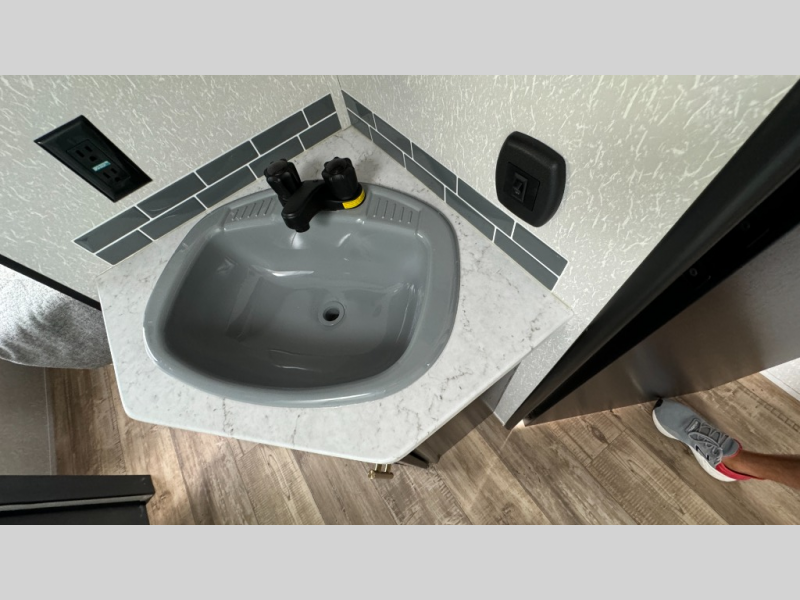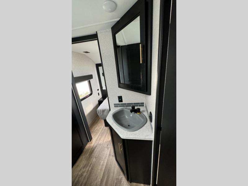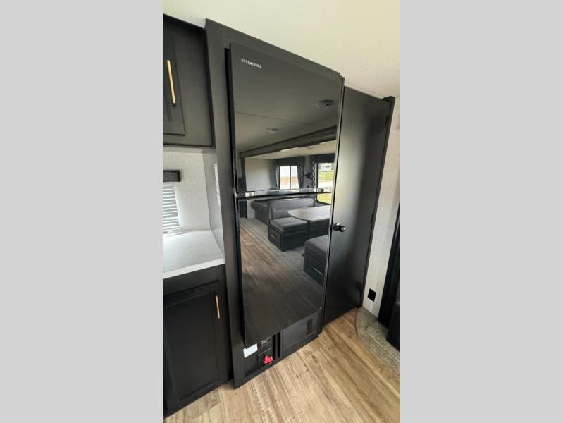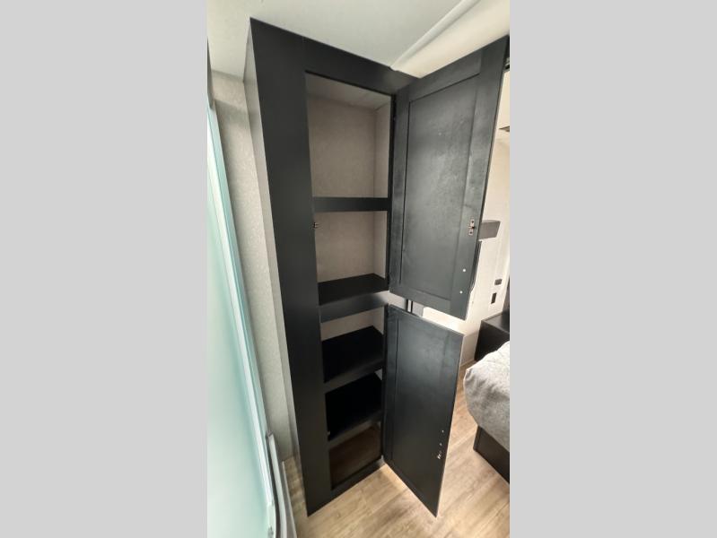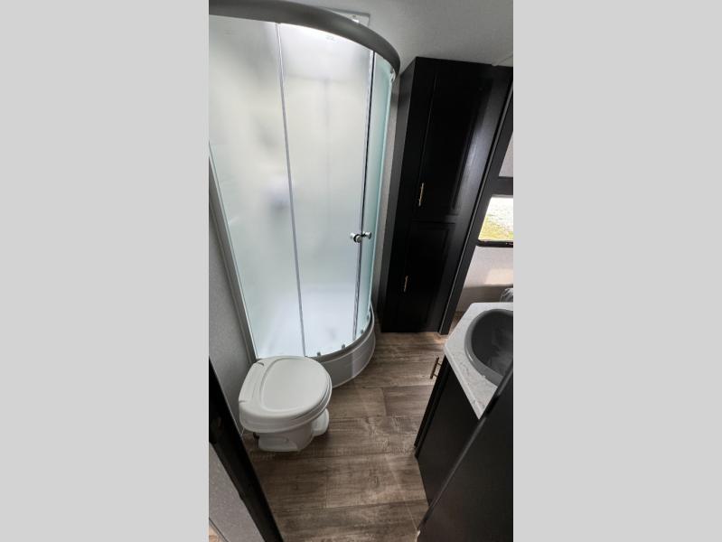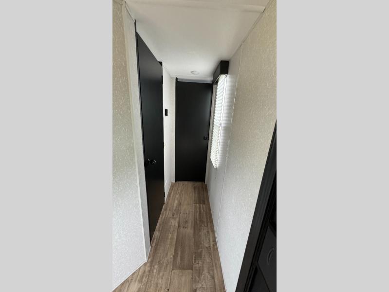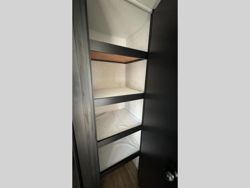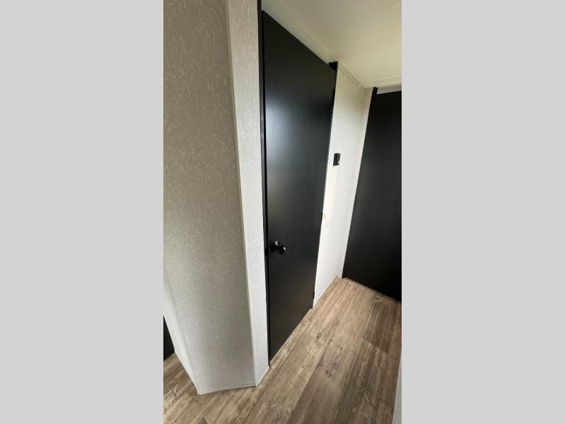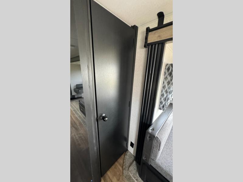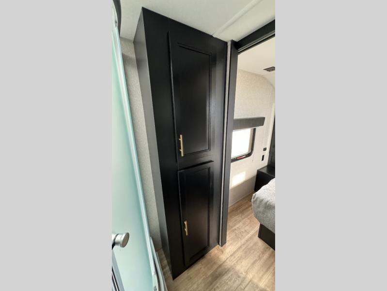 What I liked most: Doors have a bead board look to them adding character. Dark wood cabinetry with brushed nickel hardware looks classy. Two doors into bathroom. Lots of light from windows. Rear kitchen area has decent counter space. Full size pantry with actual hinged door. A travel trailer I could live in for a bit.
