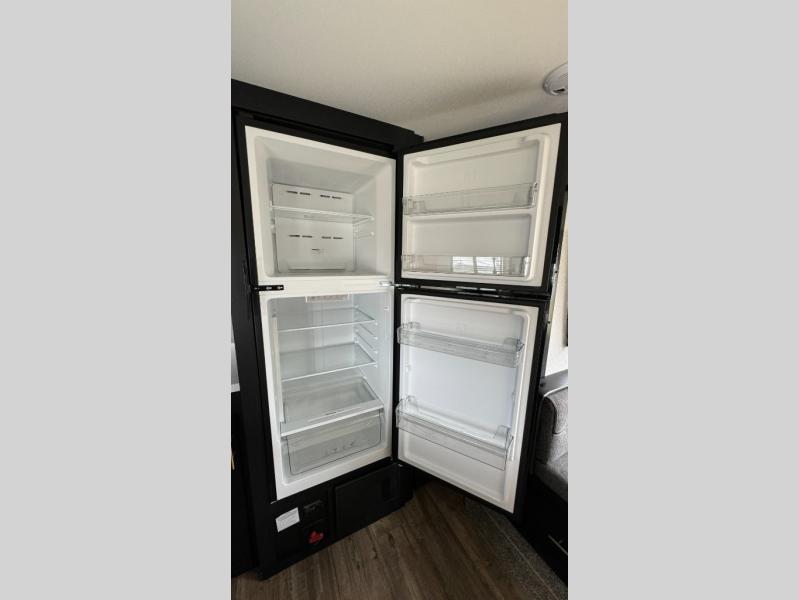 The chef will love cooking in this travel trailer! It not only has a rear kitchen with a large pantry, three burner cooktop with oven, and a Cannon high efficiency 11 cu. ft. refrigerator with travel lock, but also an outside kitchen with a two burner cooktop, a refrigerator, and a sink for clean up. The two recliners and sofa have a good view of the entertainment center with a TV mount and fireplace to enjoy at night. The booth dinette offers a comfortable place to enjoy meals and even transform into an extra sleeping space, plus it has two 40" storage drawers to store games, blankets, and extra cooking essentials. The dual entry bathroom has a radius shower to freshen up in, a linen closet to keep your towels close by, and an entrance into the front private bedroom which has a walk around queen bed with wardrobes on either side to hang your clothes!