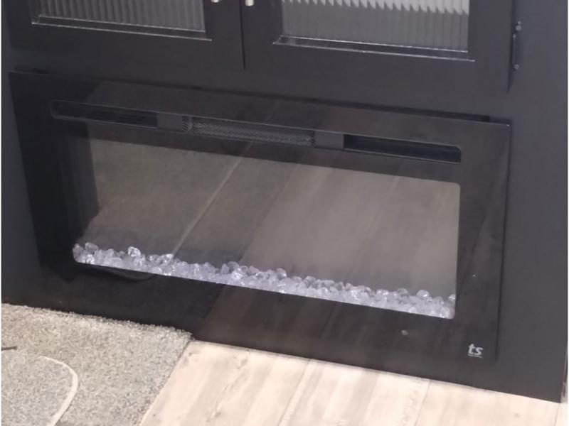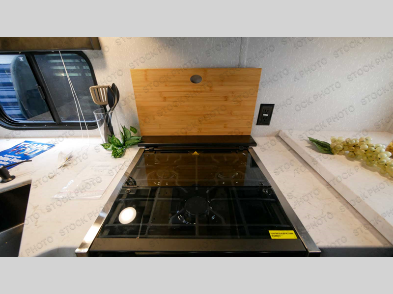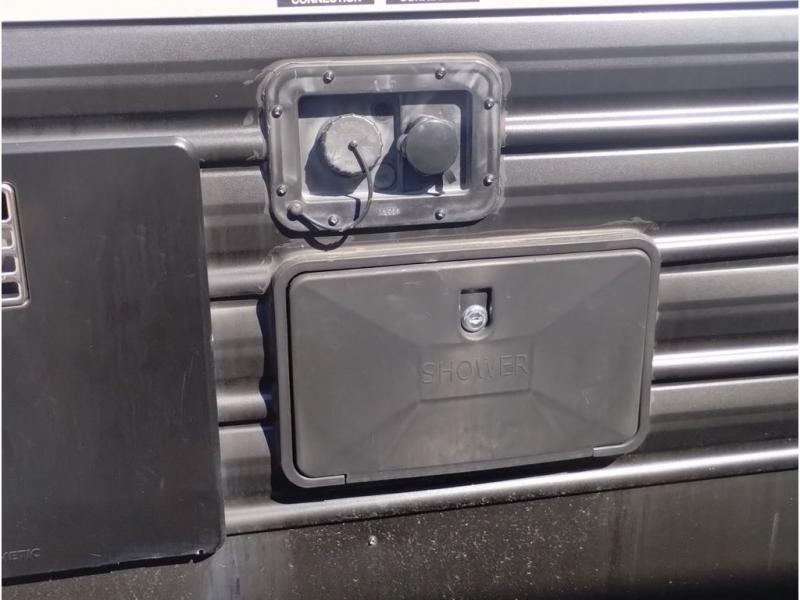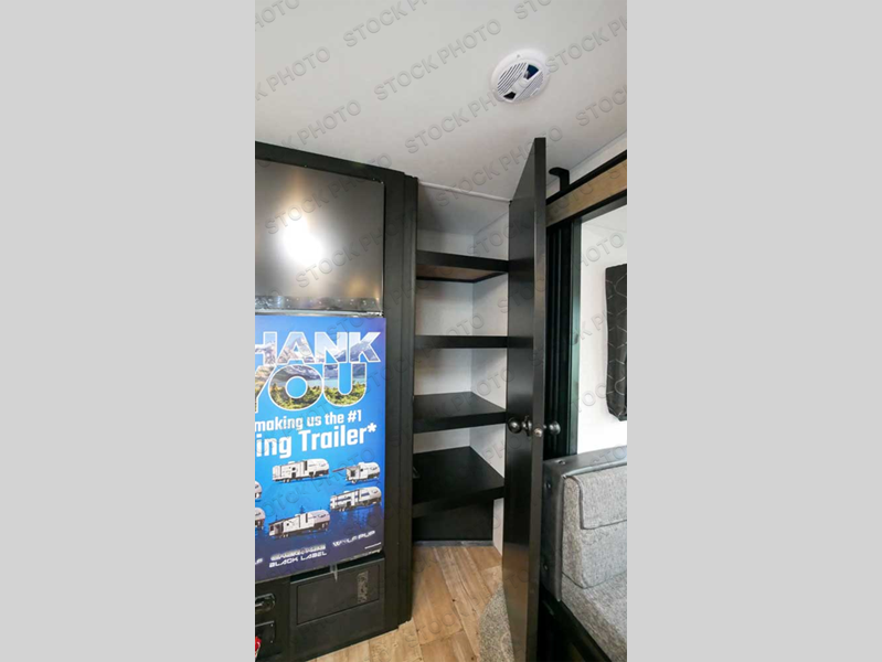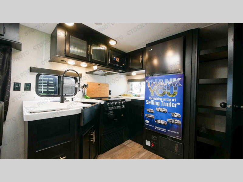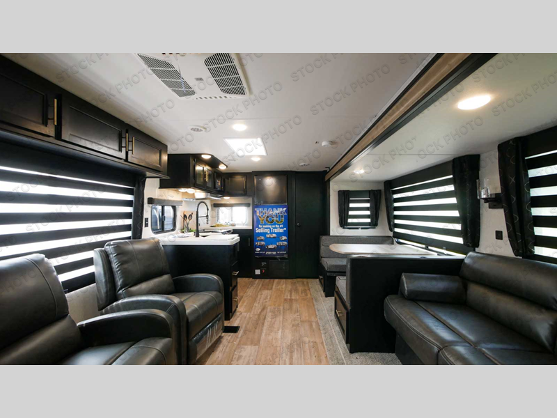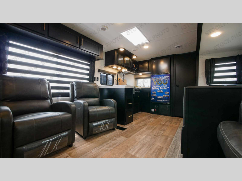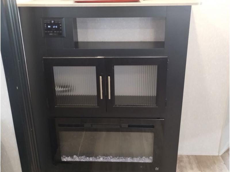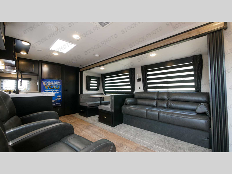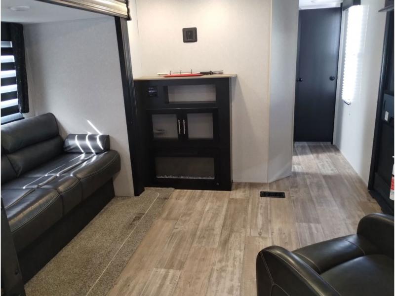 The chef will love cooking in this travel trailer! It not only has a rear kitchen with a large pantry, three burner cooktop with oven, and a Cannon high efficiency 11 cu. ft. refrigerator with travel lock, but also an outside kitchen with a two burner cooktop, a refrigerator, and a sink for clean up. The two recliners and sofa have a good view of the entertainment center with a TV mount and fireplace to enjoy at night. The booth dinette offers a comfortable place to enjoy meals and even transform into an extra sleeping space, plus it has two 40" storage drawers to store games, blankets, and extra cooking essentials. The dual entry bathroom has a radius shower to freshen up in, a linen closet to keep your towels close by, and an entrance into the front private bedroom which has a walk around queen bed with wardrobes on either side to hang your clothes!
