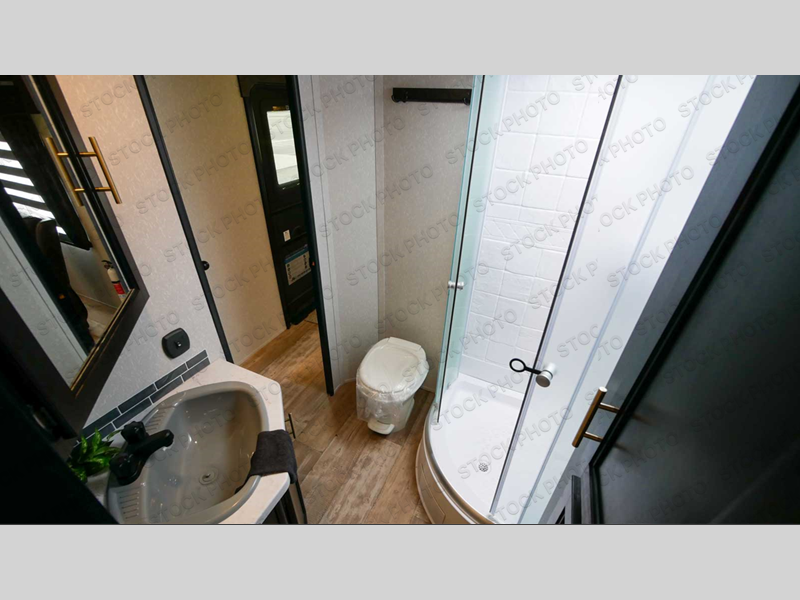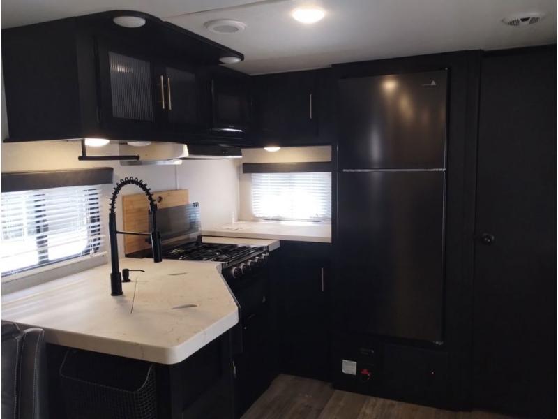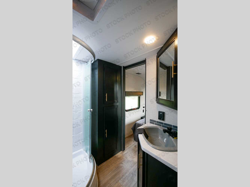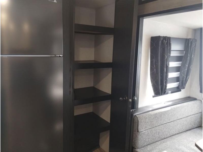 What I liked most: Doors have a bead board look to them adding character. Dark wood cabinetry with brushed nickel hardware looks classy. Two doors into bathroom. Lots of light from windows. Rear kitchen area has decent counter space. Full size pantry with actual hinged door. A travel trailer I could live in for a bit.