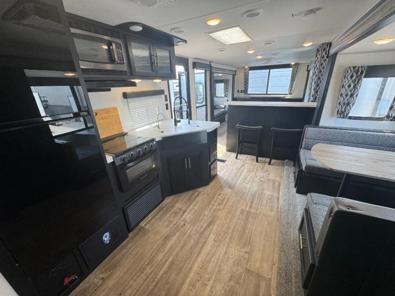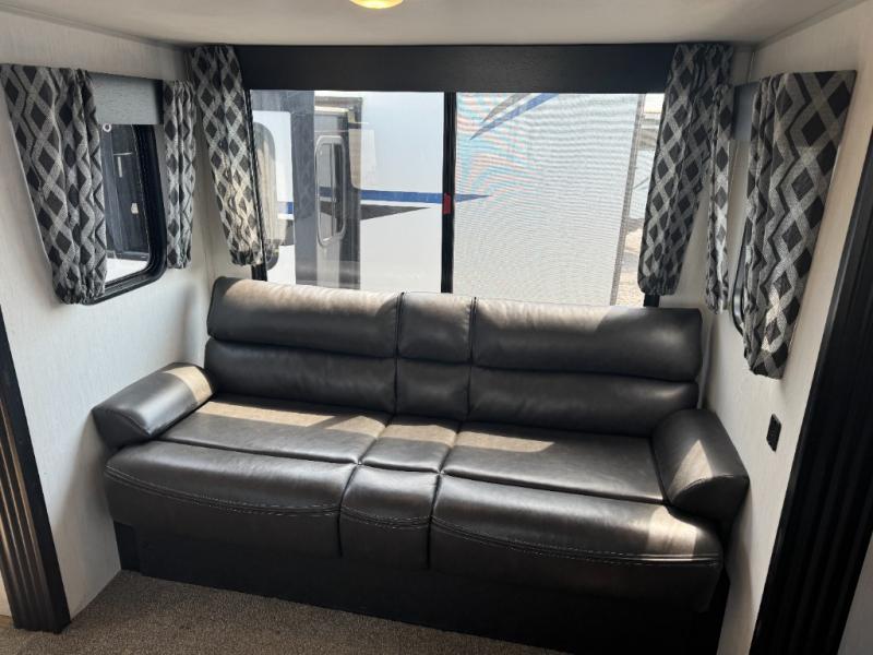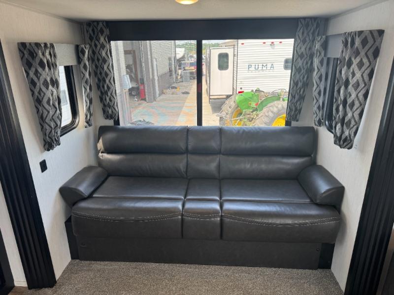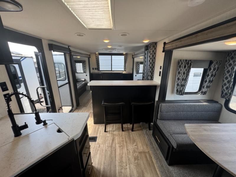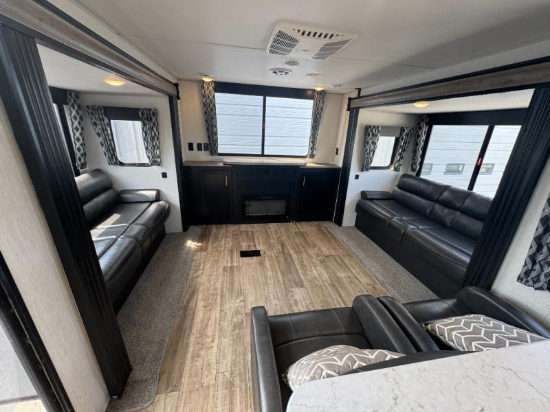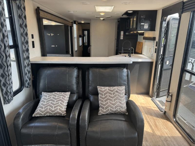 Affordable luxury and livability is what you will find in this travel trailer! The rear living area has opposing sofa slides, two recliners, a rear entertainment center with a fireplace, and panoramic windows for added natural lighting. There is even a bar top with two bar stools overlooking the living area so you can enjoy a meal and a movie. The booth dinette slide has a full door pantry next to it so you can quickly grab a snack during game night. Freshen up each morning in the full bathroom with the shower with a seat. The front private bedroom has a walk around queen bed for a good night's rest and a linen closet with an area prepped to add the optional washer and dryer. You even have an outside kitchen, a rear storage rack, outside storage areas, and an outside TV mount!