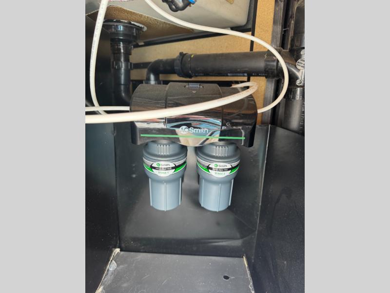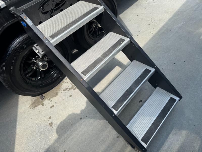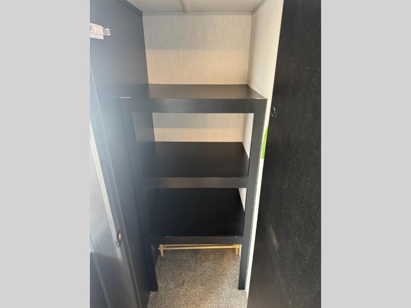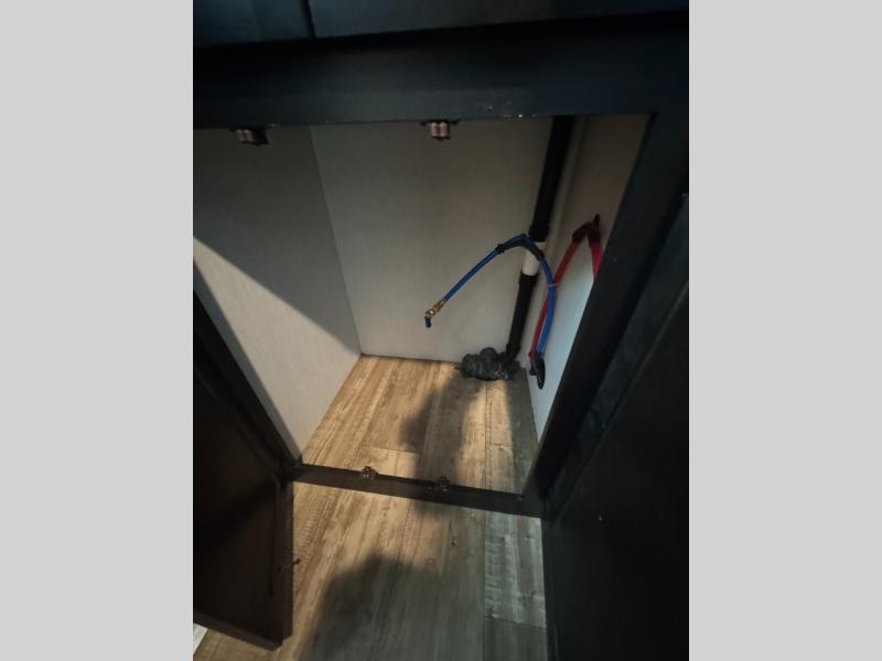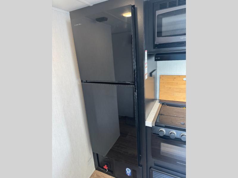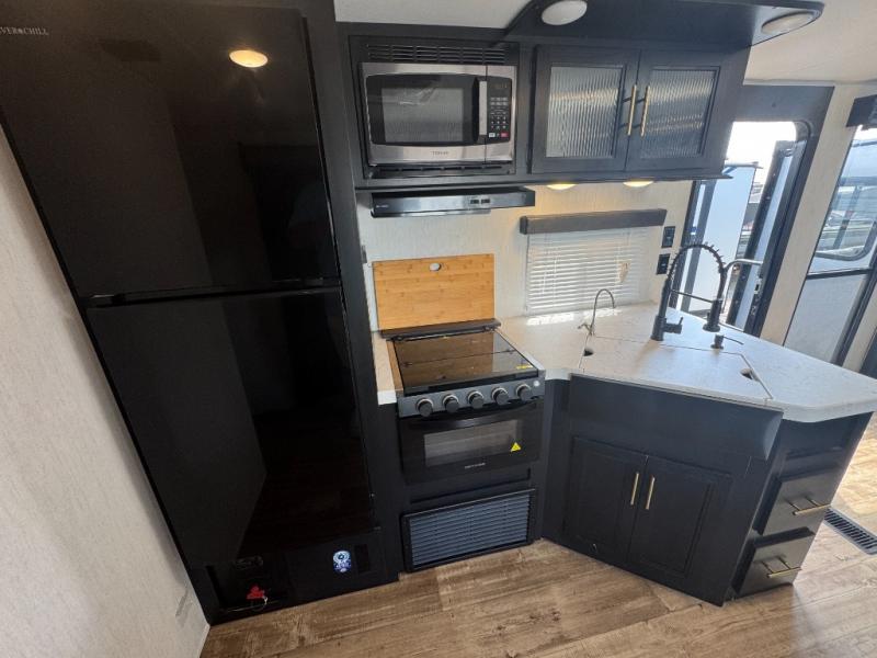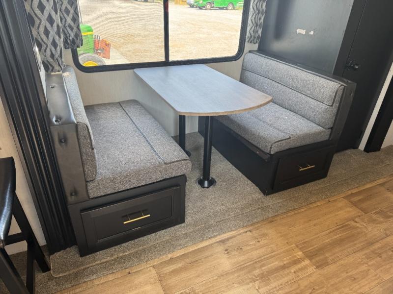 Affordable luxury and livability is what you will find in this travel trailer! The rear living area has opposing sofa slides, two recliners, a rear entertainment center with a fireplace, and panoramic windows for added natural lighting. There is even a bar top with two bar stools overlooking the living area so you can enjoy a meal and a movie. The booth dinette slide has a full door pantry next to it so you can quickly grab a snack during game night. Freshen up each morning in the full bathroom with the shower with a seat. The front private bedroom has a walk around queen bed for a good night's rest and a linen closet with an area prepped to add the optional washer and dryer. You even have an outside kitchen, a rear storage rack, outside storage areas, and an outside TV mount!