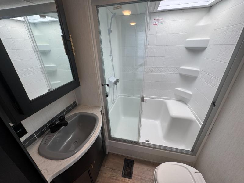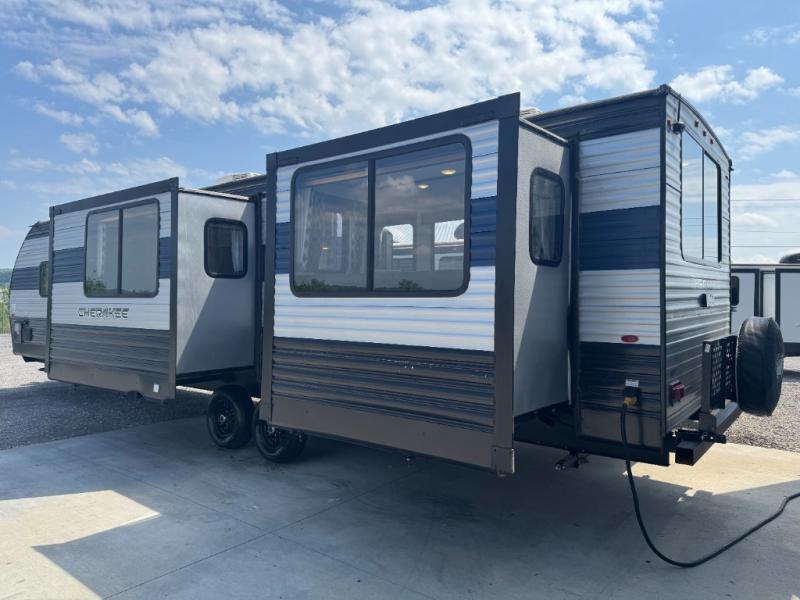 If the open road is calling your name, then answer it with one of these Forest River Cherokee travel trailers or toy haulers! A seamless roofing membrane with heat reflectivity covers these units and an armored underbelly tank enclosure protects it from road debris. The Power Gear frame technology holds them together and also comes with a space saver rail design. An outside shower with hot and cold water helps to keep the dirt outside where it belongs. With the Campfire package, you will get a beautiful entertainment center to watch your favorite movies, a sink cover for more prepping space, and a 6 gallon DSI gas/electric water heater for hot showers each morning. The Cherokee Total Control app and remote control system allows you to control your unit at the touch of a finger. A few other features you will appreciate include a super kitchen, USB charging station, and light filtering sheer shading premium blackout zebra shades for added privacy. Come find your favorite model today!
