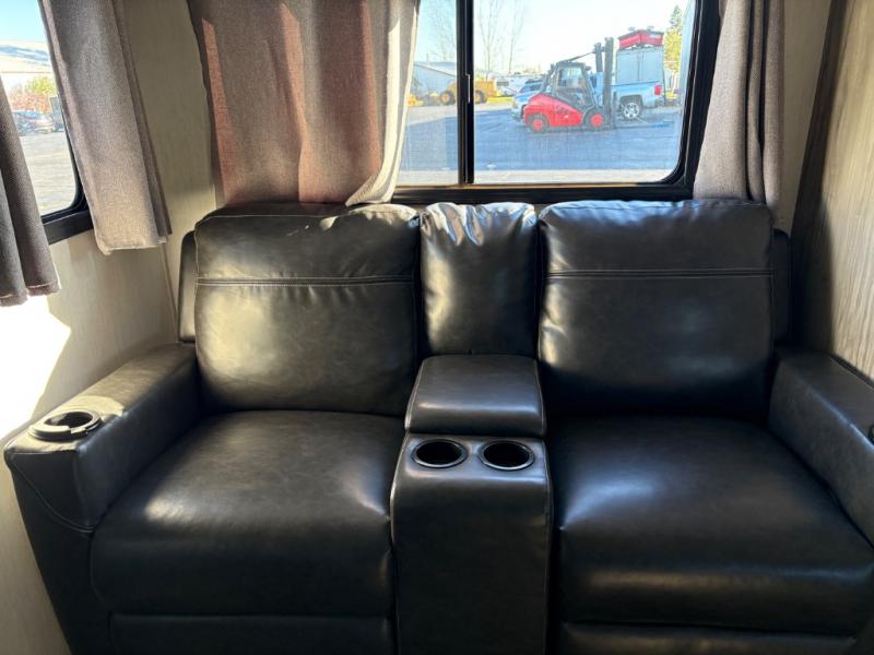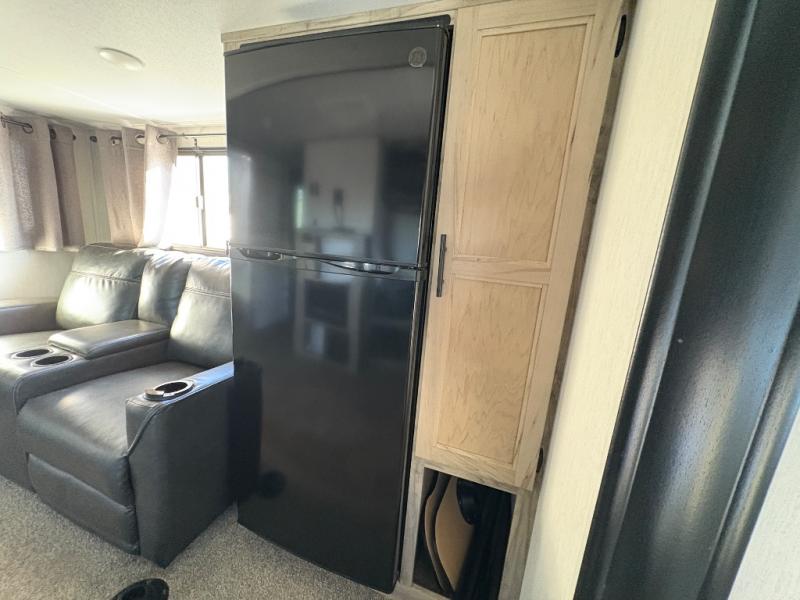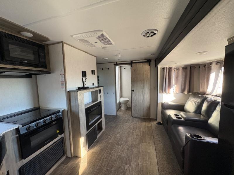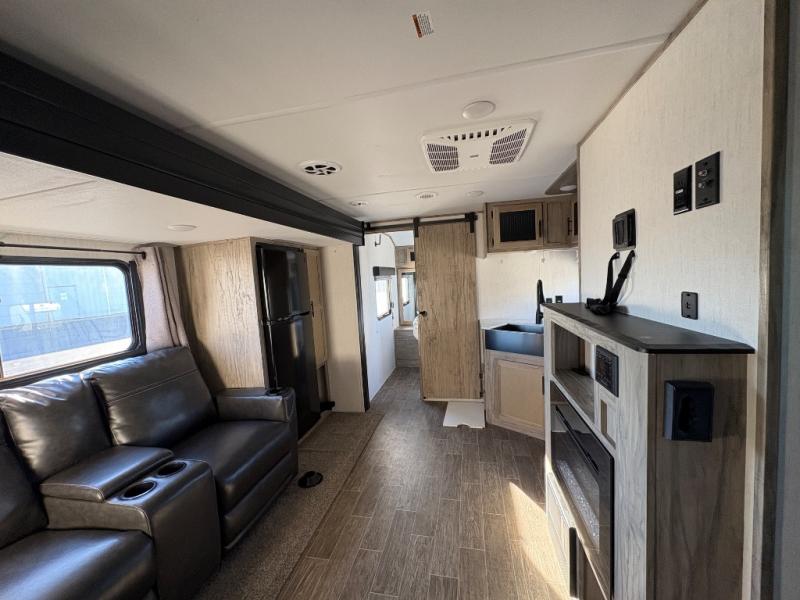 Looking for the perfect trailer for two with a spacious bathroom and bedroom? This Alpha Wolf provides a rear oversized bathroom complete with linen storage and a barn-style door that saves space and looks great. The front bedroom includes a walk-around queen bed, dual shirt closets and nightstands, a farm-style door plus windows for natural lighting and great views. The main living and kitchen area is spacious as well with a slide out that includes home theatre seating with removable dinner trays and cupholders plus heat, light and massage function, a residential refrigerator for lots of cold storage and a pantry for your snacks and such. Everyone will love the fireplace and cozy ambiance. The cook will appreciate the extra floor space provided by the slide when using all of the kitchen amenities including a farm-style sink, walk-in pantry, and butcher block style cutting board.