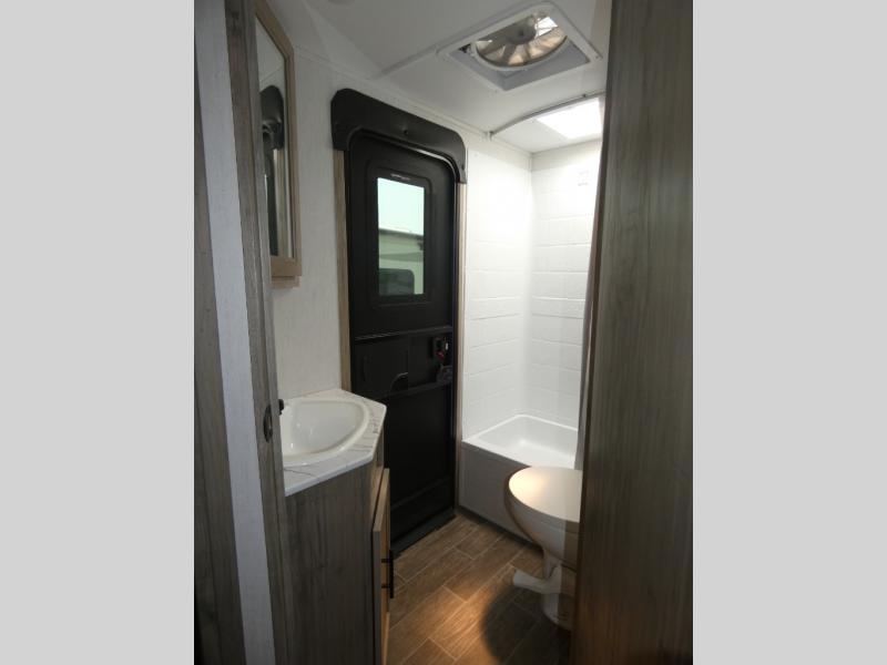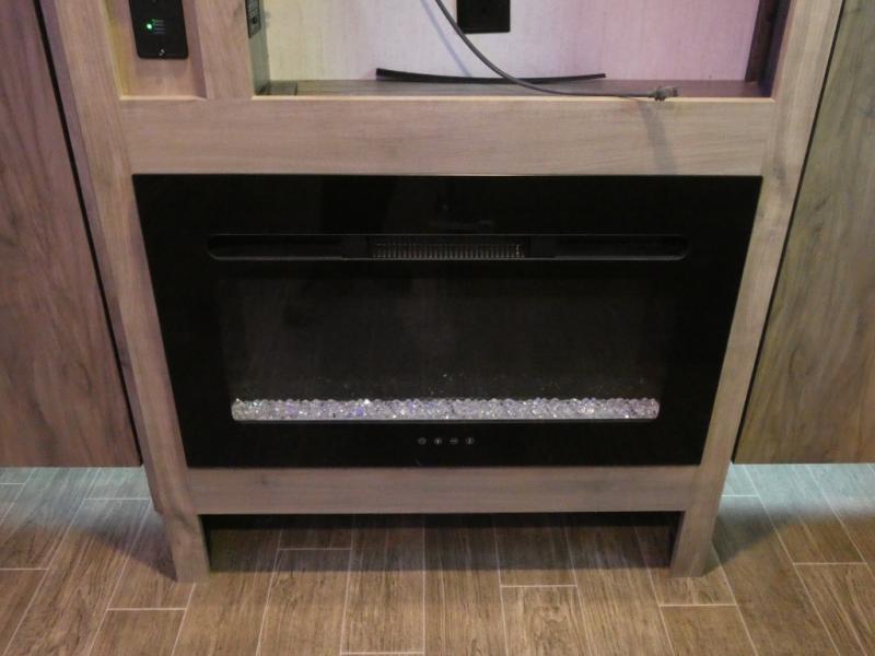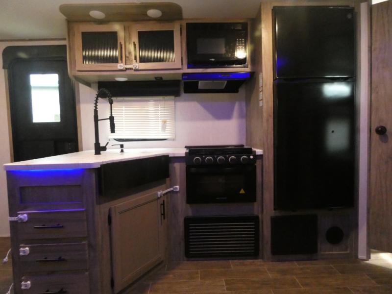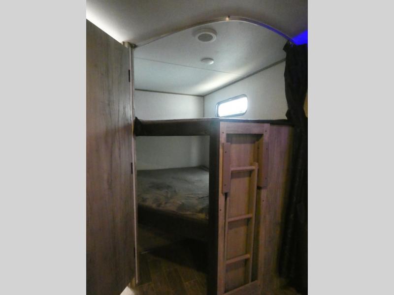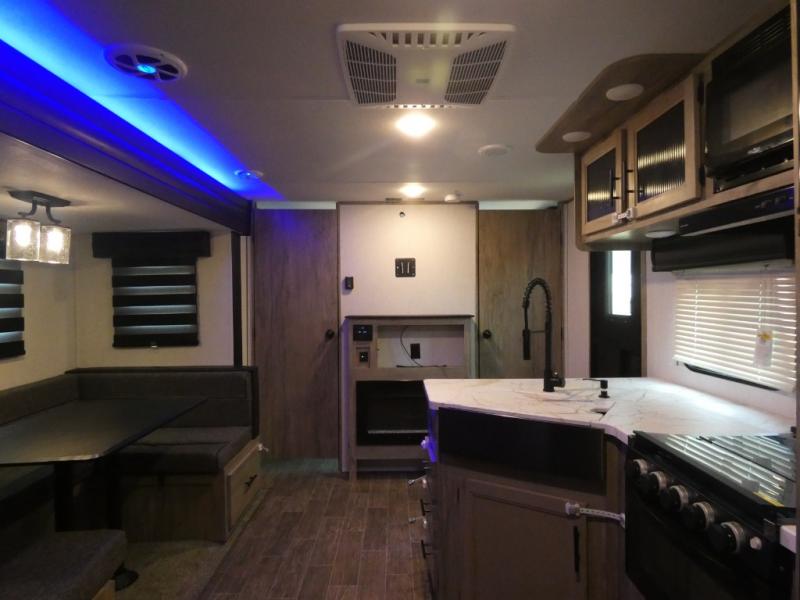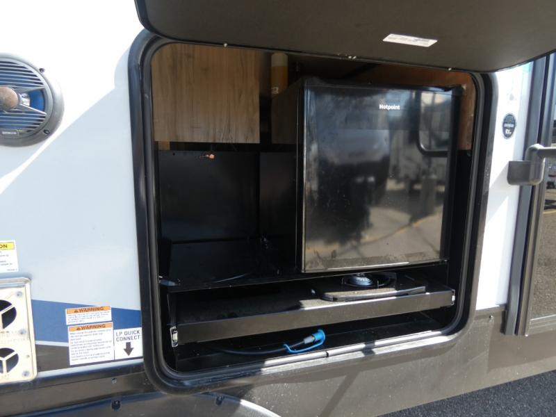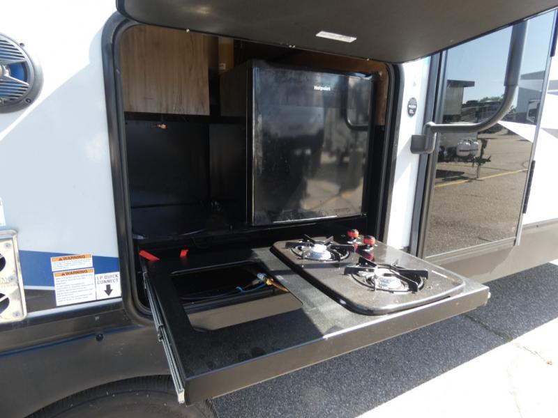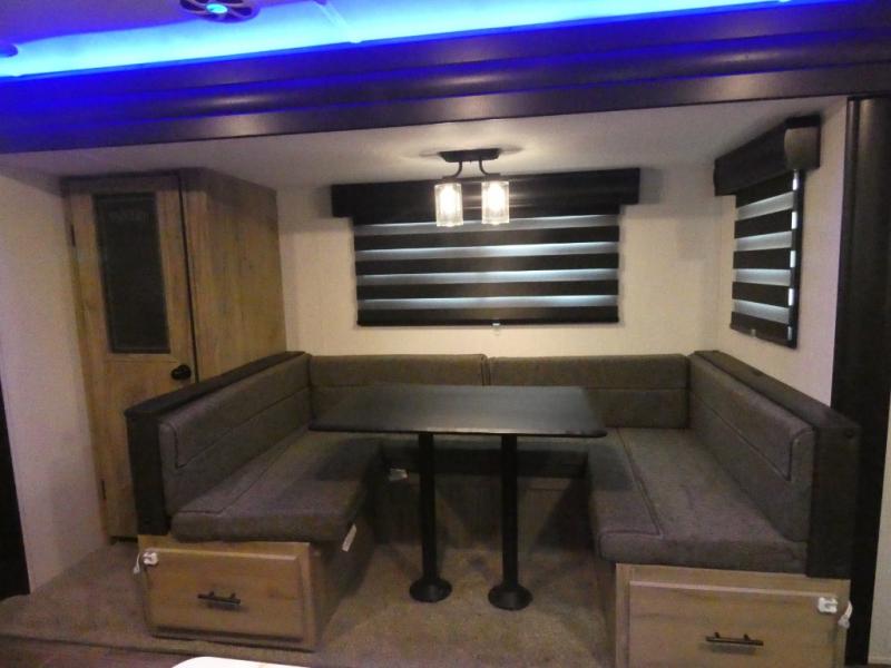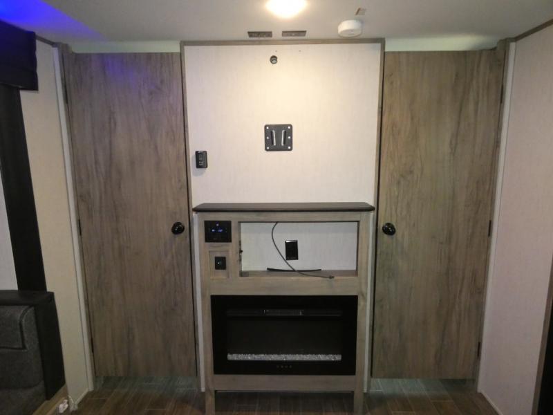 Get ready for fun with your group in this multi-sleeper trailer that offers double-sized bunks with a ladder next to a full bathroom which features a second exterior entry door for convenience when hanging outside under the 20' exterior awning. The camp chef will appreciate a deluxe outside kitchen, and full the full pass-through storage will make it easy to keep things neatly tucked away when not in use. Back inside, there is a super U-dinette for dining, playing games and this furniture provides extra sleeping space as well. You will also find a walk-in pantry and full kitchen amenities including a farm-style sink, a residential refrigerator, and a butcher block cutting board. The fireplace is another highlight in the main area, and the double entry bedroom takes you into your own space to sleep like a queen.