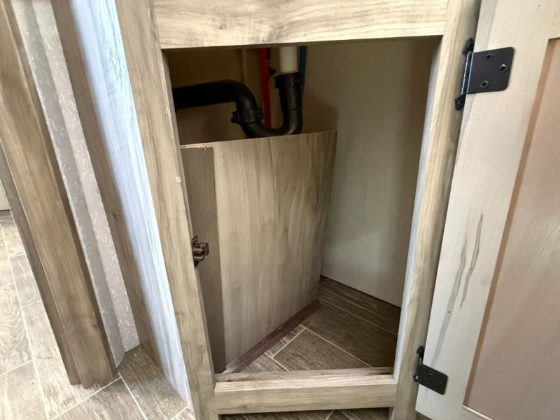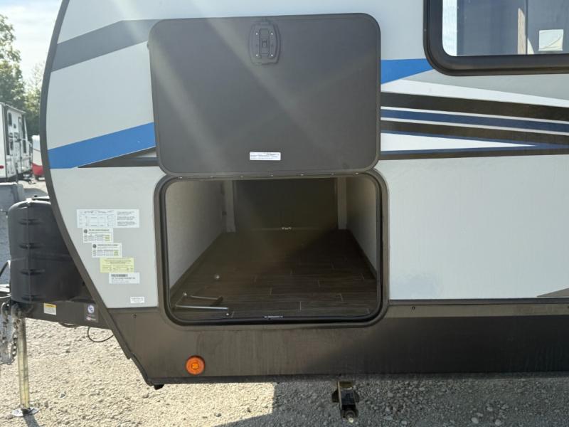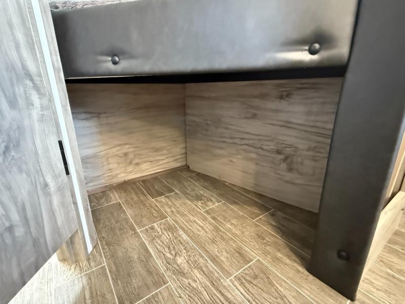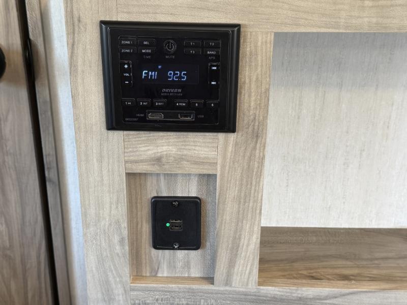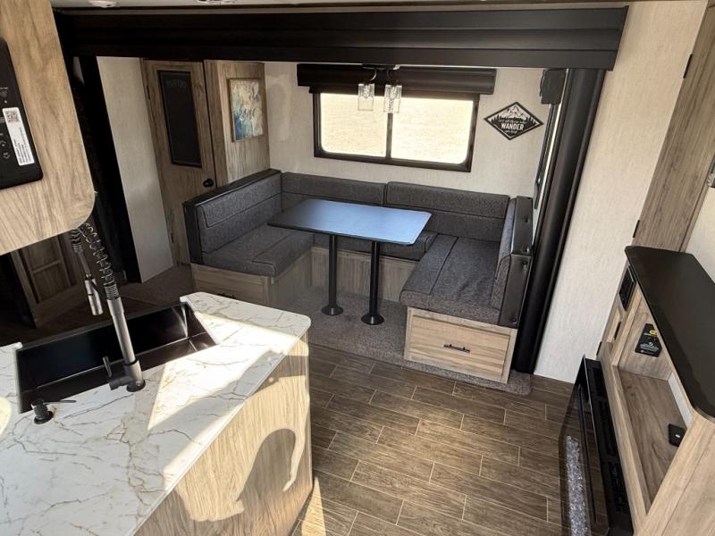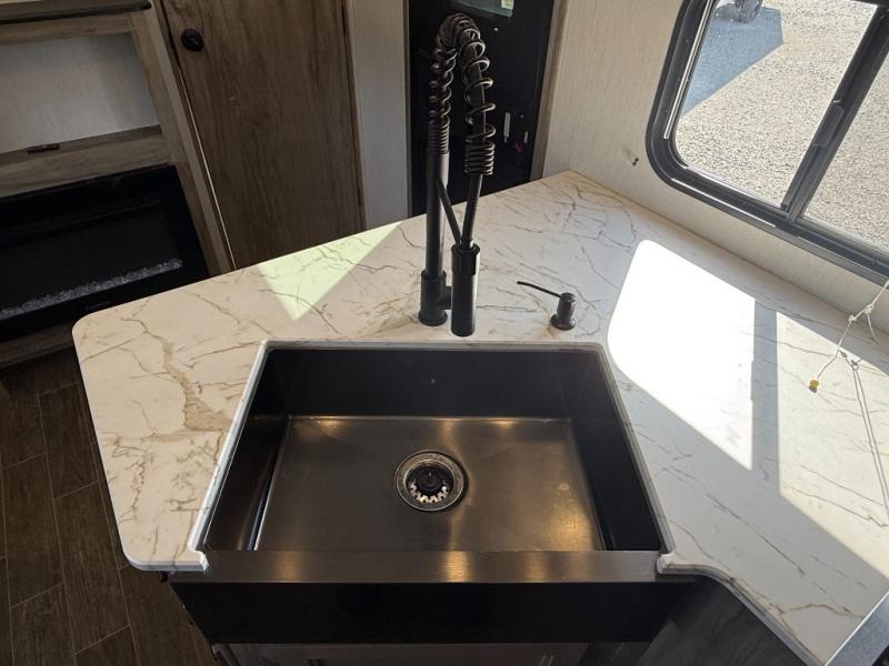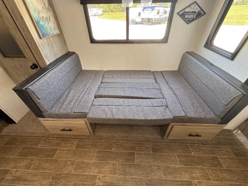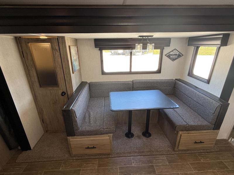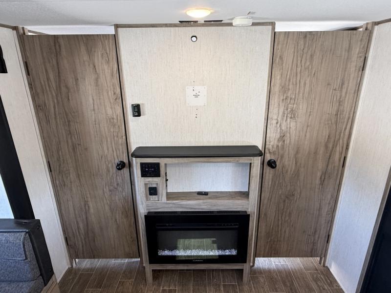 Get ready for fun with your group in this multi-sleeper trailer that offers double-sized bunks with a ladder next to a full bathroom which features a second exterior entry door for convenience when hanging outside under the 20' exterior awning. The camp chef will appreciate a deluxe outside kitchen, and full the full pass-through storage will make it easy to keep things neatly tucked away when not in use. Back inside, there is a super U-dinette for dining, playing games and this furniture provides extra sleeping space as well. You will also find a walk-in pantry and full kitchen amenities including a farm-style sink, a residential refrigerator, and a butcher block cutting board. The fireplace is another highlight in the main area, and the double entry bedroom takes you into your own space to sleep like a queen.