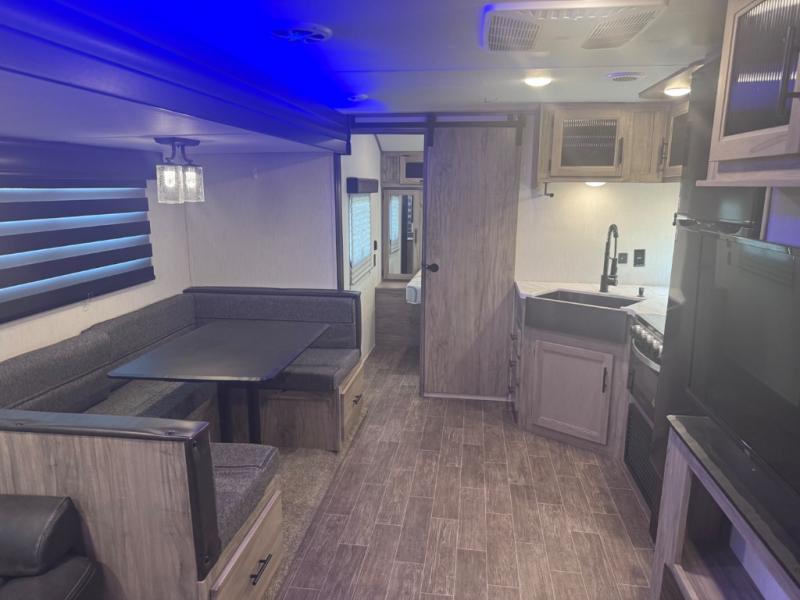 Whether you are a couple or family, this trailer will allow you to seek adventure and enjoy relaxation after hiking, fishing, and visiting with other RVers. The 20' exterior awning gives you an outdoor living area, the pass-through storage provides space for all your gear plus some, and the full outside kitchen includes a fridge/freezer, working sink, and cabinet storage. The interior is spacious thanks to the slide out in the main area that offers furniture to relax on, dine at, and even sleep on. You will also find an oversized rear bath with a barn-style entry door, and a robe/towel drop zone with linen storage above. The chef will love the walk-in pantry for non-perishables, the residential refrigerator, dual pots and pans drawers, and a farm-style sink. And the front bedroom offers an oasis through a barn-style door to enjoy a queen bed and clothing storage.
