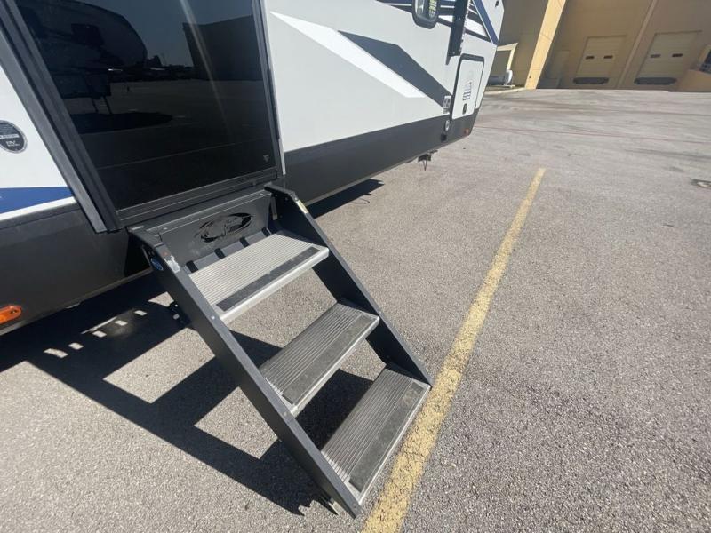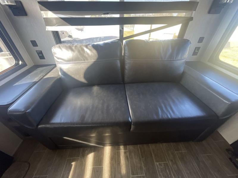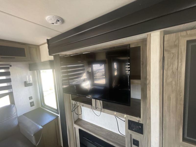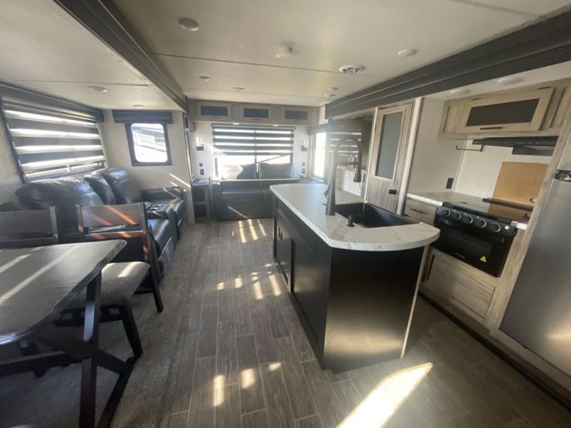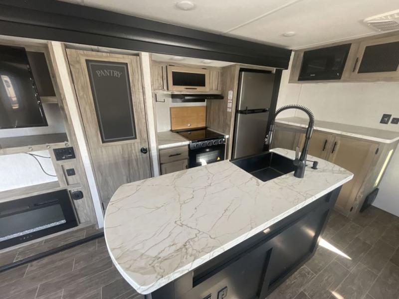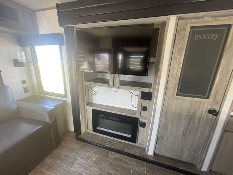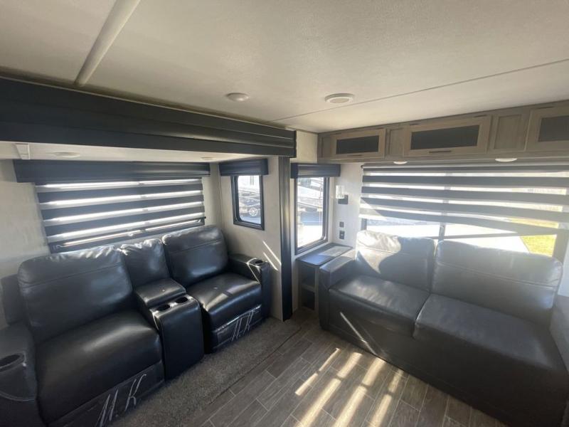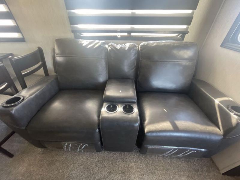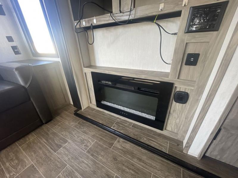This trailer has it all for maximum comfort and convenience as well as entertainment! The rear living area includes a deluxe tri-fold hide-a-bed sofa with a panoramic rear window for great views of your campsite, and dual opposing slides widen this area so you can visit with friends while sitting on the home theatre seats with heat, light, and massage function with cupholders, and/or the free-standing table with two fixed and two folding chairs. Enjoy the fireplace on a cool night or when you want a little ambiance while seated inside. In the kitchen, the island will be handy for food prep and serving, and the unique coffee bar will be a favorite as well. Two patio awnings will provide an outdoor living area, just grab your camping chairs from the full pass-through storage. When you call it a night, fall quickly to sleep on the queen bed in the front bedroom with easy access to a dual entry bathroom which offers a radius shower with opaque glass doors.