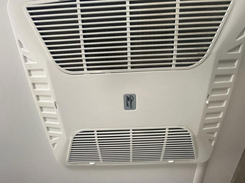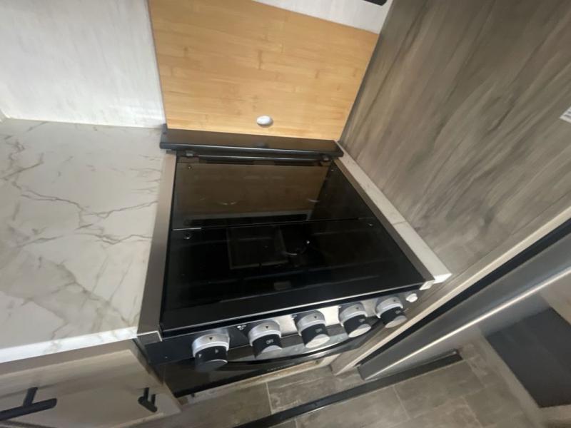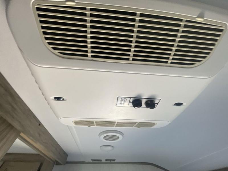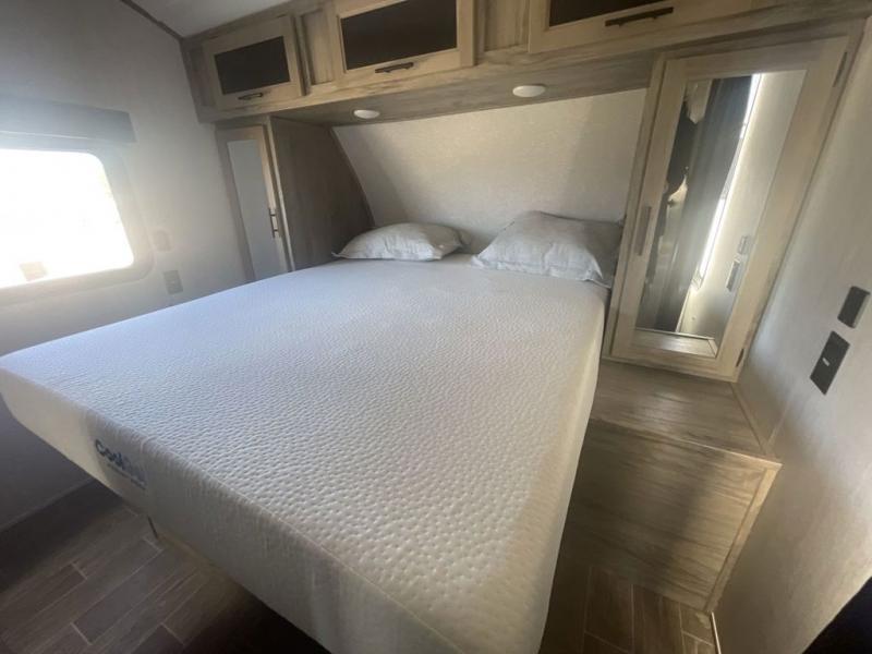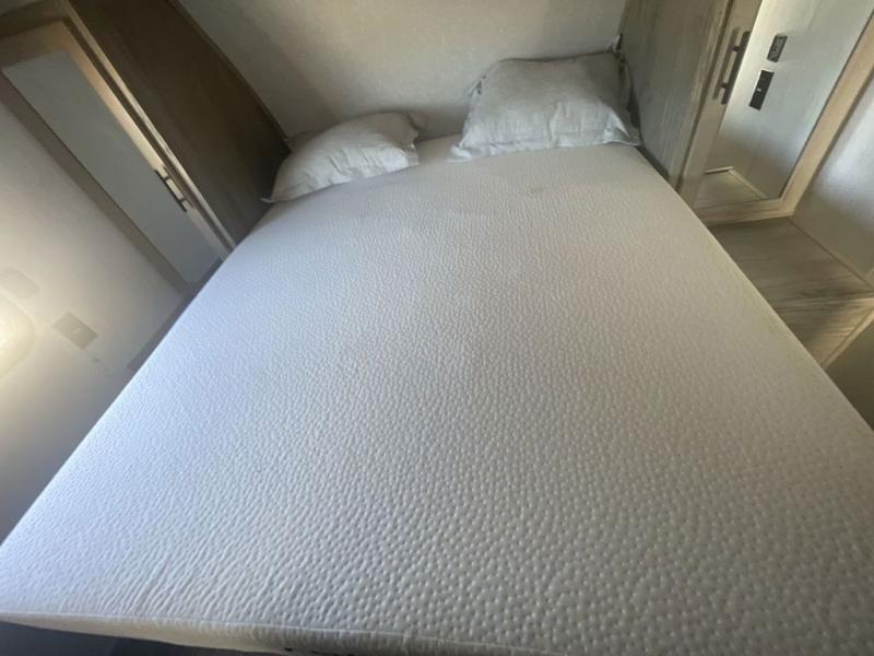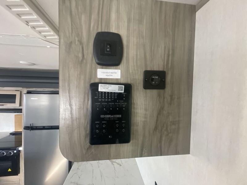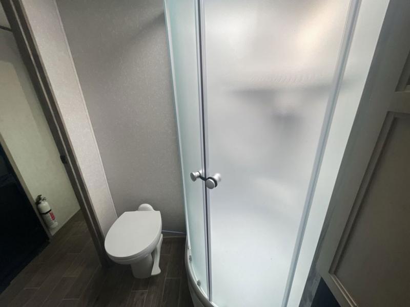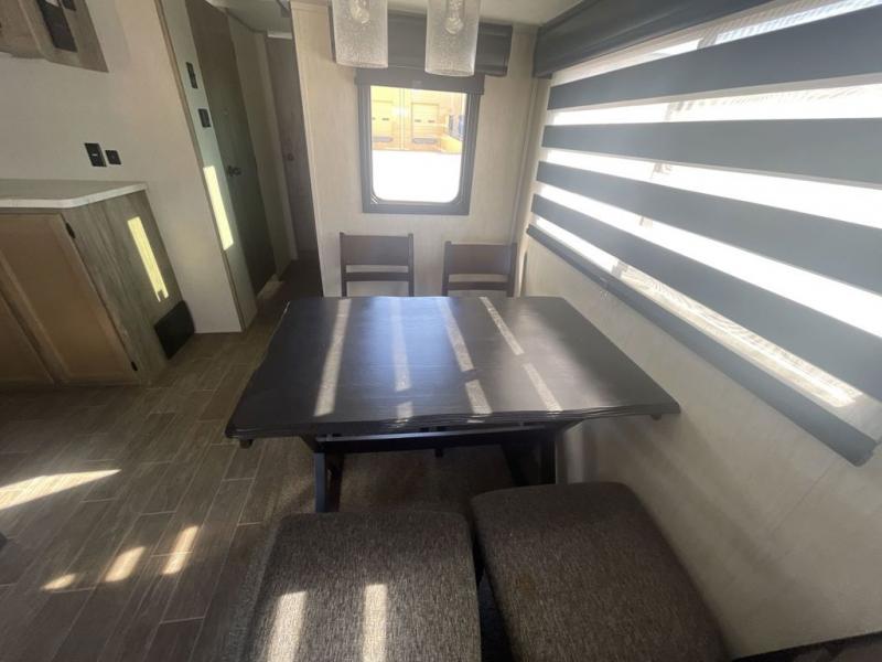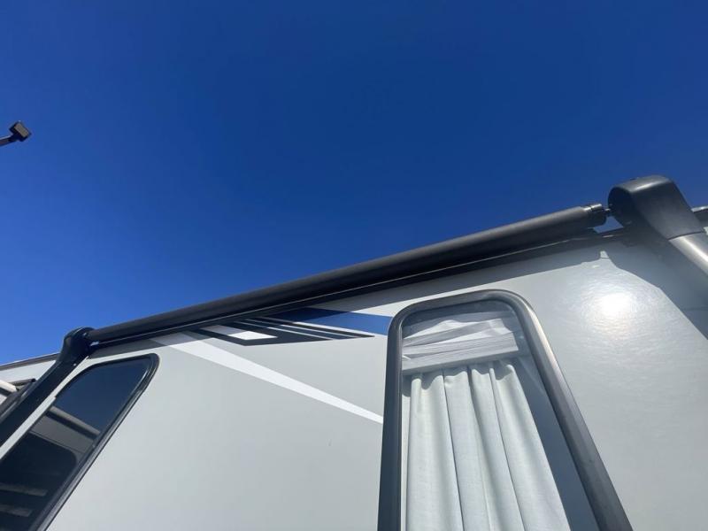 This trailer has it all for maximum comfort and convenience as well as entertainment! The rear living area includes a deluxe tri-fold hide-a-bed sofa with a panoramic rear window for great views of your campsite, and dual opposing slides widen this area so you can visit with friends while sitting on the home theatre seats with heat, light, and massage function with cupholders, and/or the free-standing table with two fixed and two folding chairs. Enjoy the fireplace on a cool night or when you want a little ambiance while seated inside. In the kitchen, the island will be handy for food prep and serving, and the unique coffee bar will be a favorite as well. Two patio awnings will provide an outdoor living area, just grab your camping chairs from the full pass-through storage. When you call it a night, fall quickly to sleep on the queen bed in the front bedroom with easy access to a dual entry bathroom which offers a radius shower with opaque glass doors.