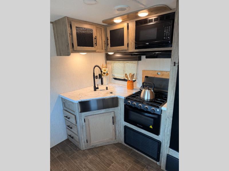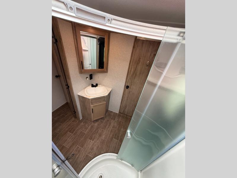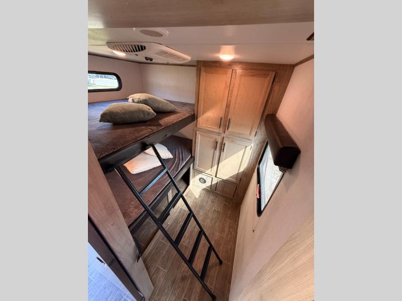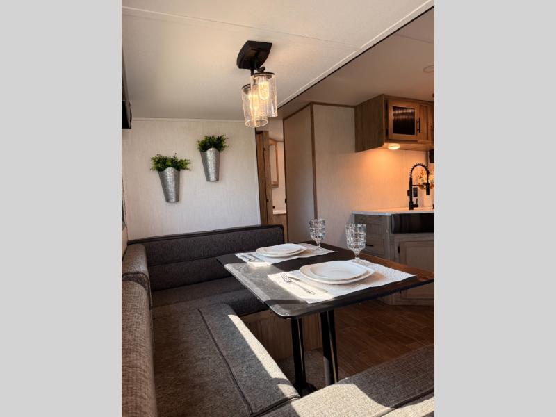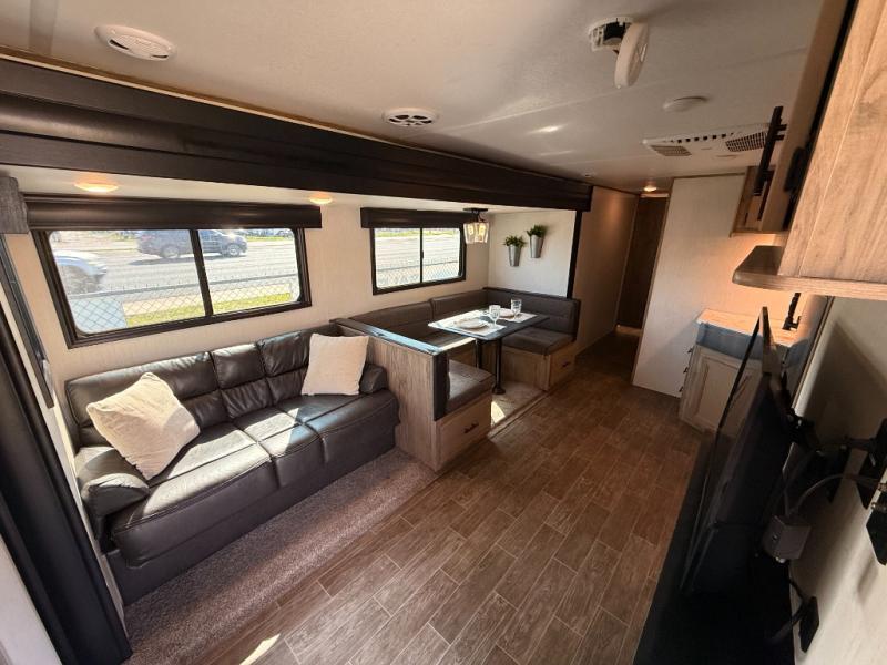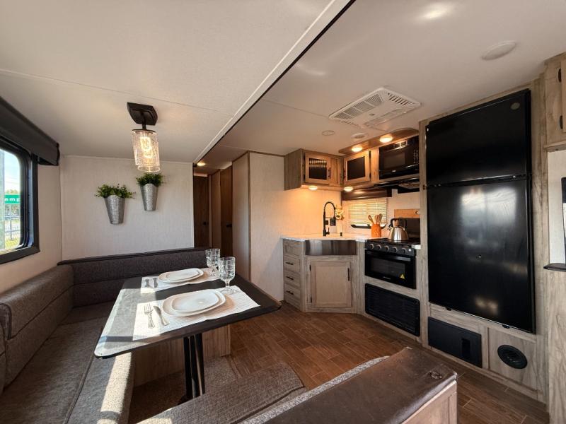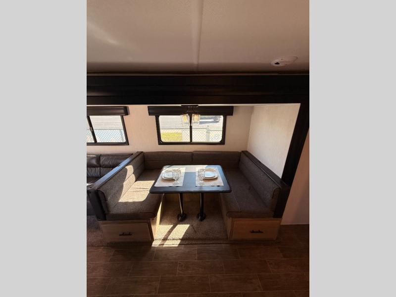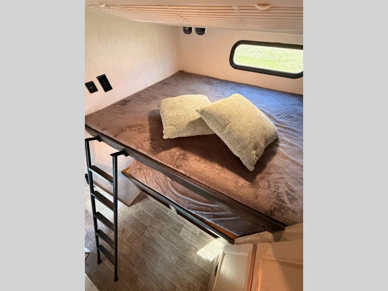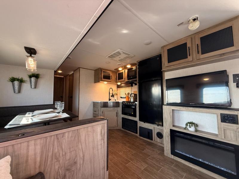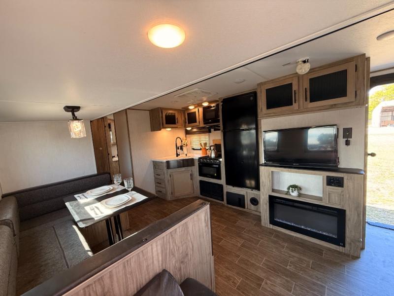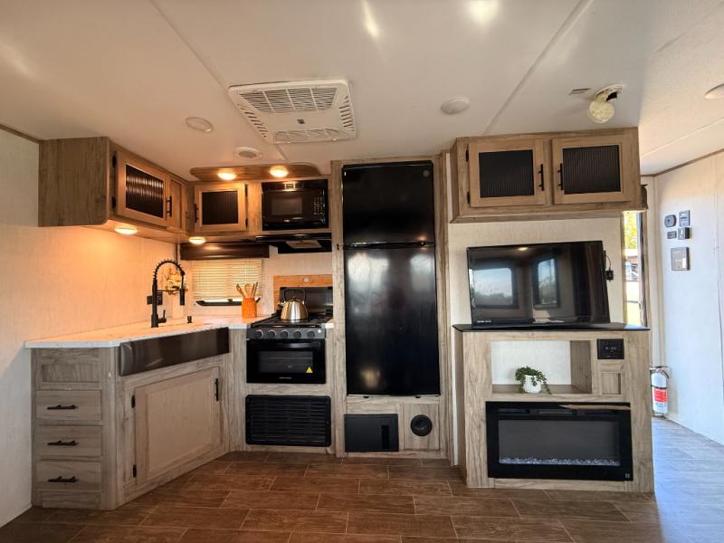 Privacy, convenience, comfort and a lot of space can be found in this trailer allowing you to relax and have fun away from your busy schedule! Whether you camp locally or far away, you will have all your own accommodations and space for your family and friends. The rear bunkhouse includes a barn-style door for easy entry, double-sized bunks with a ladder to sleep four, and a wardrobe for your clothes. You will have your own privacy in the front bedroom with a walk-around queen bed, dual shirt closets and nightstands, windows and access to the full bathroom with a radius shower and everything you need to stay refreshed. The main living and kitchen area has an L-shaped kitchen area with everything nearby including a farm-style sink, a residential refrigerator, and a walk-in pantry. You can relax at the jack knife sofa and super U-shaped dinette within the slide and enjoy the fireplace or the window views in the slide.