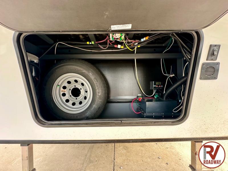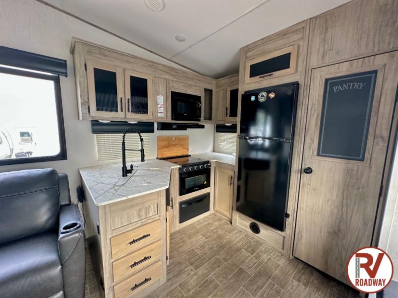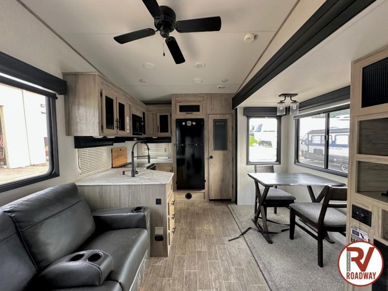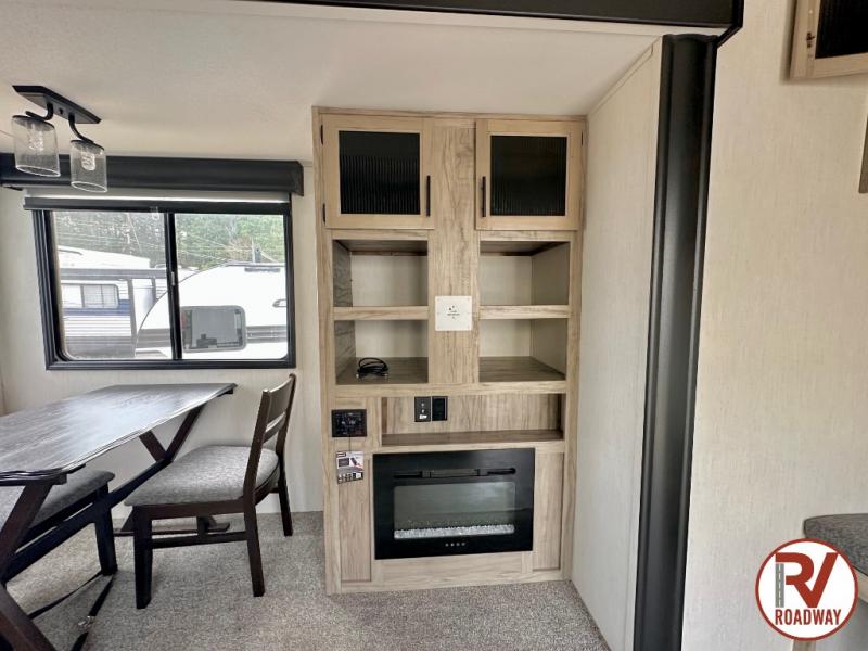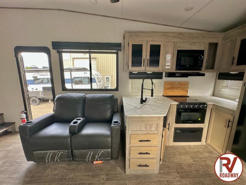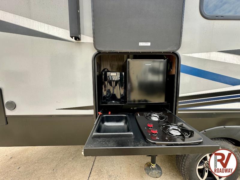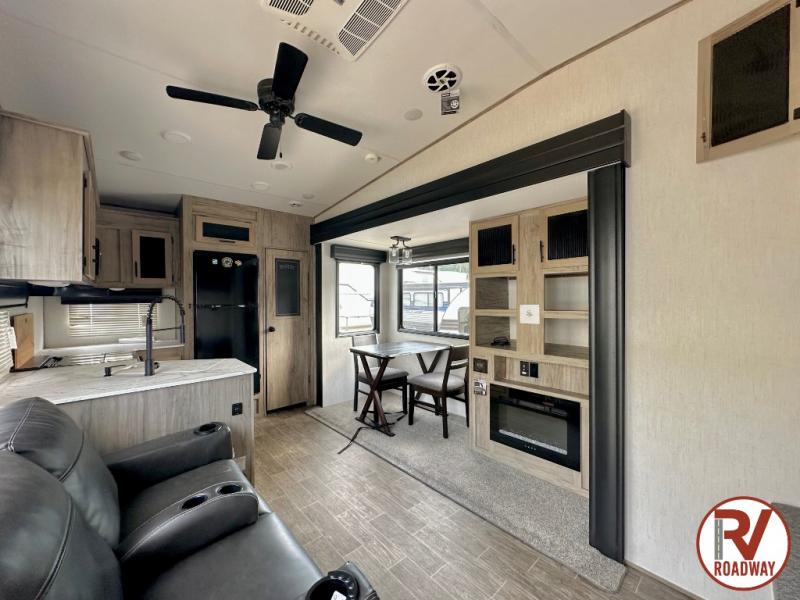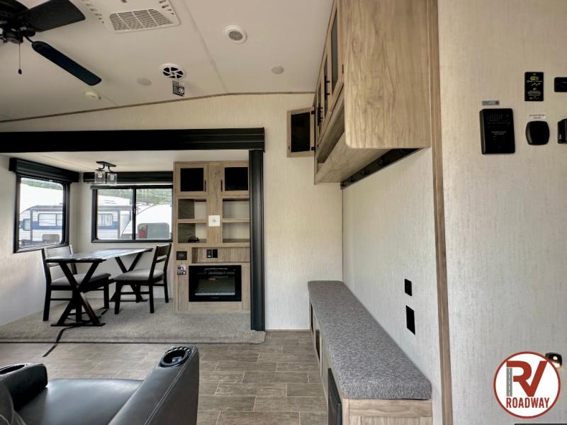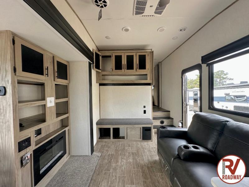 Are you interested in taking your camping game up a notch? If so, you'll certainly want to add this Cherokee Arctic Wolf fifth wheel to the roster! For a romantic getaway or guys' party weekend, this fifth wheel is 100% accommodating. Up at the front of this unit is a private bedroom where you will find great relaxation on the residential queen bed. Right next to the bedroom is a full bathroom that has everything you need to get ready like a pro each morning. The main living area is the big attraction on this unit because it is perfectly set up for lounging at your best. The home theater seating is across from the fireplace, and above the fireplace is an area prepped for a TV. You'll find a free-standing table with two fixed chairs and two folding chairs right next to the rear kitchen, so you can take in the sights and sounds of dinner being prepared as you socialize with the chef. Another great feature on this model is the entryway shoe storage and bench.