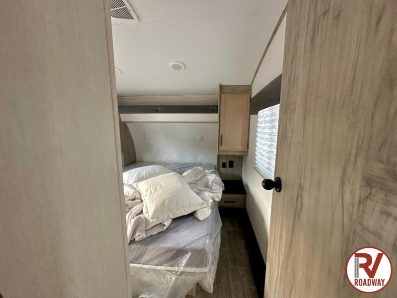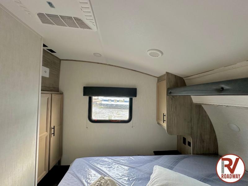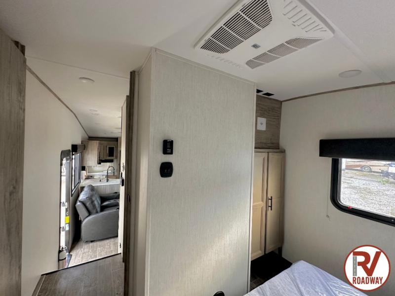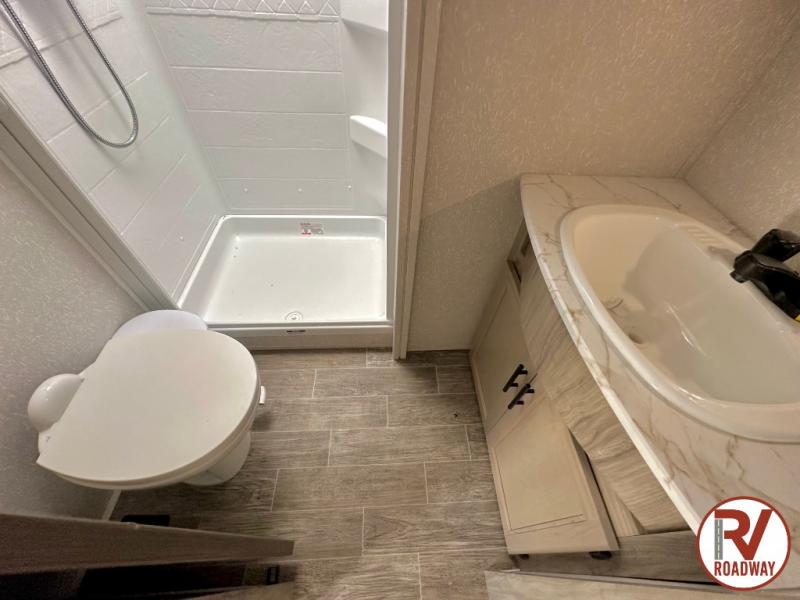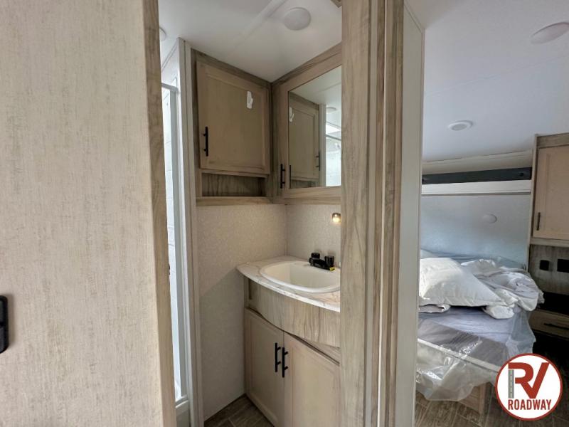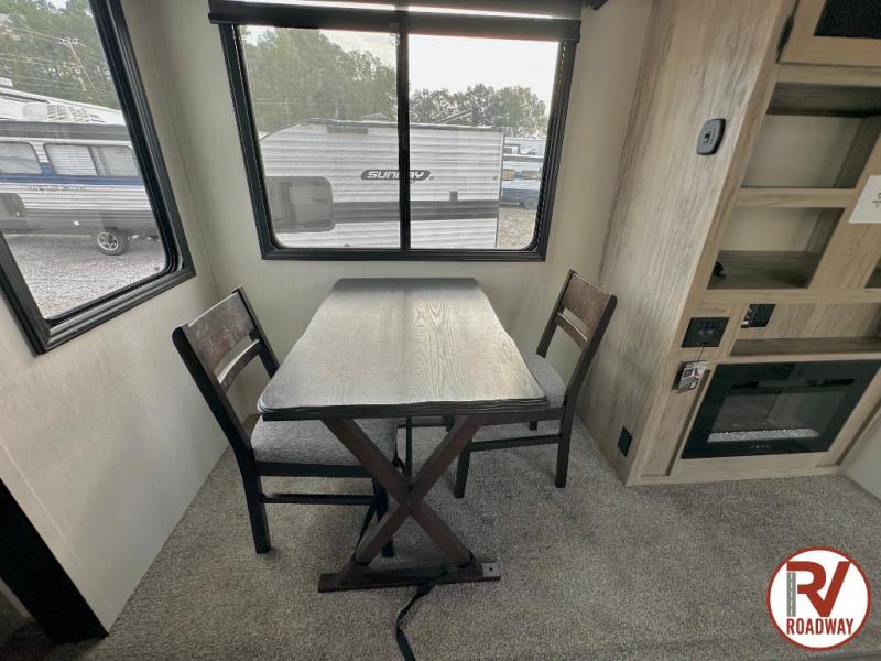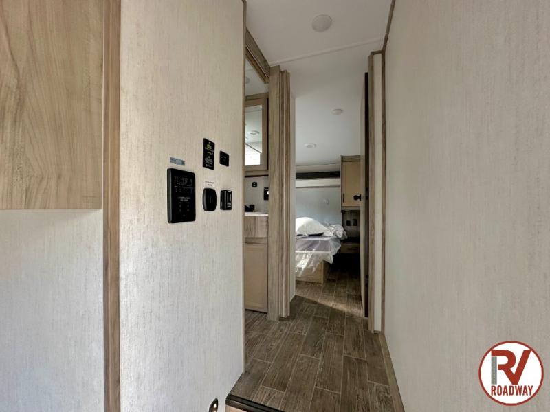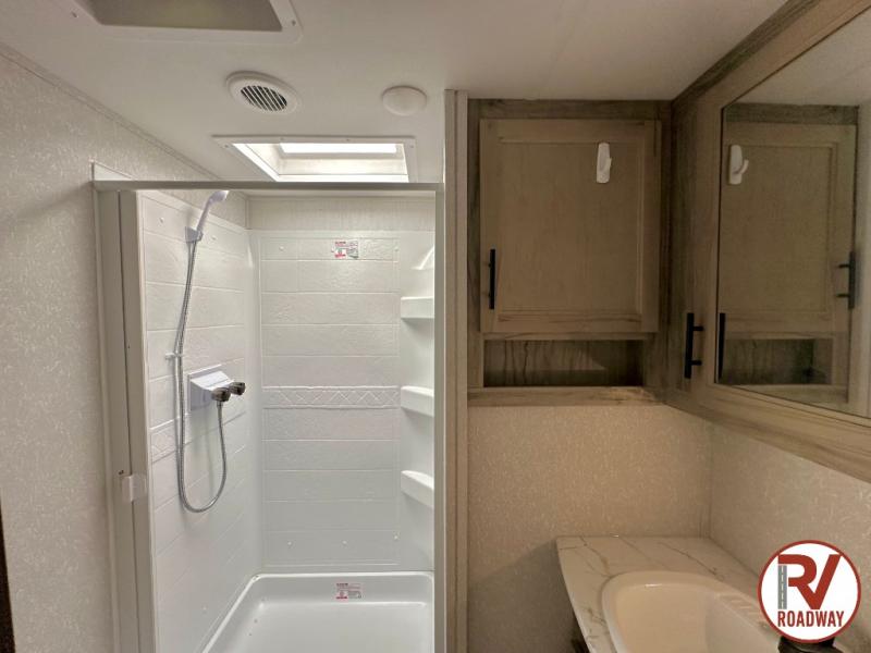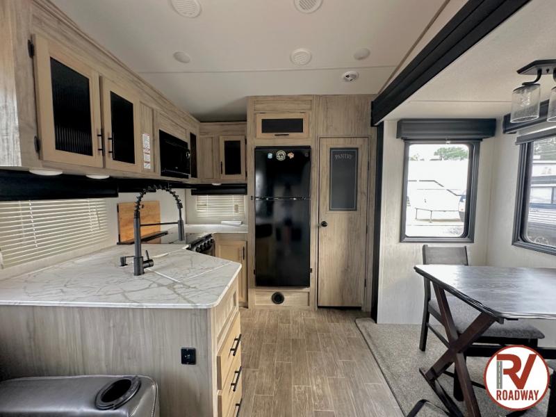 Are you interested in taking your camping game up a notch? If so, you'll certainly want to add this Cherokee Arctic Wolf fifth wheel to the roster! For a romantic getaway or guys' party weekend, this fifth wheel is 100% accommodating. Up at the front of this unit is a private bedroom where you will find great relaxation on the residential queen bed. Right next to the bedroom is a full bathroom that has everything you need to get ready like a pro each morning. The main living area is the big attraction on this unit because it is perfectly set up for lounging at your best. The home theater seating is across from the fireplace, and above the fireplace is an area prepped for a TV. You'll find a free-standing table with two fixed chairs and two folding chairs right next to the rear kitchen, so you can take in the sights and sounds of dinner being prepared as you socialize with the chef. Another great feature on this model is the entryway shoe storage and bench.