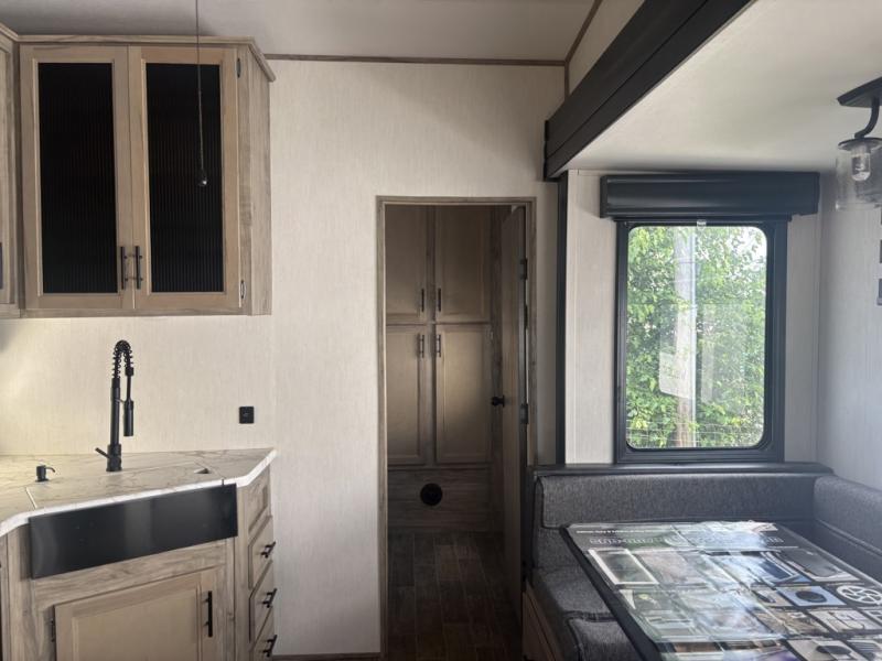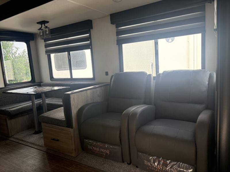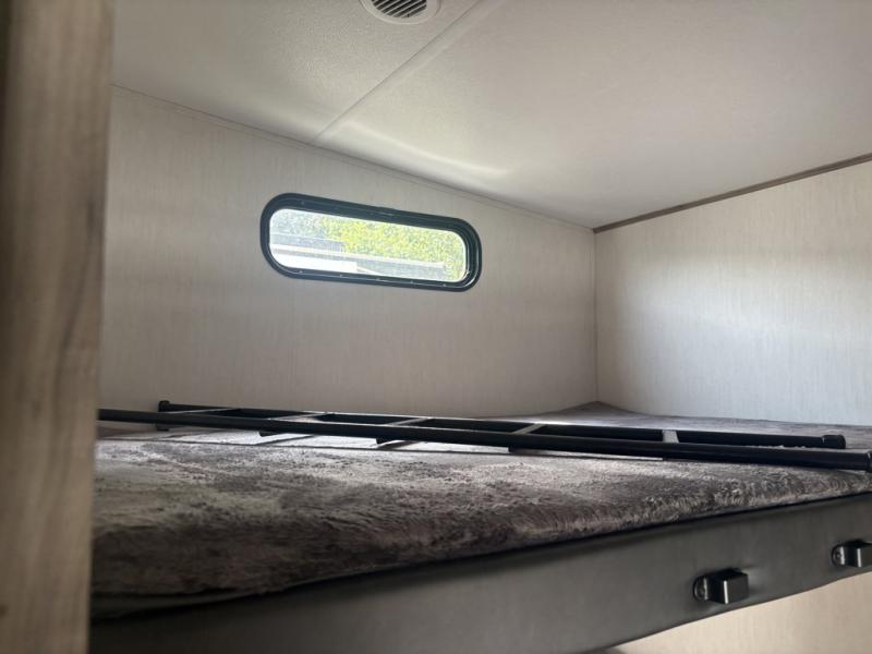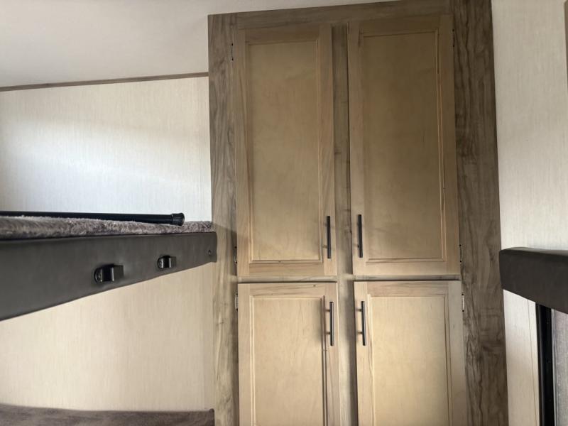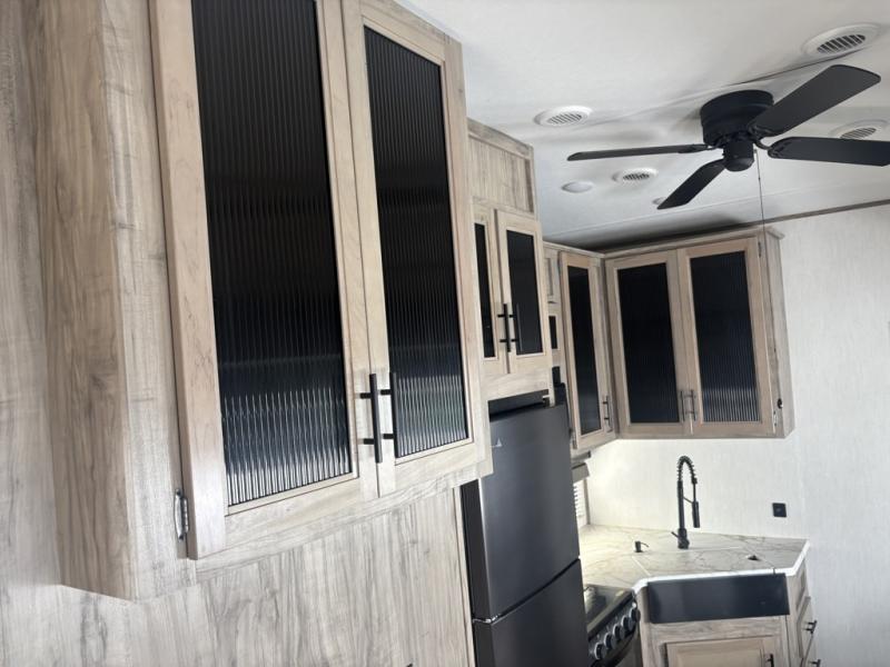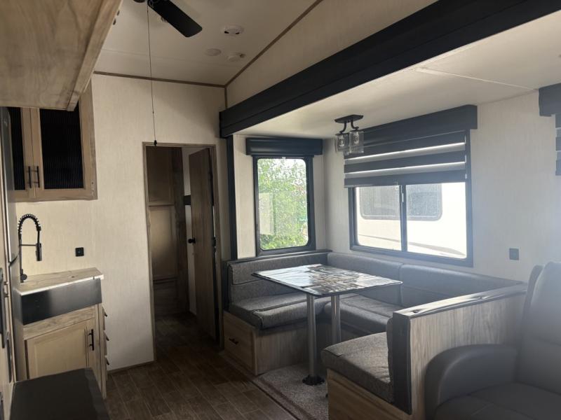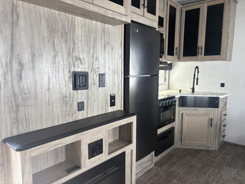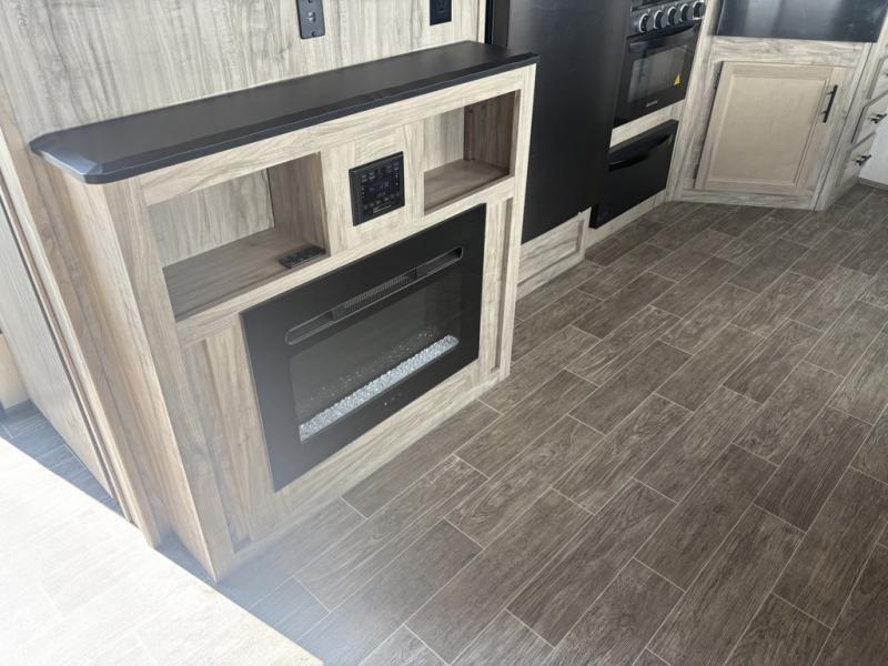 Let the fun times begin with the purchase of this Cherokee Arctic Wolf fifth wheel! You'll have loads of sleeping space for ten tired travelers with the front private bedroom, rear private bunkhouse, U-shaped dinette, and tri-fold sofa. You'll also have excellent storage space with the storage below the lower bunk in the bunkhouse, the large walk-in pantry next to the entry door, the 11-cubic foot residential refrigerator in the kitchen for your perishables, the under-bed storage and large wardrobe in the bedroom, and the exterior open pass-through storage. You'll also have a large slide in the main living area for more living space, and the ceiling fan will cool you down as you are relaxing. Or, if you need to heat things up a bit, you can just switch on the fireplace.