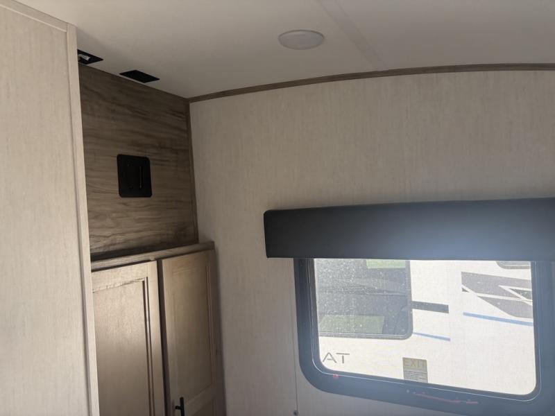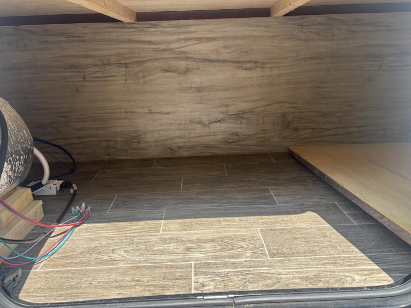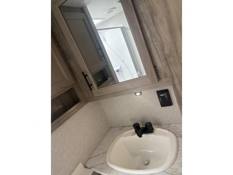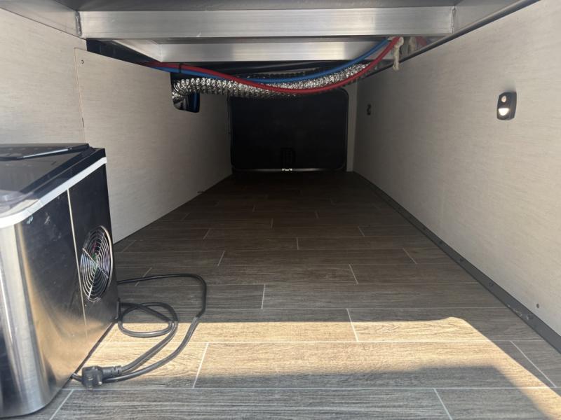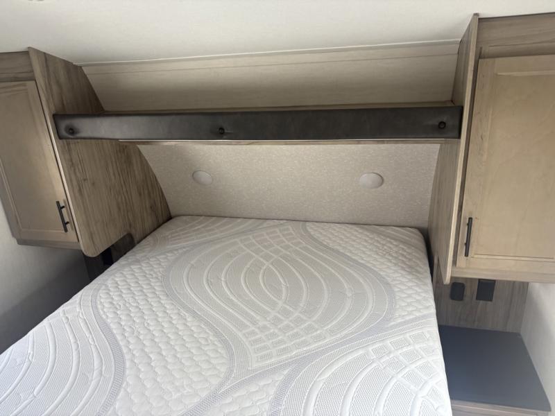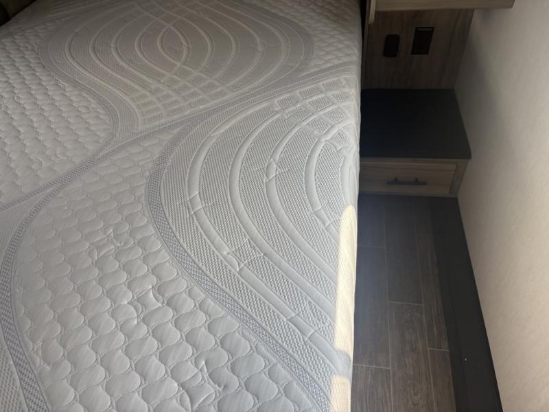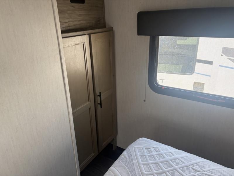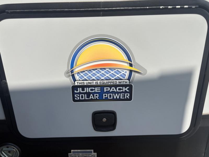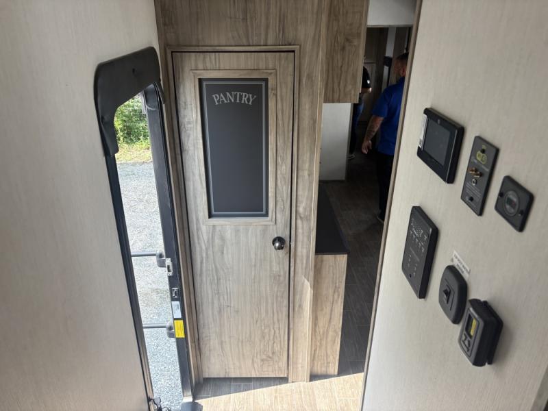 Let the fun times begin with the purchase of this Cherokee Arctic Wolf fifth wheel! You'll have loads of sleeping space for ten tired travelers with the front private bedroom, rear private bunkhouse, U-shaped dinette, and tri-fold sofa. You'll also have excellent storage space with the storage below the lower bunk in the bunkhouse, the large walk-in pantry next to the entry door, the 11-cubic foot residential refrigerator in the kitchen for your perishables, the under-bed storage and large wardrobe in the bedroom, and the exterior open pass-through storage. You'll also have a large slide in the main living area for more living space, and the ceiling fan will cool you down as you are relaxing. Or, if you need to heat things up a bit, you can just switch on the fireplace.