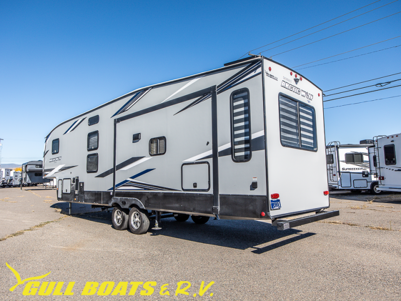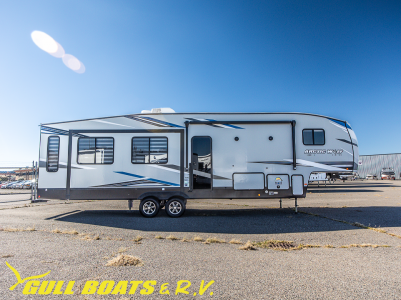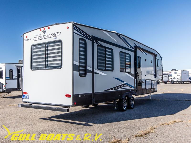 You'll have the very best time tackling outdoor adventures with the Forest River Cherokee Arctic Wolf fifth wheel! Each model has been constructed with a “ToughBend” rigid skirt metal design, Leash Latch pet safety technology, an outside shower with hot/cold water, a 1x engineered wood “SuperTruss” roof structure with 3/8" decking, and aluminum rims. The interior offers you a dual-zone Bluetooth stereo optimized for USB flash drives, iPods, and other MP3 players, and you'll find motion-sensor lighting to help you see when it's dark. There is an interior-mounted “My RV” control pad diagnostic and auto level control pad as well as a smart monitor panel with smart phone Bluetooth connectivity. These models have been prepped for a second air conditioner, and they have also been prepped for a bumper-mount swing-arm grill.