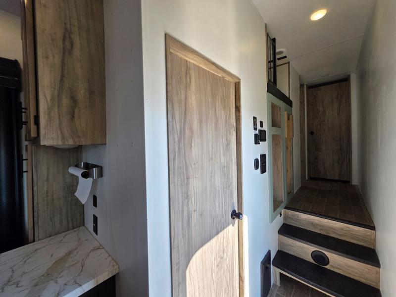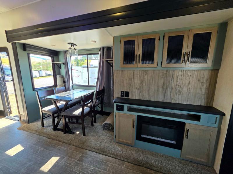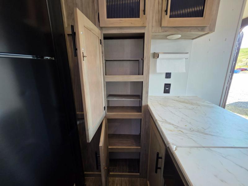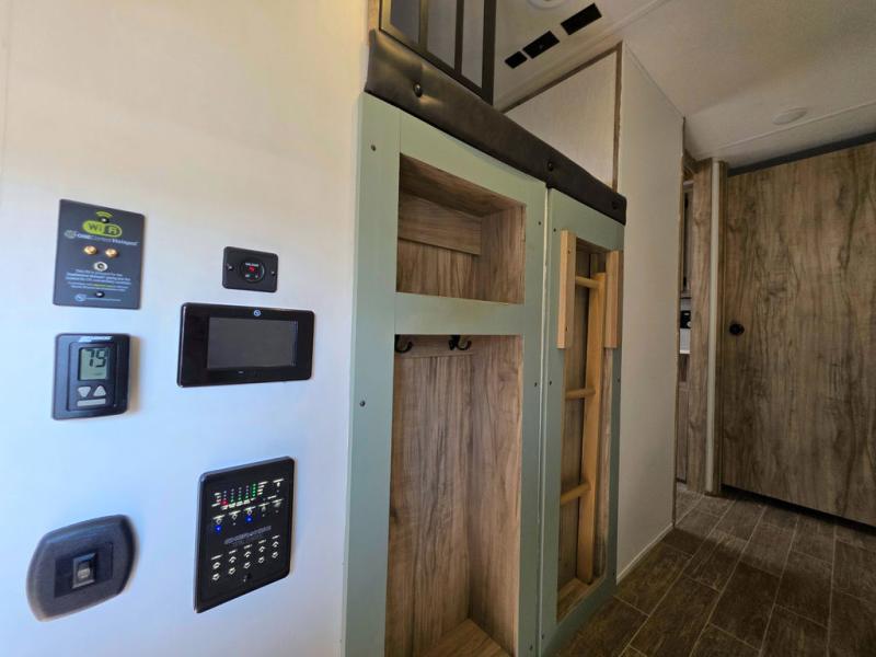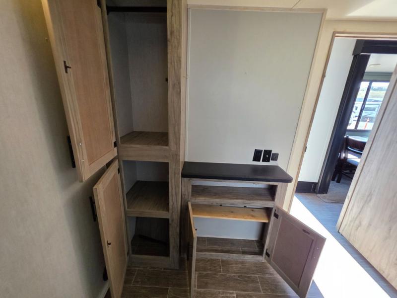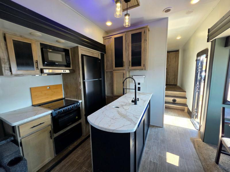 You have excellent sleeping accommodations on this Cherokee Arctic Wolf Suite fifth wheel! There is a private bedroom with a king-size bed at the front for you, and the second bedroom contains a flip-up bunk and tri-fold sofa for any kids or friends you have traveling with you. But it doesn't stop there. There is also a loft above the bunk room and a tri-fold sofa in the living area that you can use as a sleeping space. The kitchen is ready for you to make meals on the three-burner range, and you can work freely around the peninsula countertop. The ceiling fan will cool this area down if it gets too hot while you're cooking, and you can eat your meals at the table with two fixed/two folding chairs. When you enter this unit, you'll also appreciate having a coat drop zone and shoe storage to keep your belongings tidy.
