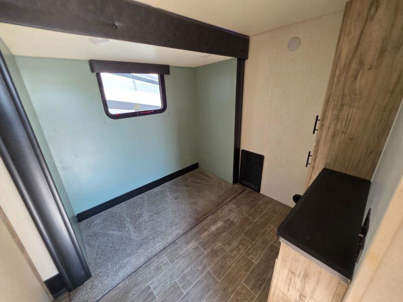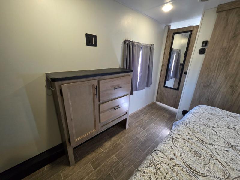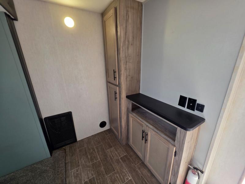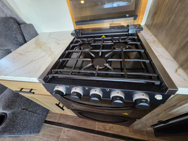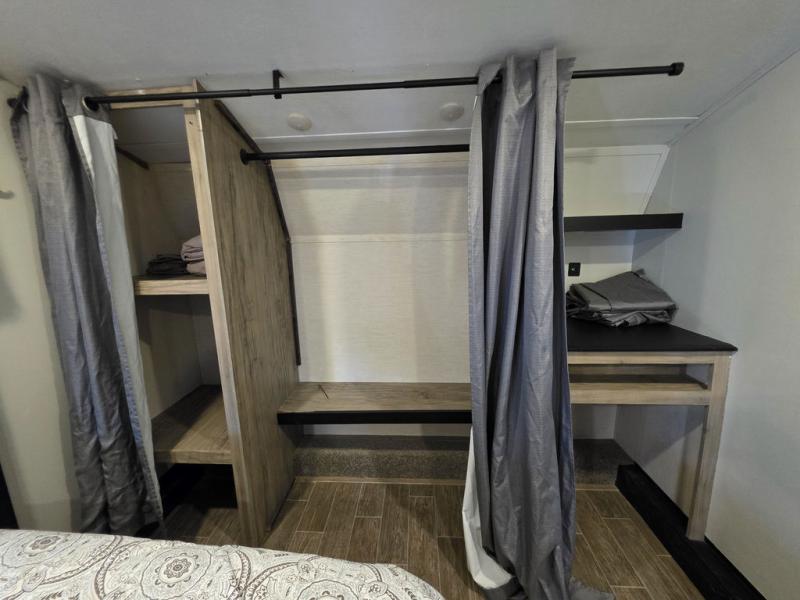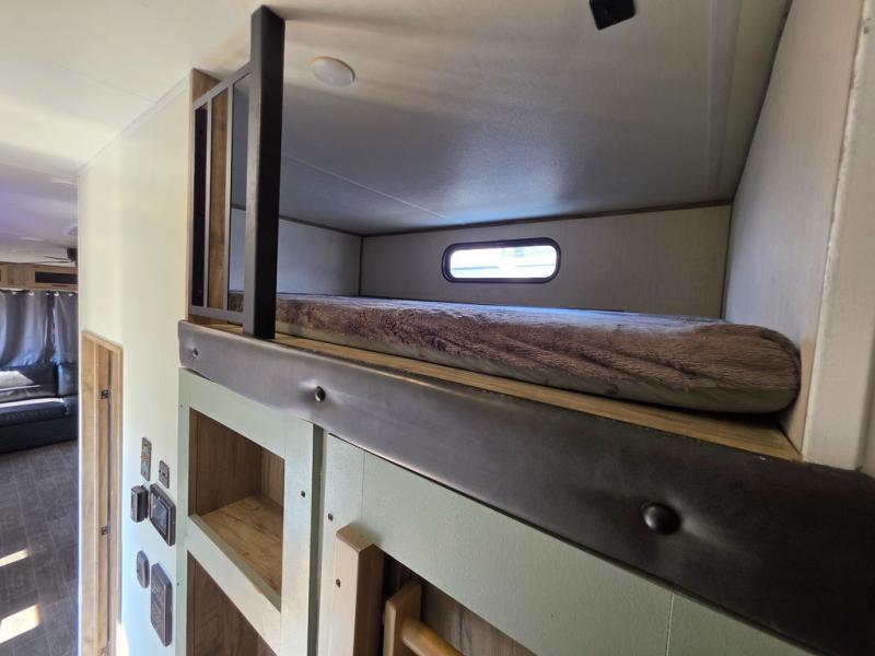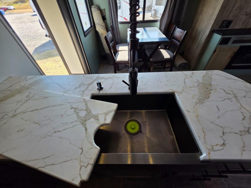 You have excellent sleeping accommodations on this Cherokee Arctic Wolf Suite fifth wheel! There is a private bedroom with a king-size bed at the front for you, and the second bedroom contains a flip-up bunk and tri-fold sofa for any kids or friends you have traveling with you. But it doesn't stop there. There is also a loft above the bunk room and a tri-fold sofa in the living area that you can use as a sleeping space. The kitchen is ready for you to make meals on the three-burner range, and you can work freely around the peninsula countertop. The ceiling fan will cool this area down if it gets too hot while you're cooking, and you can eat your meals at the table with two fixed/two folding chairs. When you enter this unit, you'll also appreciate having a coat drop zone and shoe storage to keep your belongings tidy.